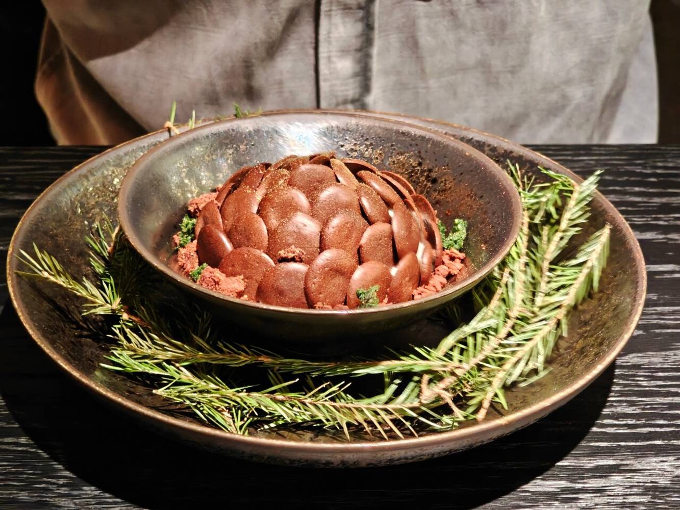 Гостям подают тартар из говядины с черемшой, рибай на кости, кролика в печи и мороженое из ряженки, но главный акцент — на деталях. Например, десерты подают в виде кедровых шишек или лежащих в гнезде яиц.