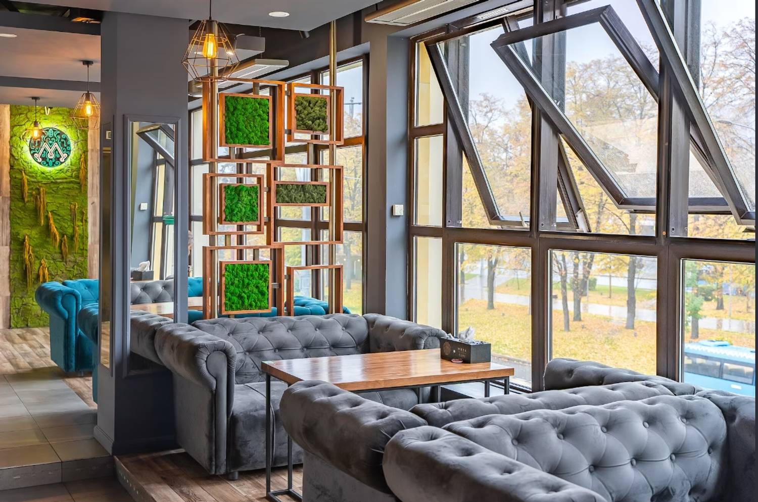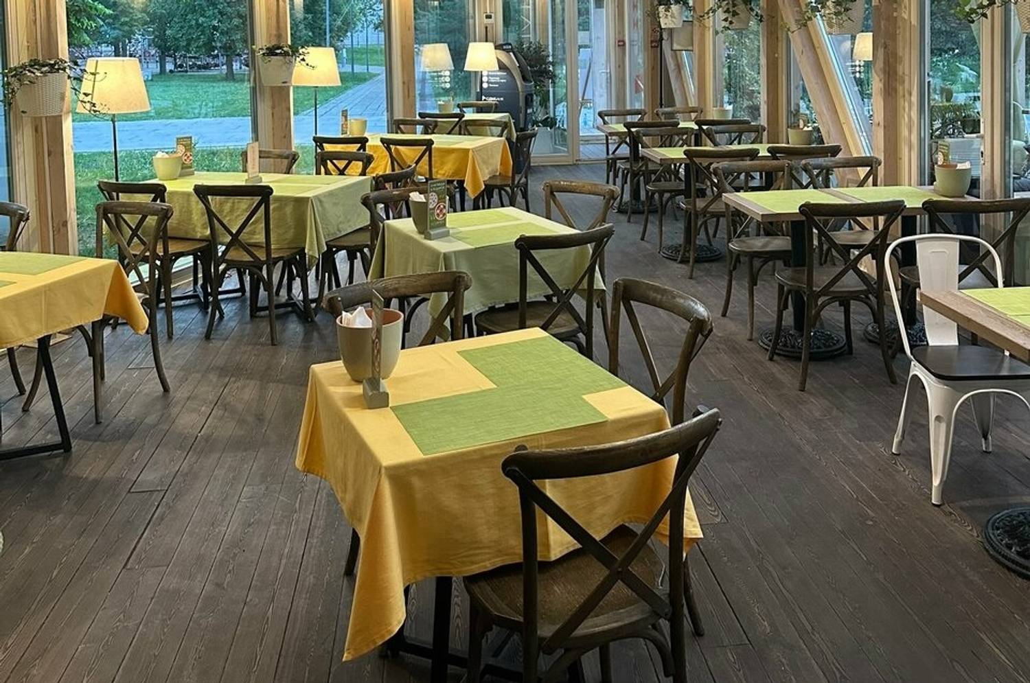 Семейный ресторан, который расположен на территории парка. В дизайне сделали акцент на светлых тонах с обилием зелени и панорамных окнах. Летом гости могут отдохнуть на веранде.