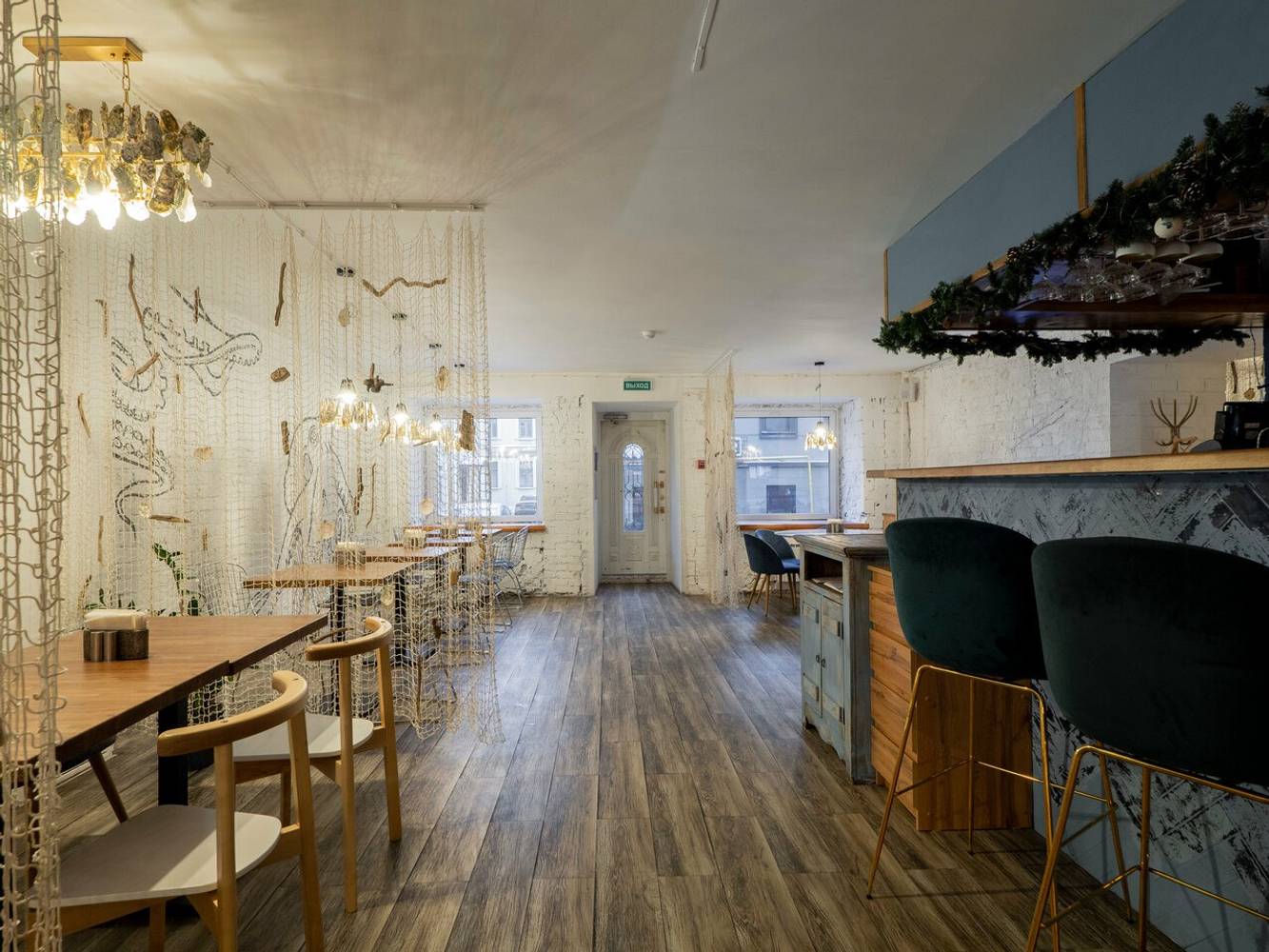 Гастропроект с морскими мотивами вроде перегородок с рыболовными сетями и рисунками рыб на стенах. Обстановку приморского дома дополняют стулья в сетчатом стиле и украшения из ракушек.