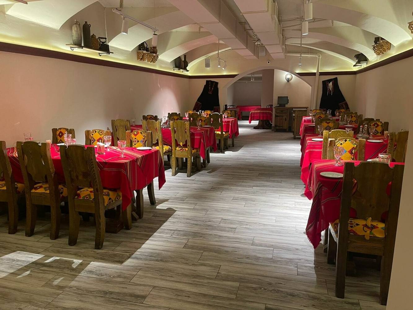 Тут вы словно отправляетесь в путешествие в солнечную болгарскую деревню. Дизайн в ярких оттенках с красными скатертями, коврами, деревянными стульями с желтыми расписными спинками. На полках белая посуда, а на стенах куклы из ниток, зеркала в широких деревянных рамах и национальные костюмы.
