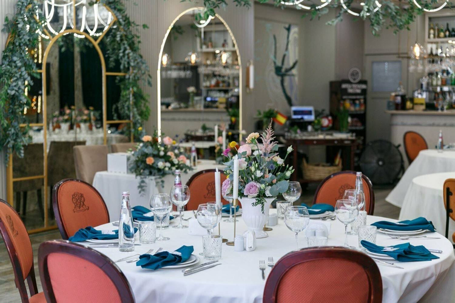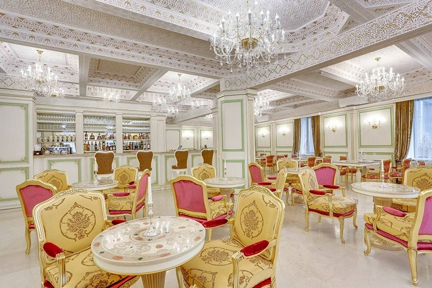 Это ресторан в аристократическом стиле вдохновлен эстетикой позапрошлого столетия. Тут вы оказываетесь в особняке с хрустальными люстрами, белоснежными потолками с узорами и лепниной. Завершают образ исторической гостиной элегантные стулья с алыми спинками и золотистыми ручками.