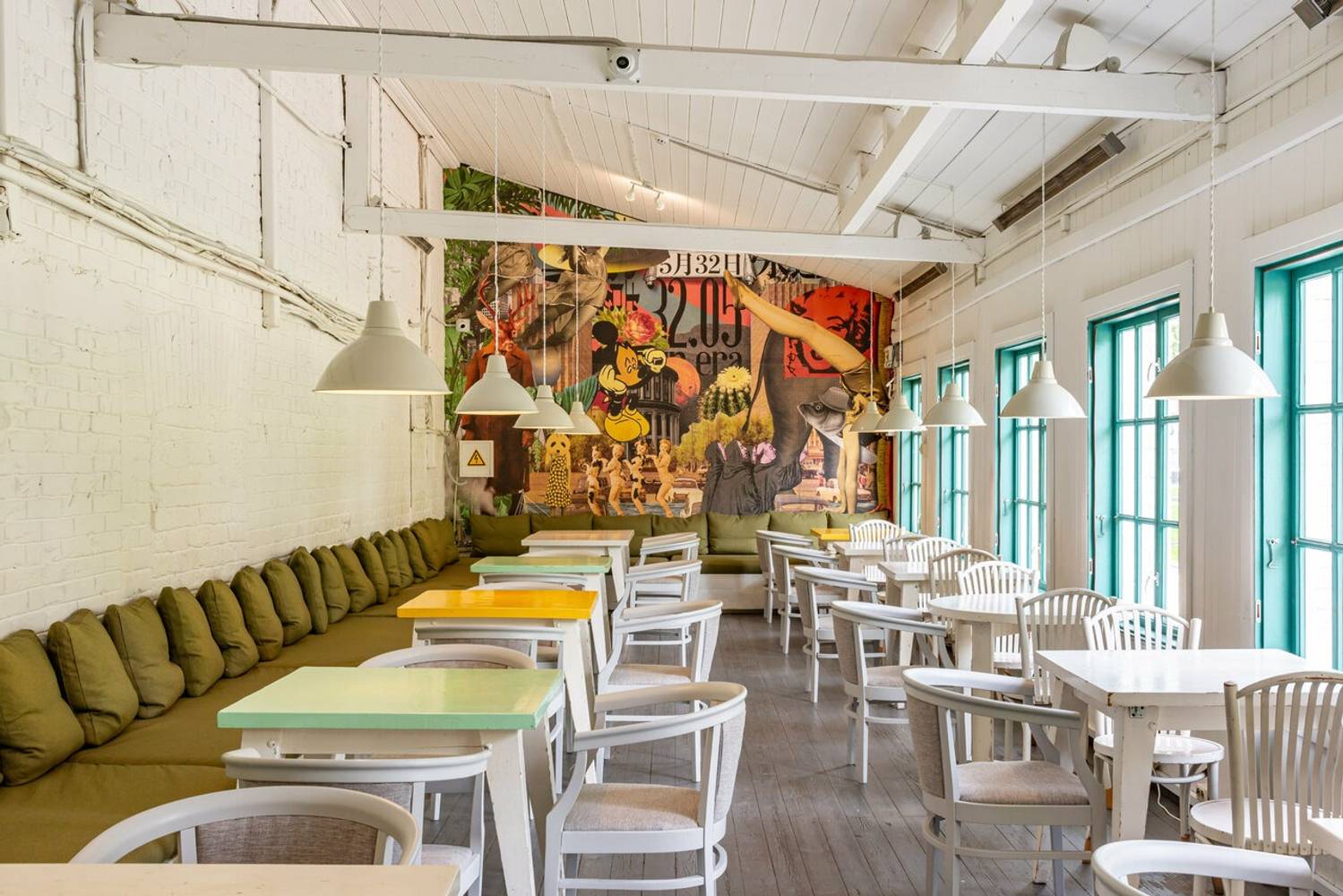 Это место напоминает дачу с оранжереями, шезлонгами и открытыми летними террасами. Внутри несколько залов: от светлого со сценой, богемного лаунжа с диджейской стойкой до каминного в стилистике Дэвида Линча. Пространство оживляют 26 окон с видом на сад, яркие гирлянды и стена с коллажем из ярких рисунков.