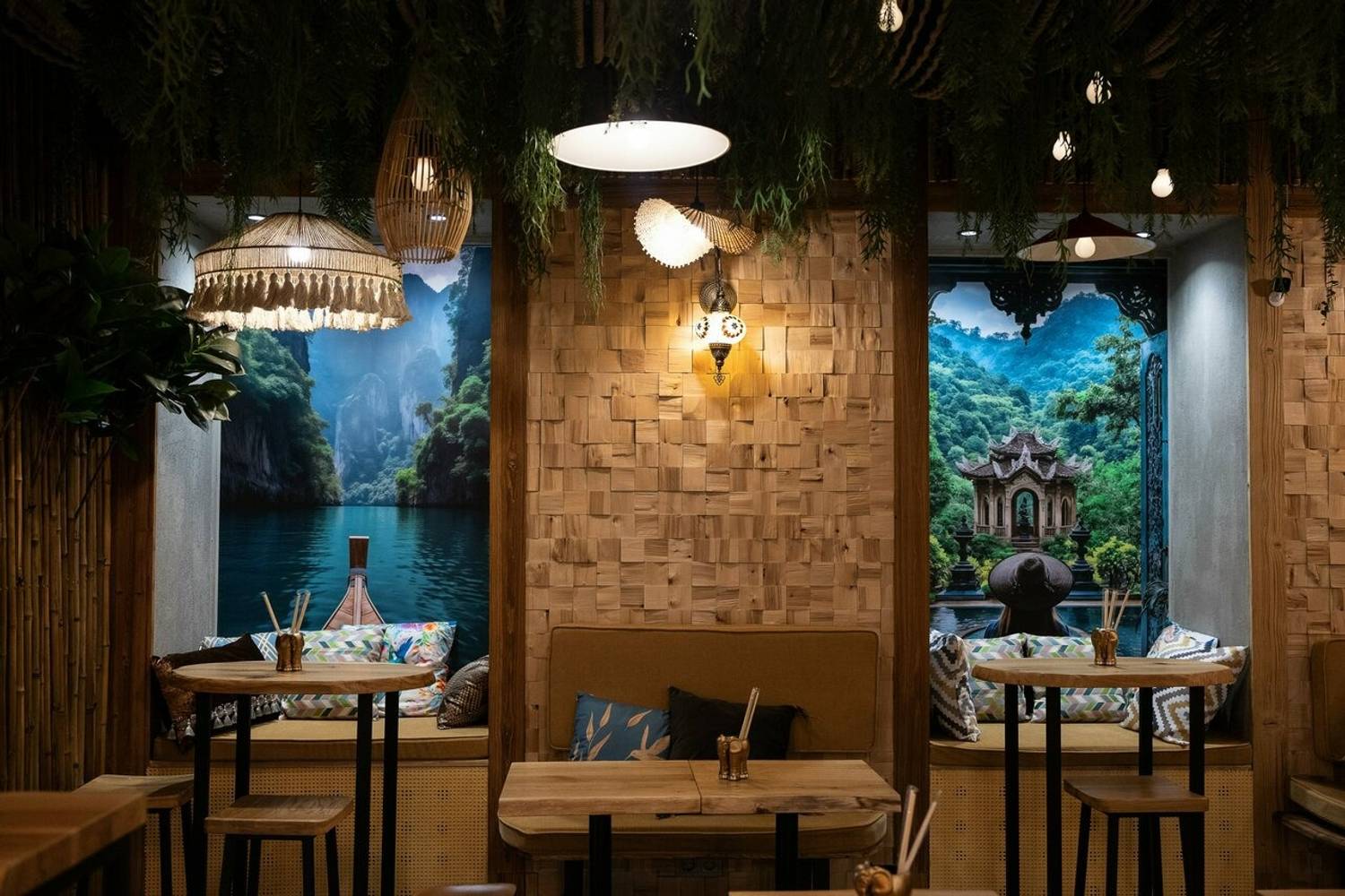 Азиатский гастробар передает атмосферу тайского курорта с бамбуковым декором и плетеными люстрами. Тропический уют чувствуется в каждой детали: от декора в виде слонов на стенах до тайских пейзажей и рисунка повара в очках.