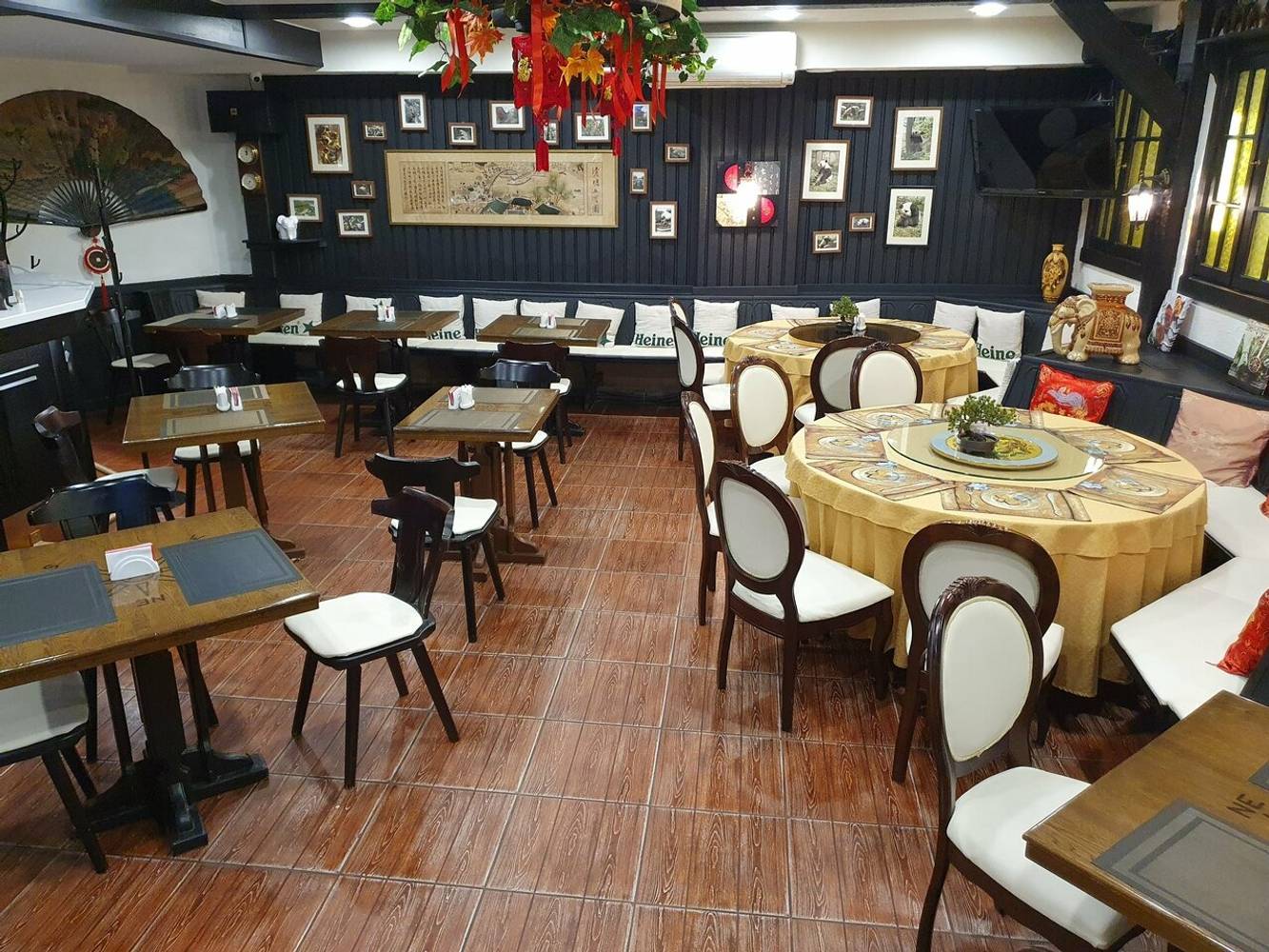 Интерьер здесь — это сочетание восточных традиций и морской тематики. Внутри элегантный черно-белый стиль с витражными окнами, большим веером на стене и фигурками слонов. Атмосферу китайской культуры дополняют красные фонари.