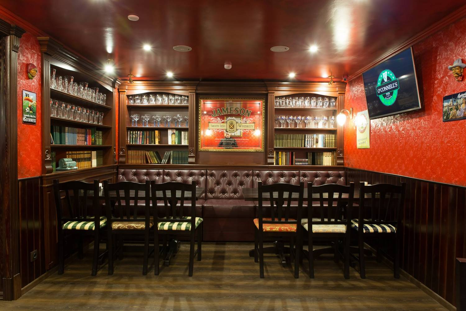 Ирландский паб в классическом стиле. Залов несколько: барный с массивной стойкой и аквариумом, библиотека в красных тонах с книжками, концертный с барабанными установками.
