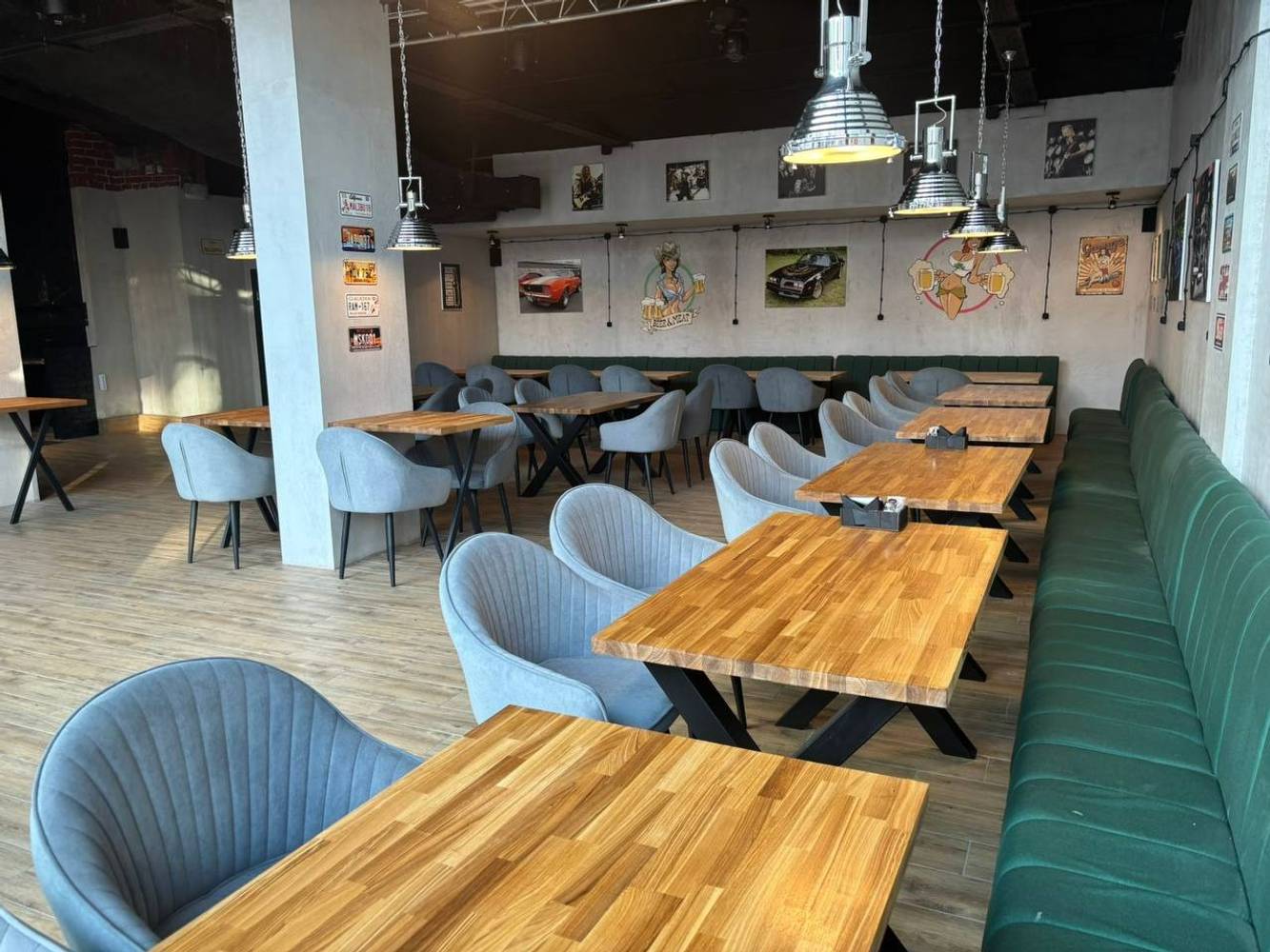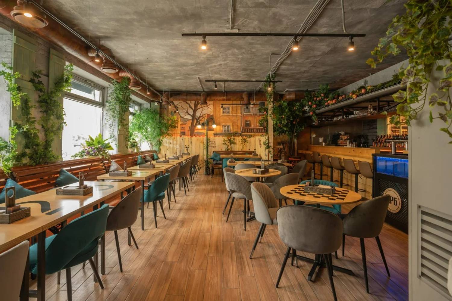 Дизайн простой: матовые серые и кирпичные стены, светло-деревянные стулья, стеллажи с растениями в кадках. В ресторане есть развлечения на любой вкус, включая шахматы, нарды, PlayStation.