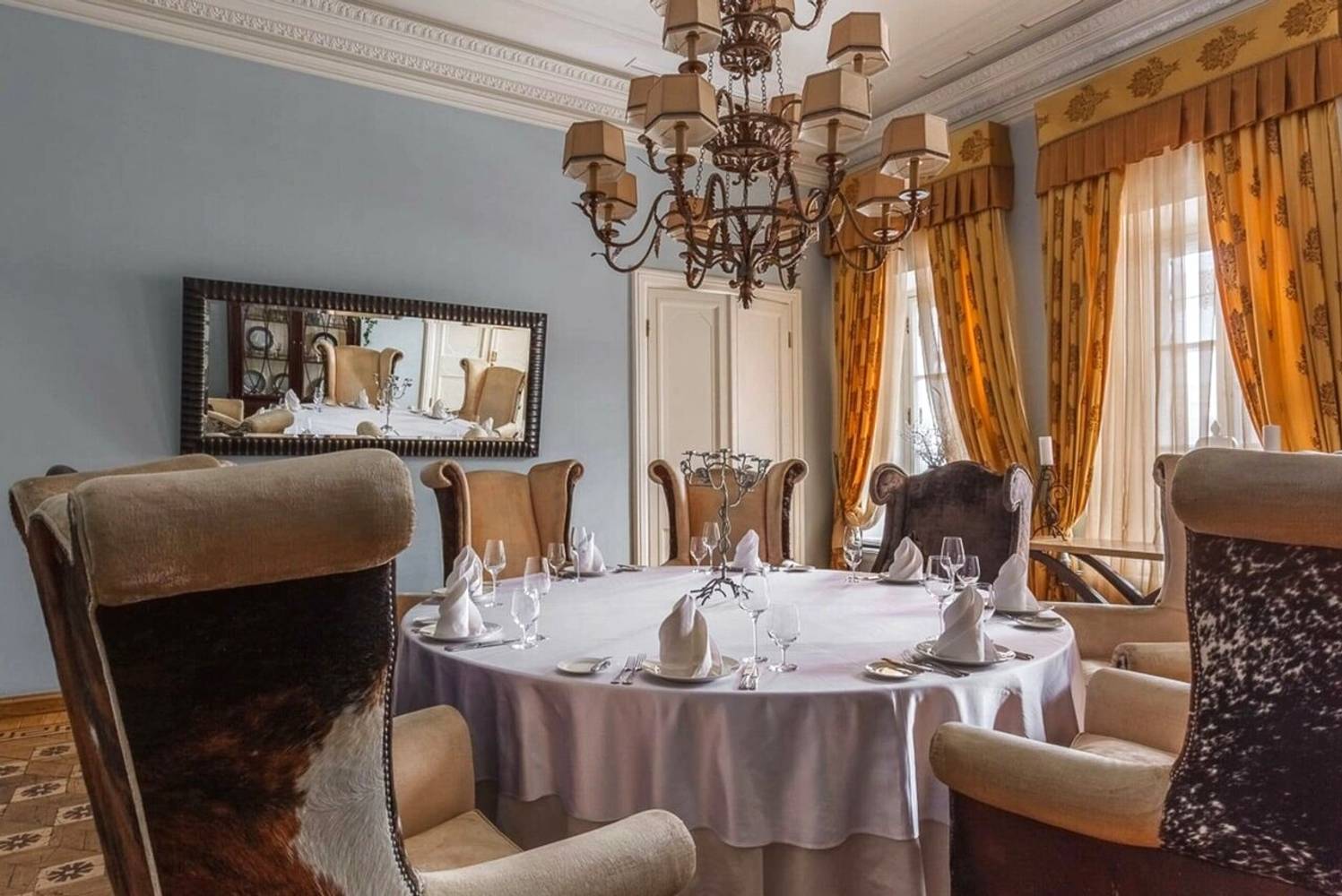 В меню — авторская интерпретация русской кухни. Здесь готовят оливье с мясом перепелов, фаршированную утку, стерлядь на картофельном пюре и заячий паштет. К еде предлагают чай из самовара, настойки, хреновуху и вина из обширной винной карты.