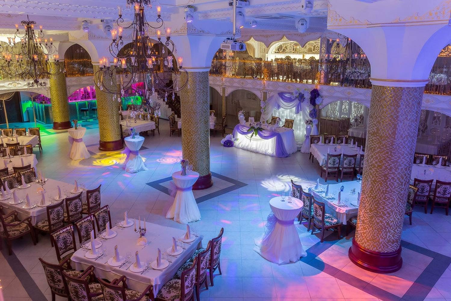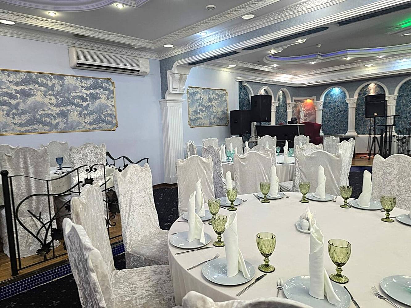 Просторный ресторан восточной и европейской кухни на Коломенской. Интерьер с белыми колоннами, арочными нишами, восточными орнаментами и синими шторами создает праздничную, немного сказочную атмосферу. Зал рассчитан до 150 гостей, и в нем есть все необходимое для проведения свадьбы: музыкальная аппаратура, проектор, свет.