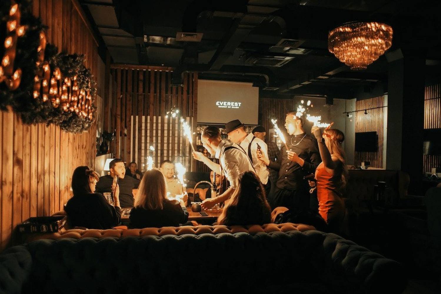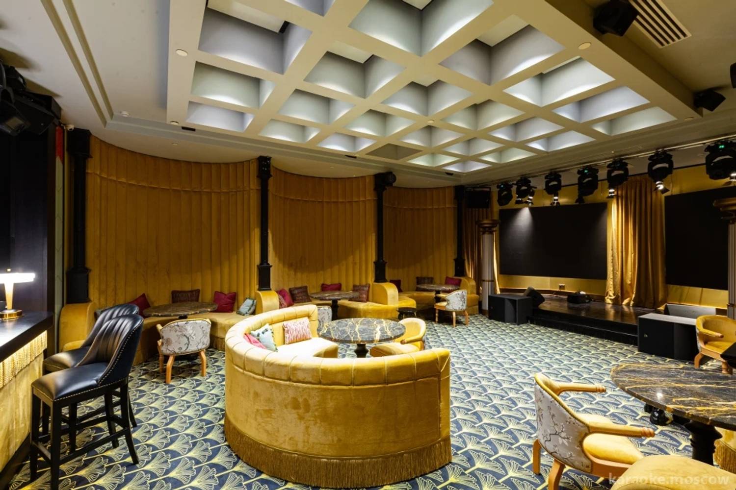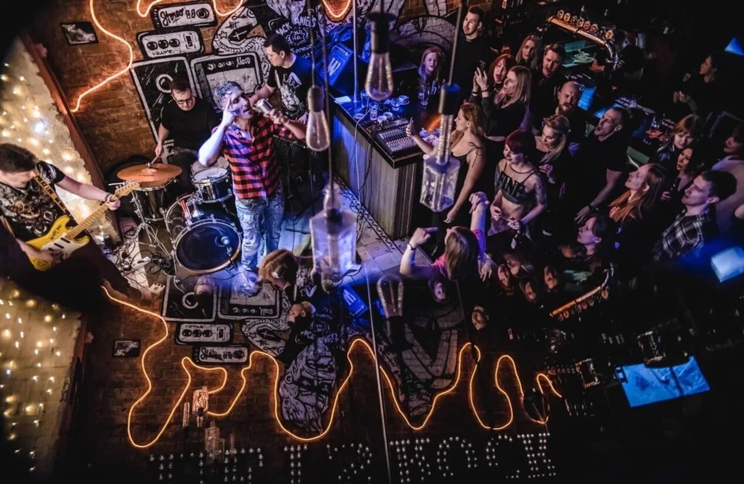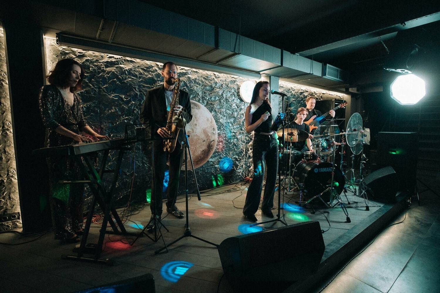 Бар-ресторан с необычной космической сценой, где регулярно проходят музыкальные концерты и стендап-вечера. Интерьер сочетает лофтовые элементы с мягкими диванами и приглушенным светом, а главной изюминкой стала сцена, оформленная как космическая станция с проекциями планет.