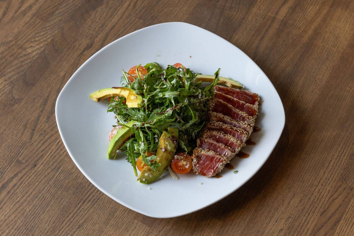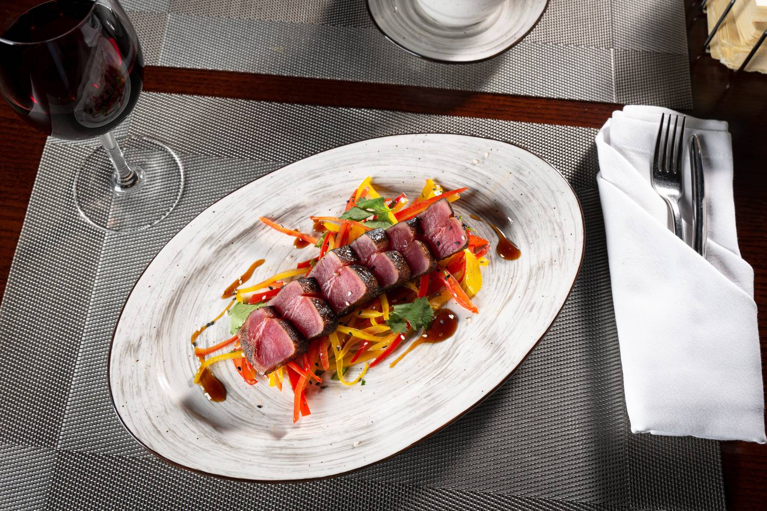 В интерьере двухуровневого ресторана прослеживаются этнические мотивы: красные люстры, колонны из каменных блоков, дерево в центре зала, панели с золотыми колосьями. На горячее готовят знакомые блюда на гриле, включая стейк-бавет, стриплойн, рибай, New York. Помимо этого есть несколько видов бургера с сочным мясом: говядиной, цыпленком и мраморным ребром.
