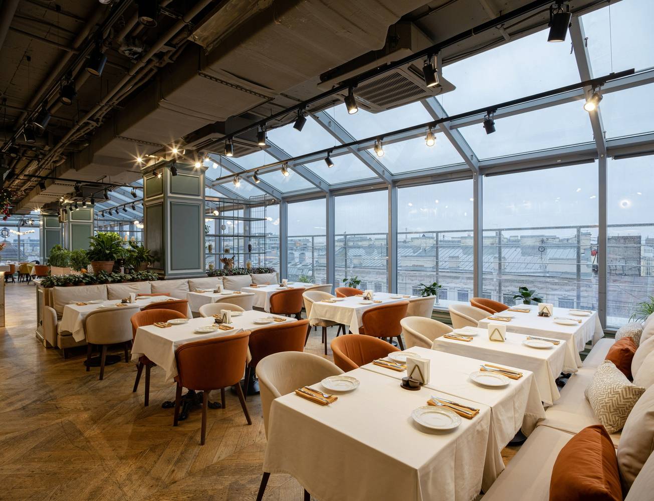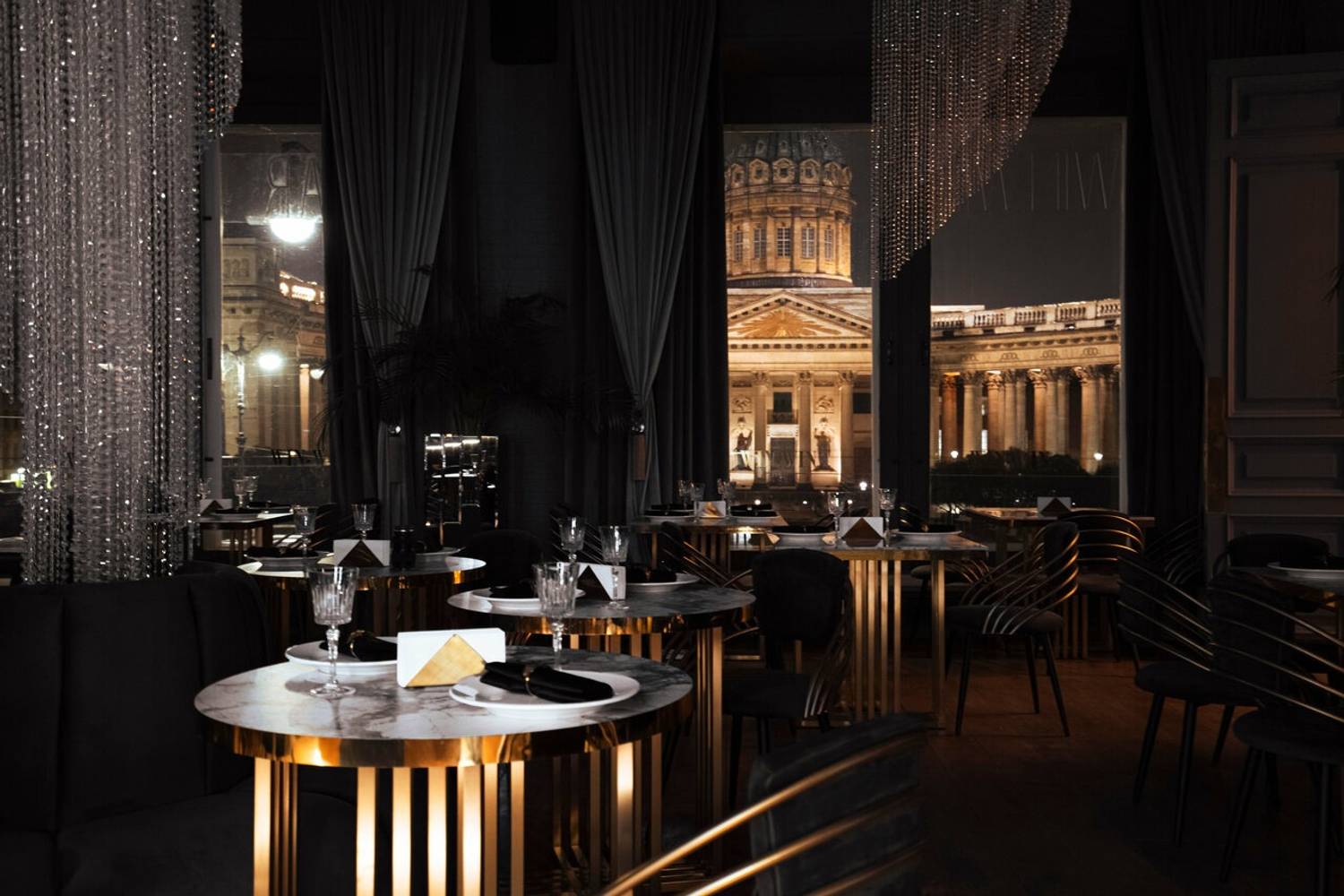 У этого видового ресторана в визитной карточке два вида: на Казанский собор и интерьер в стиле модерн-классик с блестящими люстрами в пол. Элегантности придают мраморные столы и подсвеченные колонны. На кухне под руководством шефа Никиты Сечина готовят тыквенный крем-суп с пряником и страчателлой, ролл с гребешком и трюфельным маслом и мальтальяти с томленой уткой и муссом пармезан. В дополнение подают белое, розовое и оранжевое вино, коктейли и крепкие напитки.