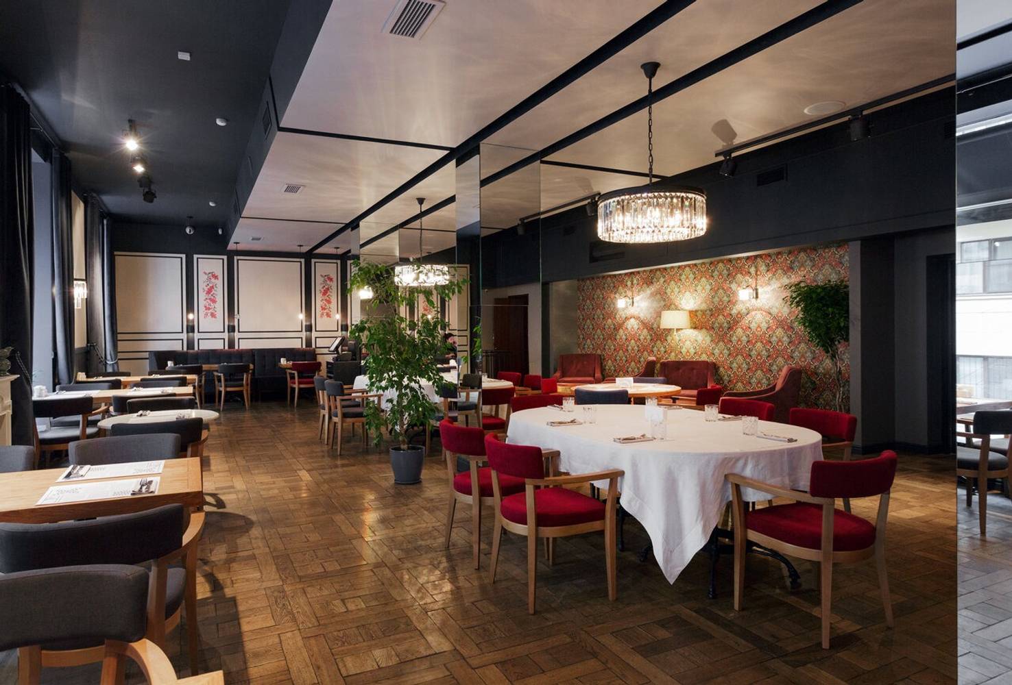 Это место напоминает русскую усадьбу в сдержанных тонах. Внутри отсылки к дегтярным баням, которые находятся недалеко от ресторана: приглушенный свет, стены с дровами и веники.