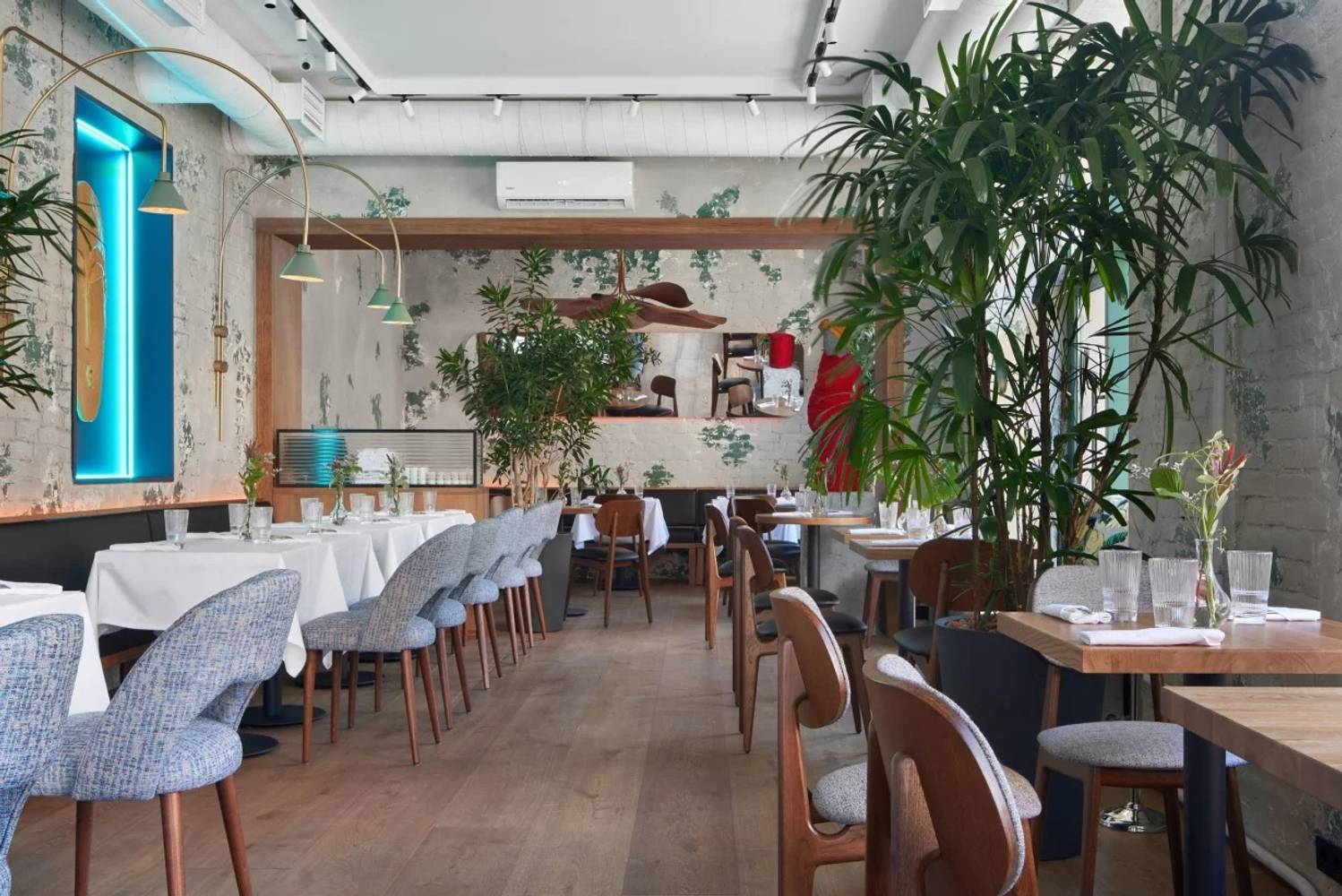 Гастропроект Антона Пинского с авокадо-культурой в центре города. Интерьер оформлен в зеленых оттенках, с высокими деревьями и ярким декором вроде манекенов в красном полотне и подушек с рисунками авокадо.