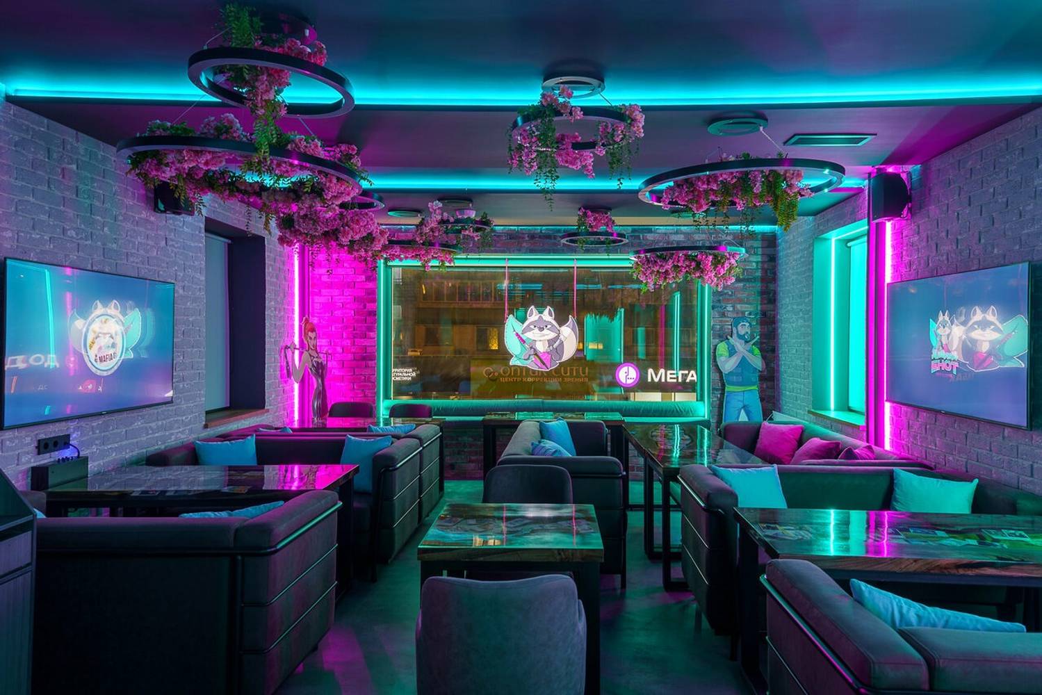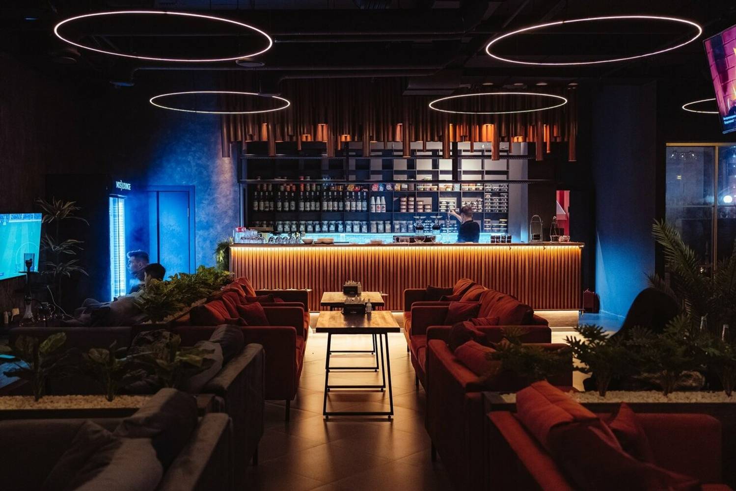 Минималистичный интерьер разбавлен неоновой подсветкой и живыми растениями, которые можно увидеть даже на барной стойке. Для душевных встреч с близкими есть VIP-комната с караоке и PlayStation 5.