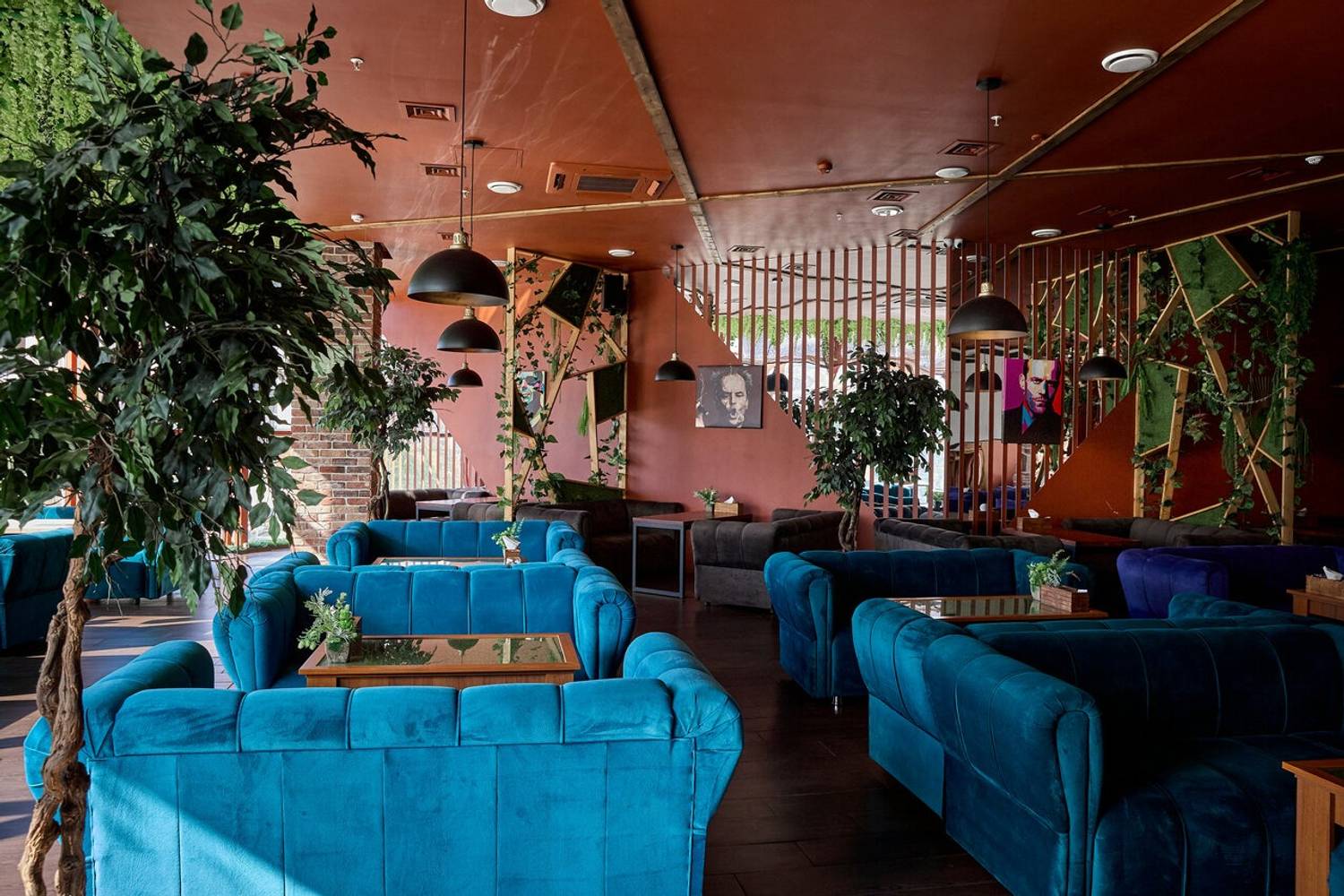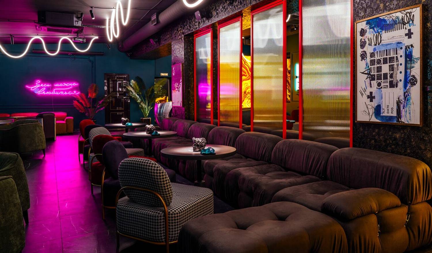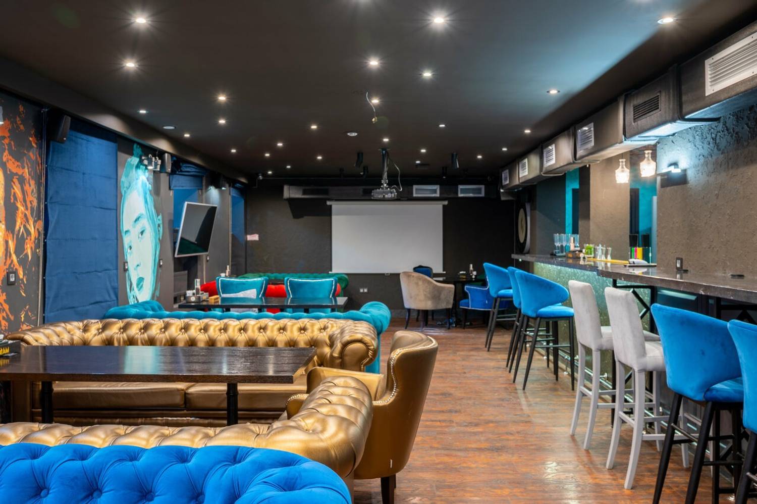 Пространство, где минимализм встречается с современным стилем. Золотые диваны и синие бархатные портьеры создают спокойный фон, а динамичные неоновые портреты на стенах будто заряжают зал энергией.