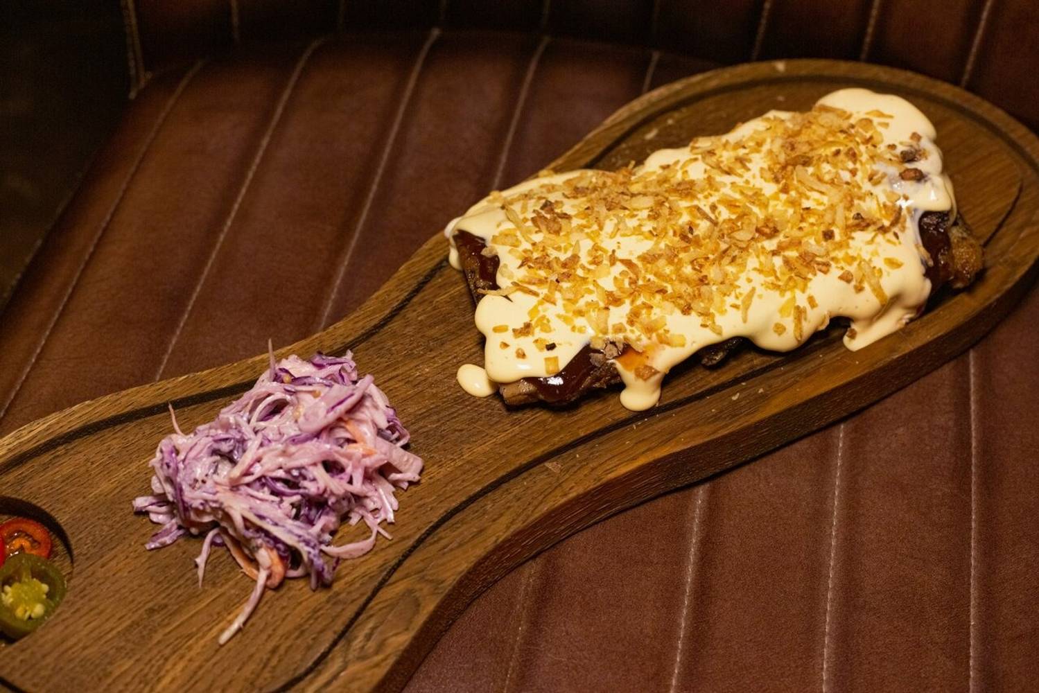 Акцент в меню сделали на мясе из печи: рулька, ребра и брискет с мятым картофелем. На компанию хорошей идеей будет взять сет из томленого мяса с тремя видами соуса. Также есть бургер с томленой курицей и тако с брискетом. Напитки варьируются от пива на кранах до апельсинового фреша и крафтовых лимонадов.