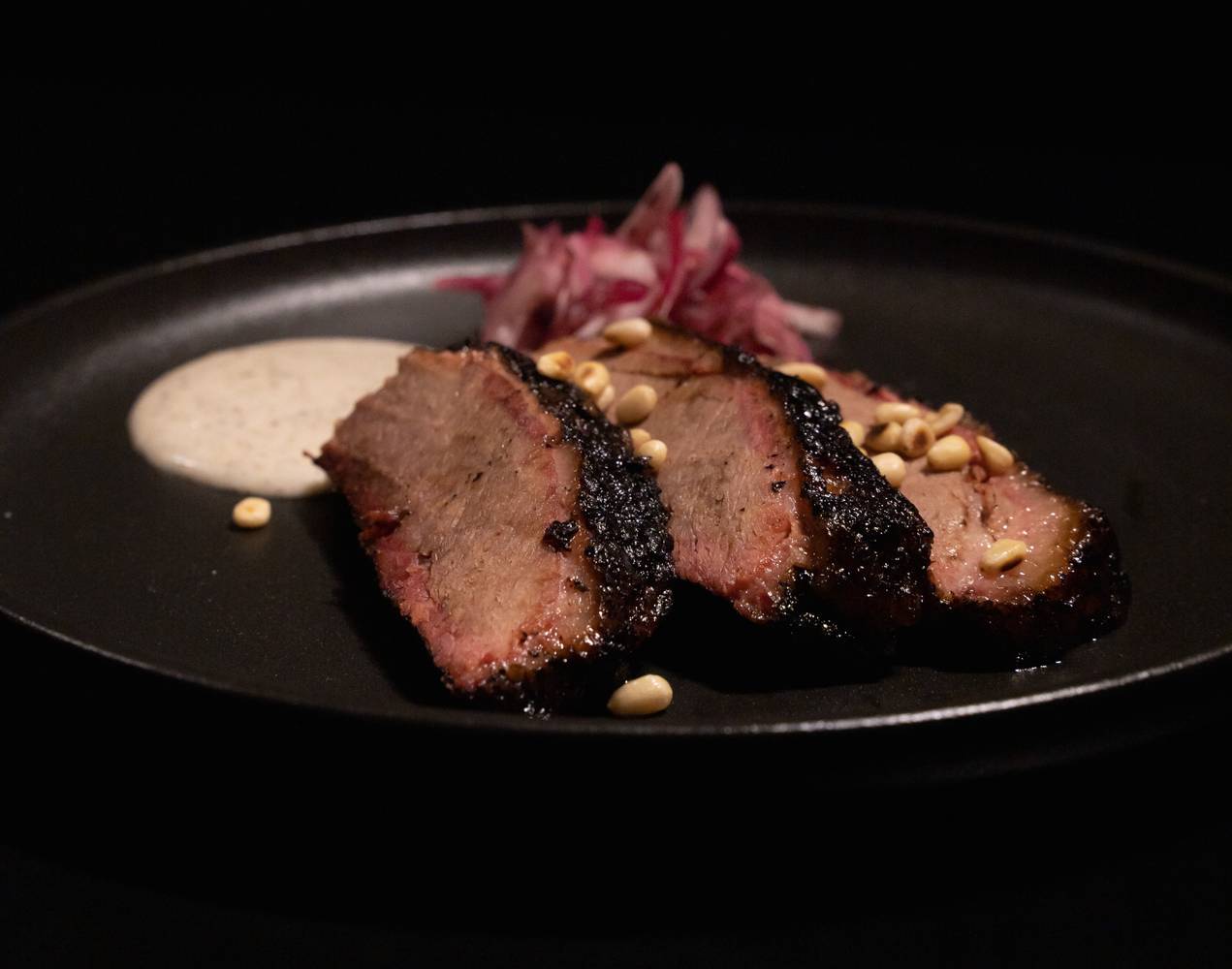 Этот мясной ресторан в Санкт-Петербурге выделяется оригинальным интерьером. Темные стены и мебель, кирпичная кладка и хрустальные люстры создают камерную атмосферу, которую оживляют акценты в виде красных стульев и ярких оконных рам. Блюда подают в стиле заведения — в черной матовой посуде.