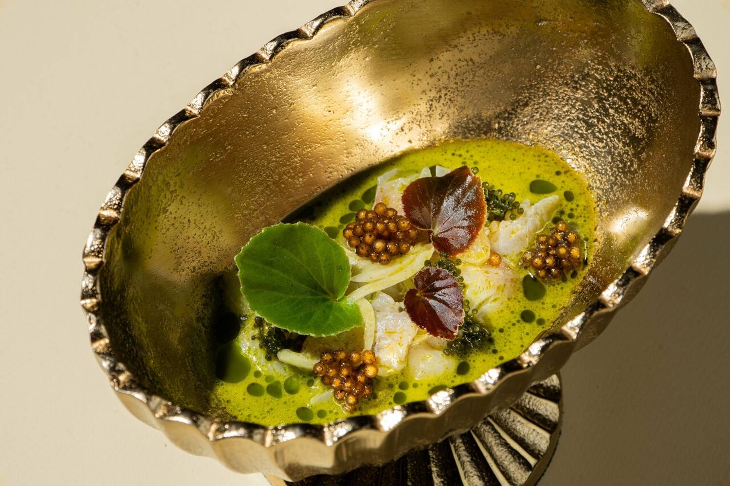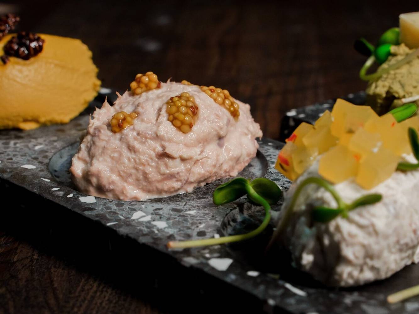 Главное блюдо в меню — мидии с тремя видами соусов: сливочный с горгонзолой и абрикосом, кокосовый том ям и томатный с козьим сыром. Также из аквариума подают устрицы, морских ежей и сахалинских моллюсков спизула. Из стартеров советуем калининградскую строганину или севиче из форели с клубникой. На горячее можно заказать ньокки с песто и креветками, краб-бургер или осьминога с печеной свеклой.