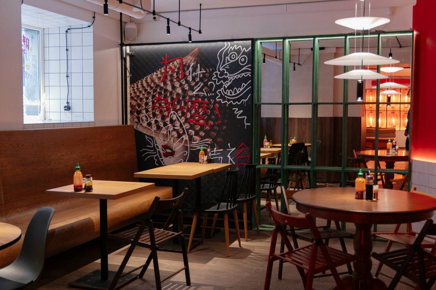 Красные фонари, картины и зонты с иероглифами — все детали передают традиционный китайский стиль. Интерьер кафе выполнен в светлых тонах с бежевыми стенами, а яркие детали добавляют красок и оживляют пространство.