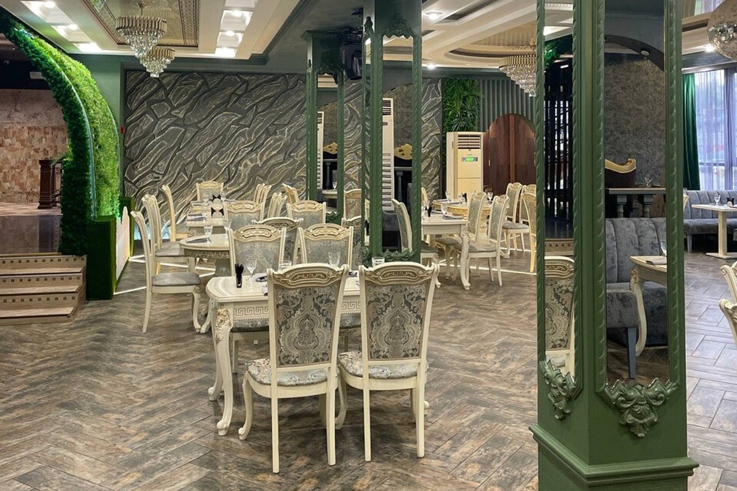 Просторный ресторан на Пионерской с колоннами под изумруд, хрустальными люстрами и белой лепниной на потолке.