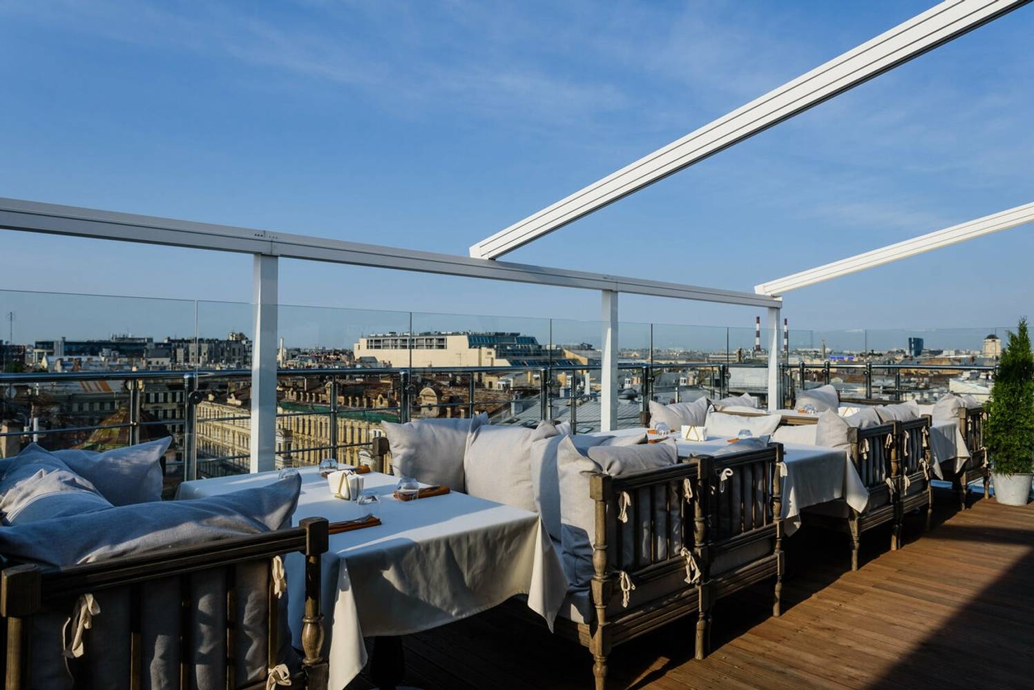 Панорамный ресторан на крыше с одним из лучших видов на город. Отсюда виден Исаакиевский собор, Дом Зингера и весь парадный силуэт центра. Кухня — европейская, с особым акцентом на морепродукты: сибас с лаймовым соусом, кальмар с имбирем и ананасом, нежные гребешки. Для тех, кто предпочитает мясо, есть томленый говяжий гуляш и утиная ножка конфи.
