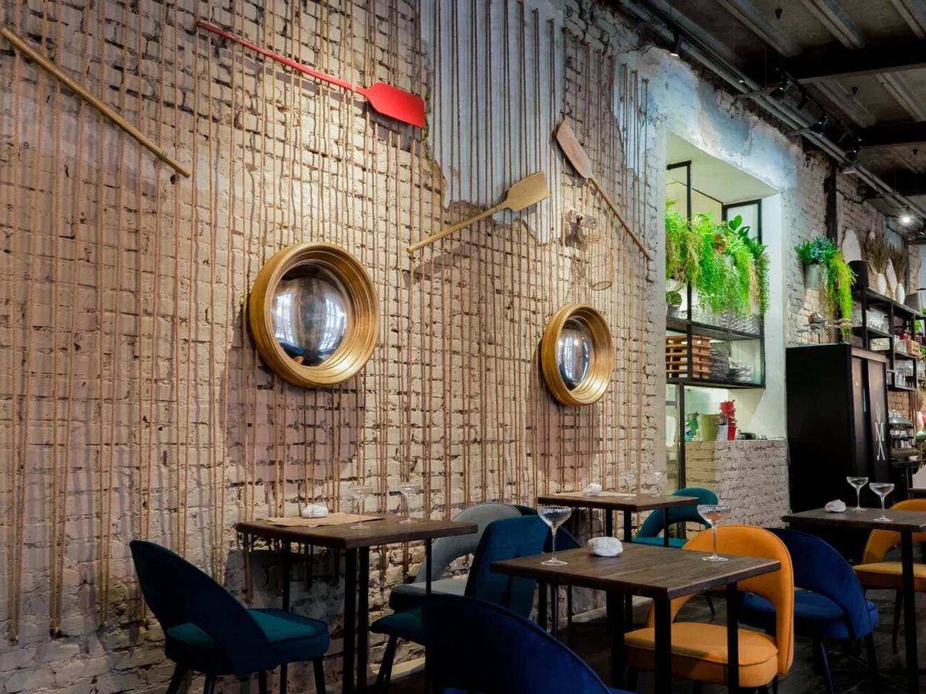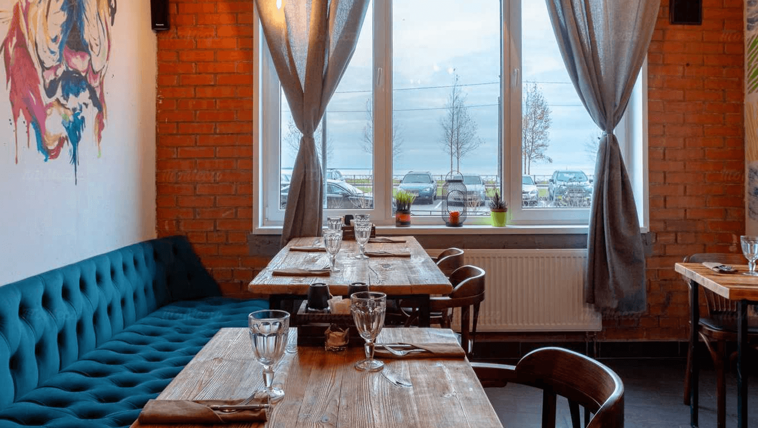 Это рестобар с видом на Финский залив в жилом комплексе «Паруса». Интерьер сочетает индустриальный стиль с уютом: деревянная барная стойка, кирпичные акценты и изумрудные диваны.