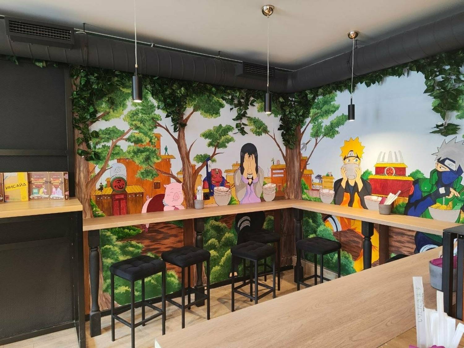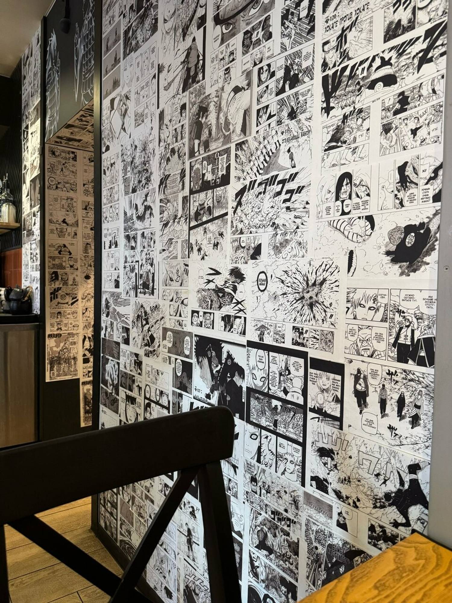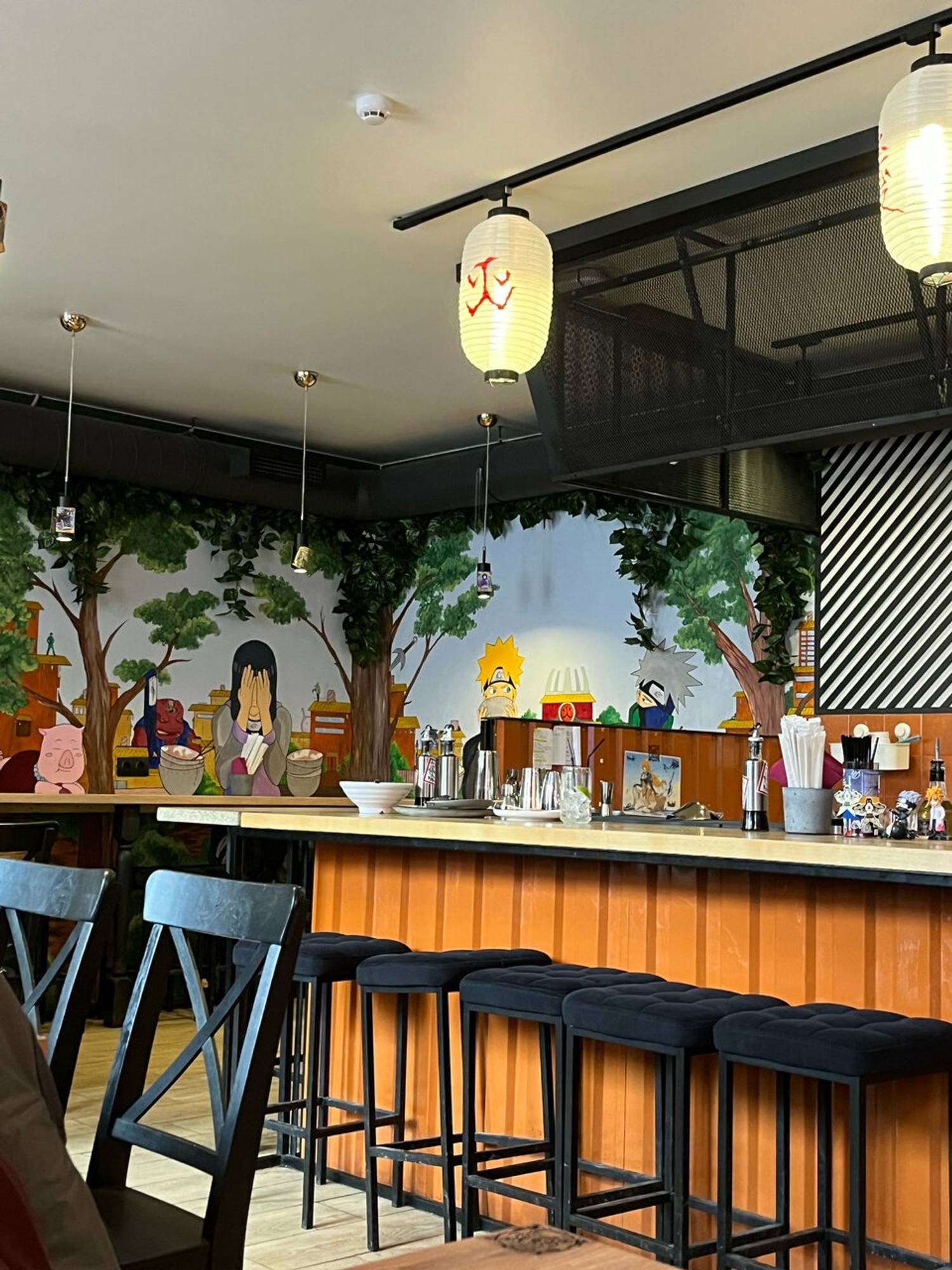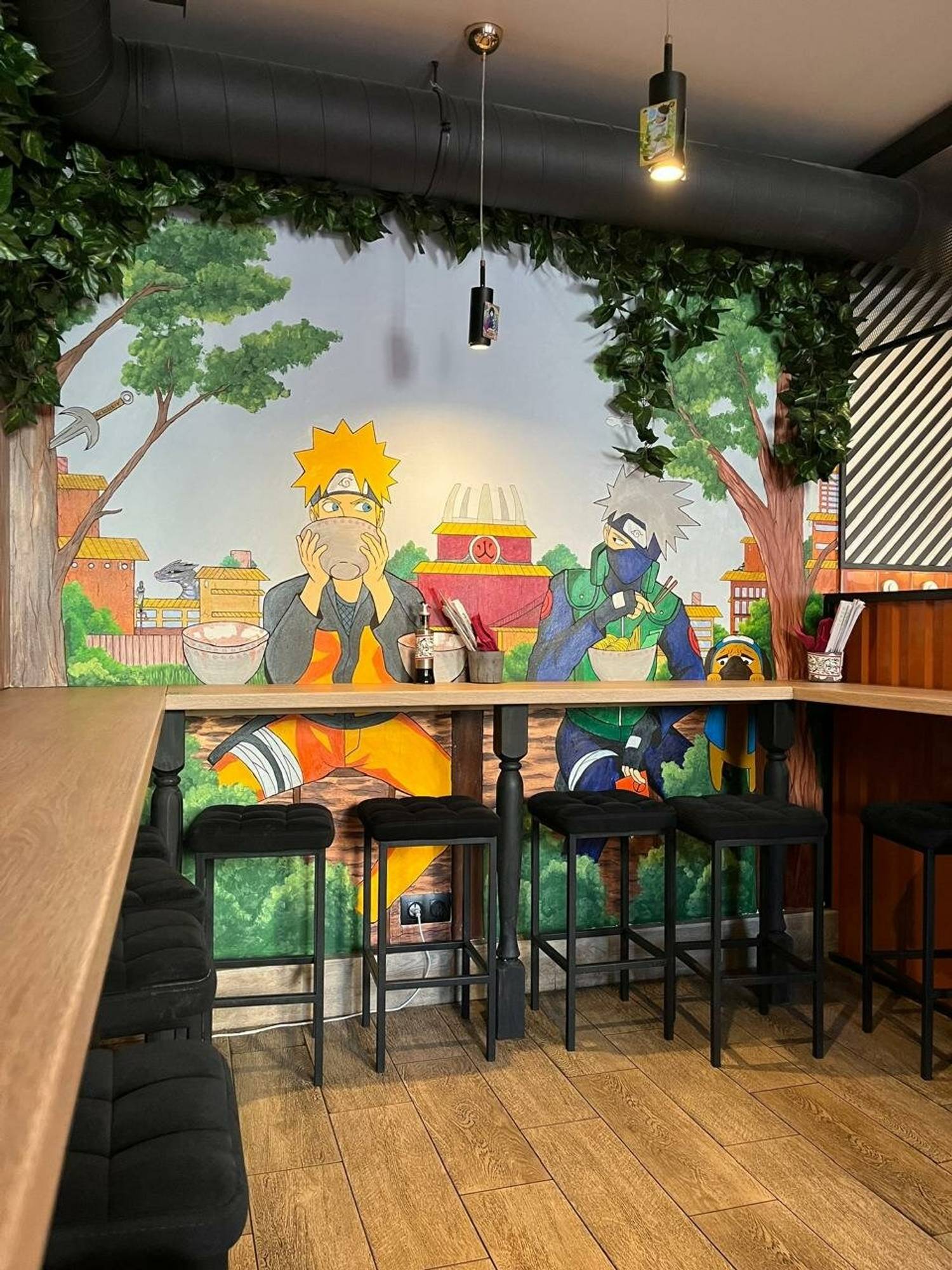 Атмосфера. Пространство наполнено отсылками к популярному аниме: на одной стене изображены Наруто, который с аппетитом уплетает рамен, другая стена полностью покрыта черно-белыми комиксами. Оранжевая стойка заказов, высокие столы, барные стулья и картины с героями аниме на тёмных стенах погружают внутрь японских картин.