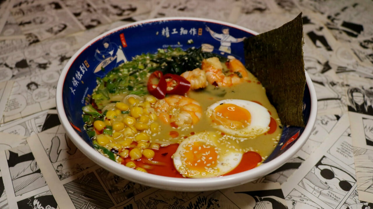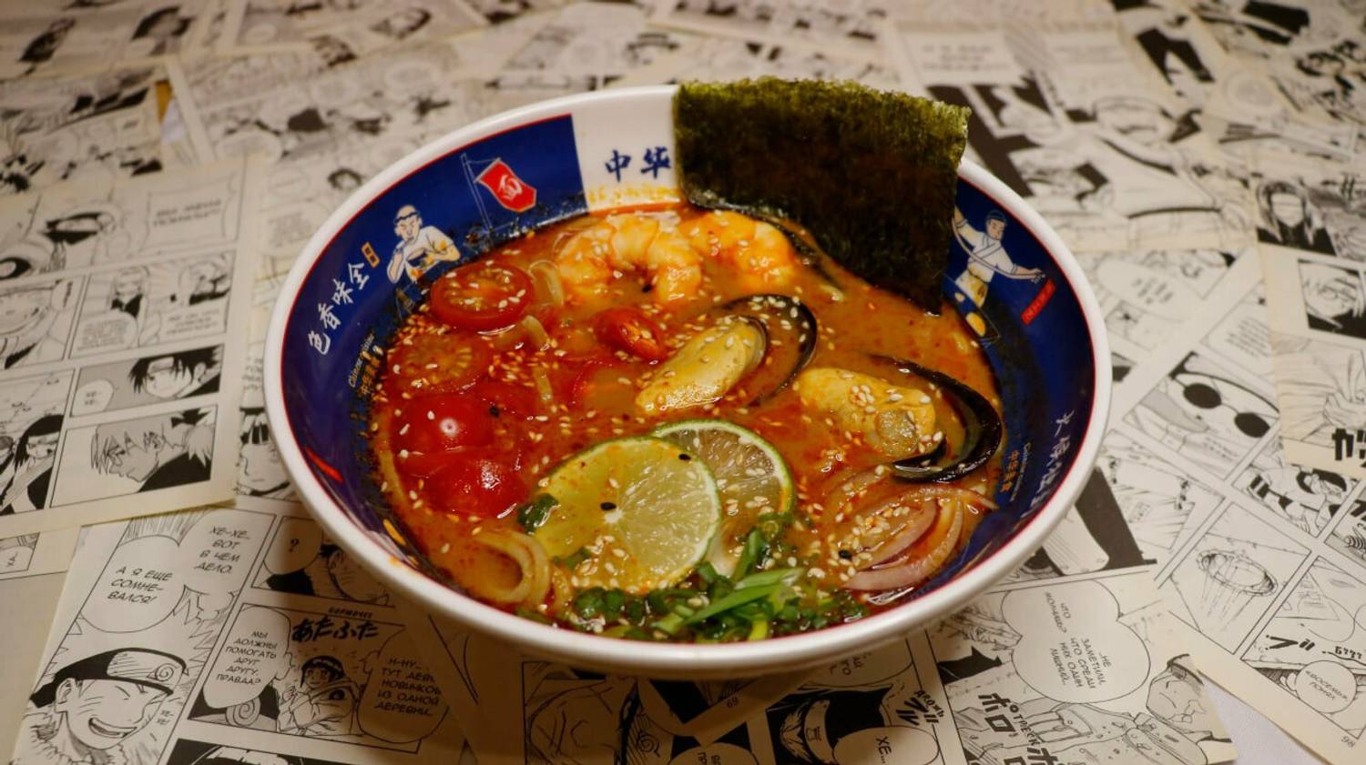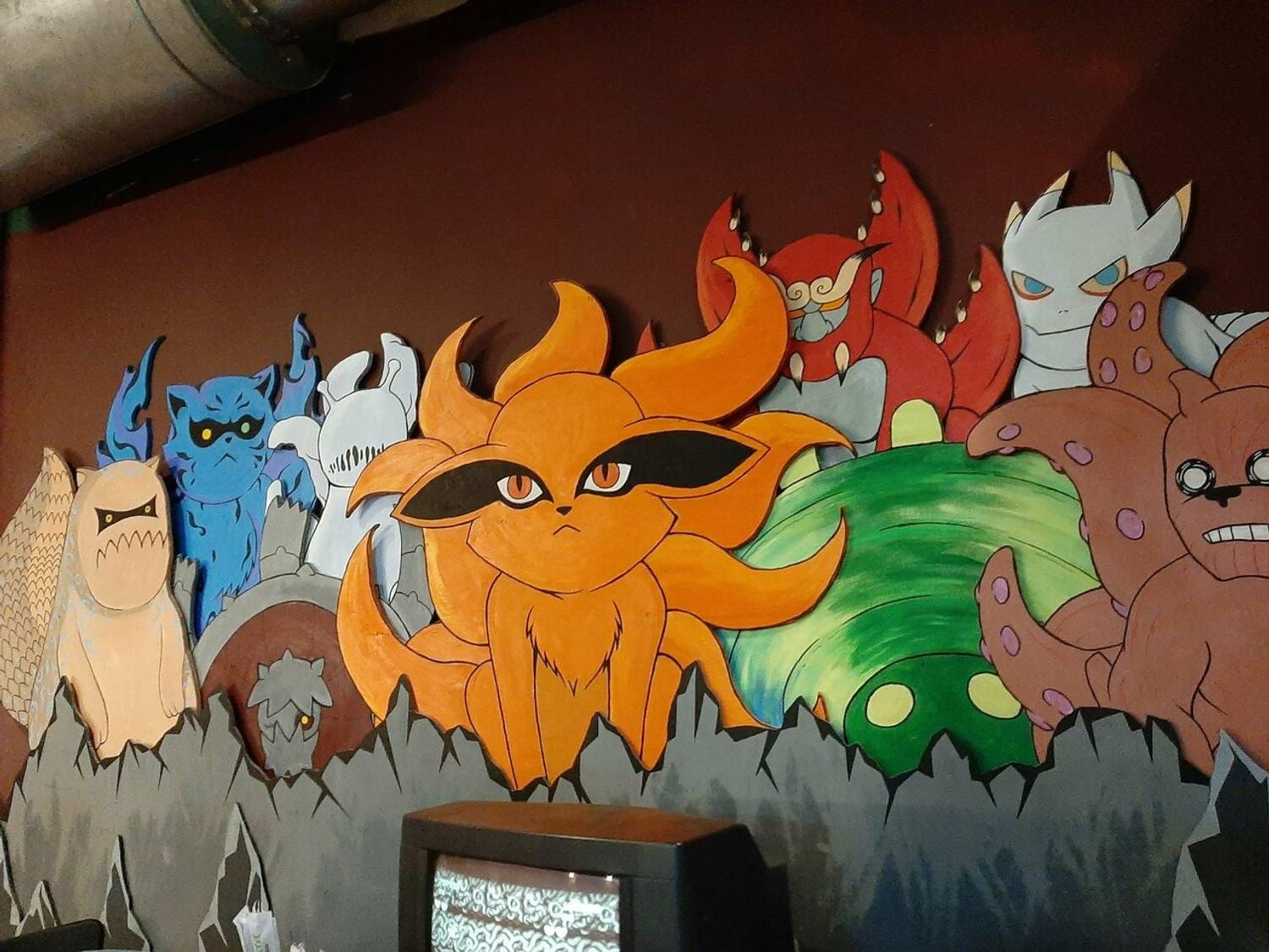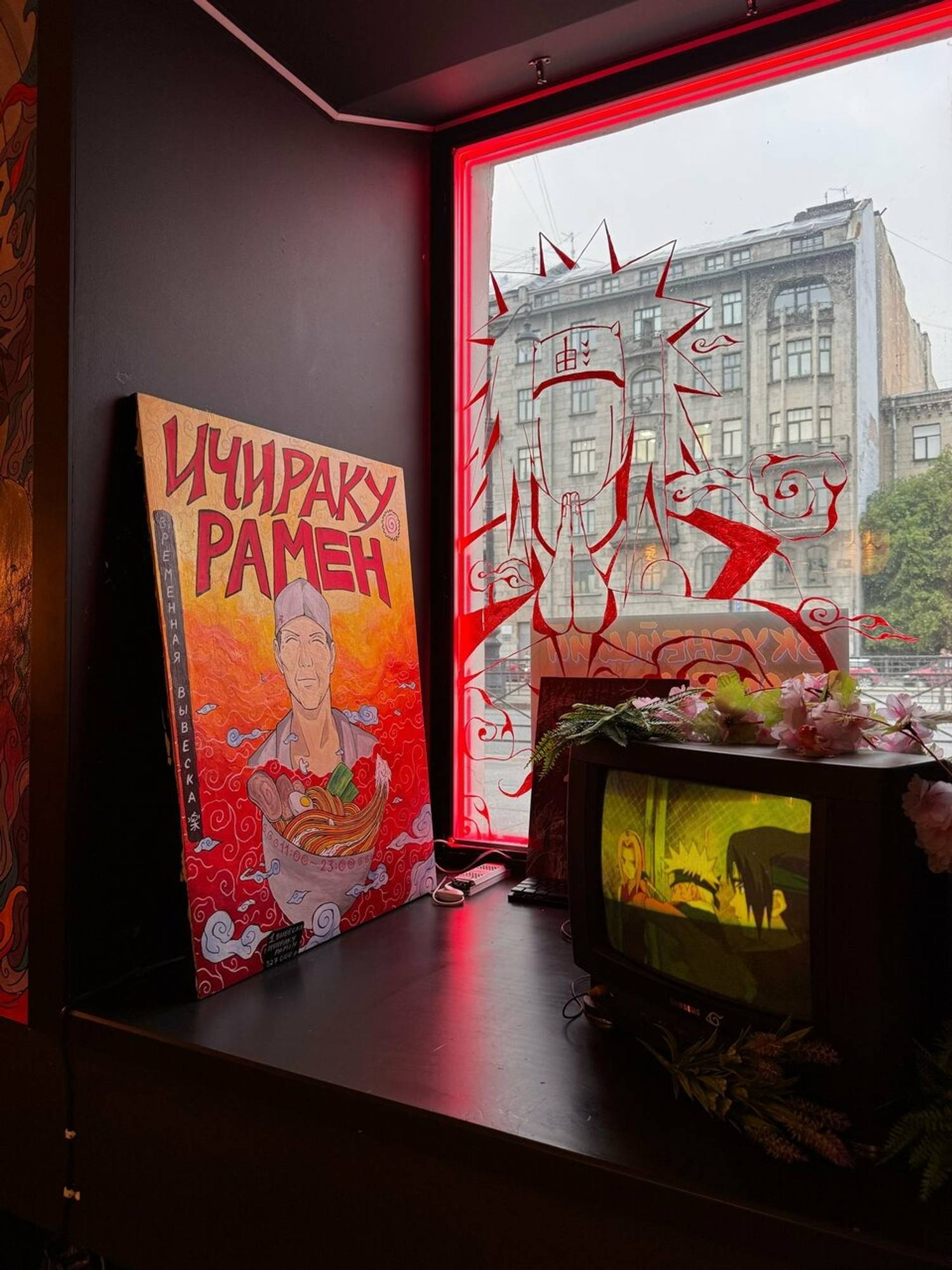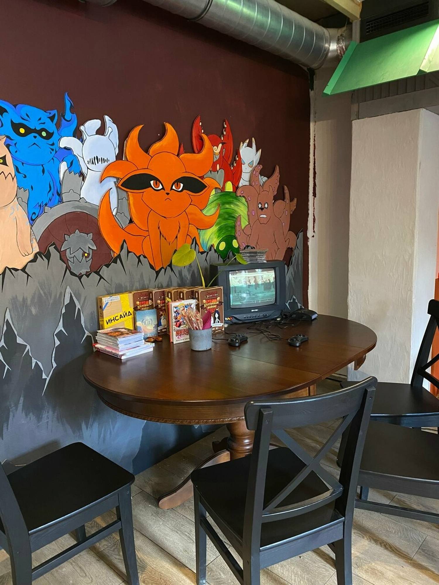 Атмосфера. Пространство наполнено отсылками к популярному аниме: на одной стене изображены Наруто, который с аппетитом уплетает рамен, другая стена полностью покрыта черно-белыми комиксами. Оранжевая стойка заказов, высокие столы, барные стулья и картины с героями аниме на тёмных стенах погружают внутрь японских картин.