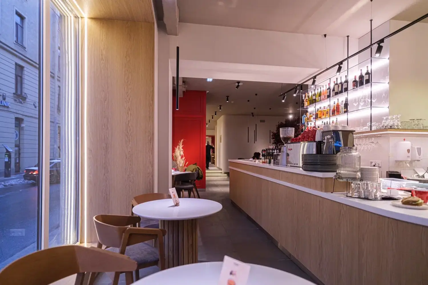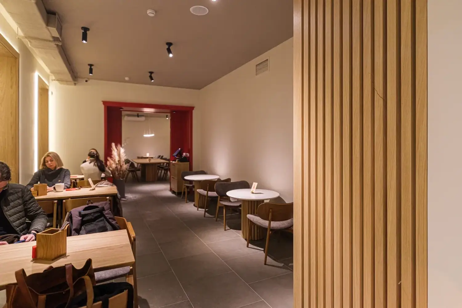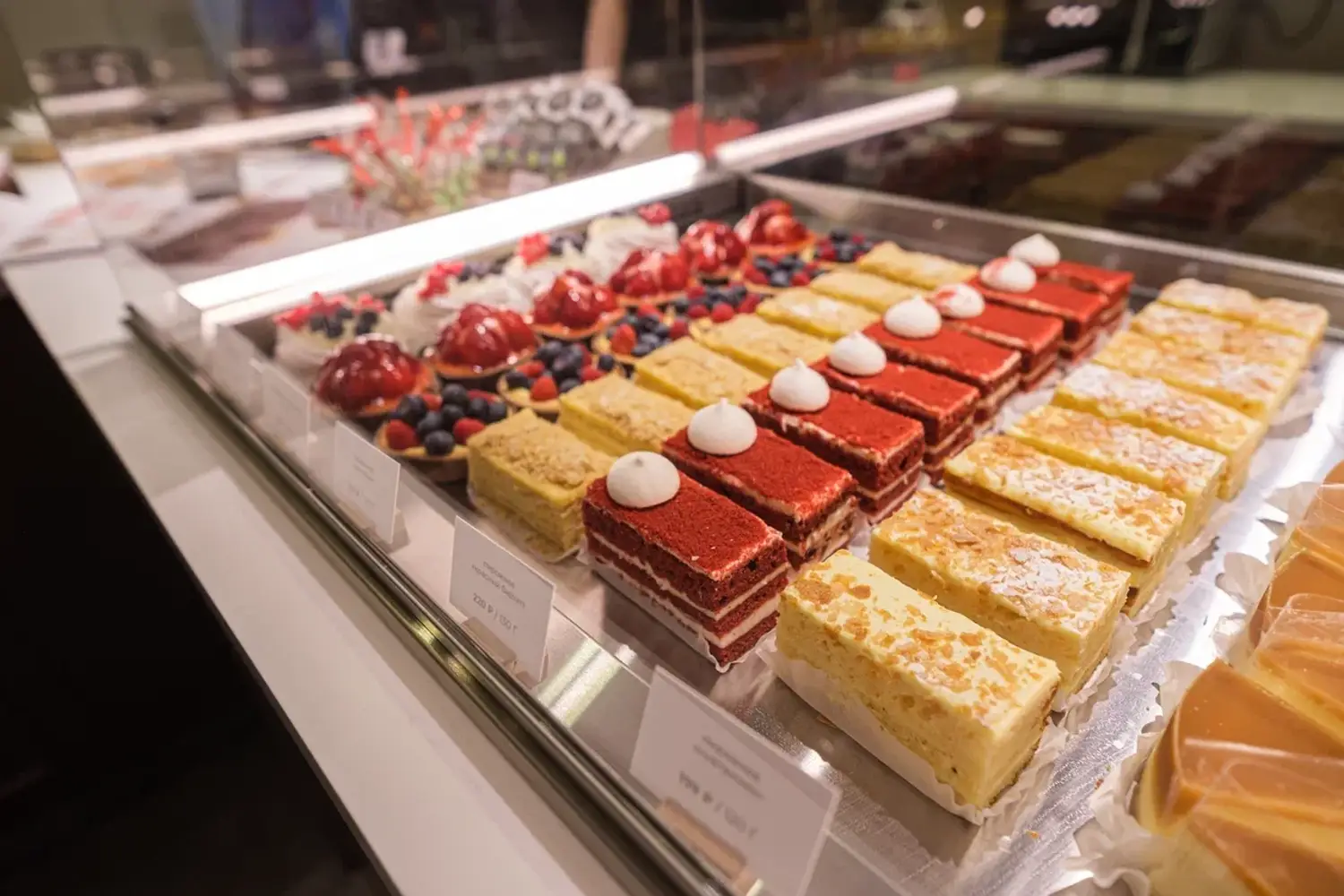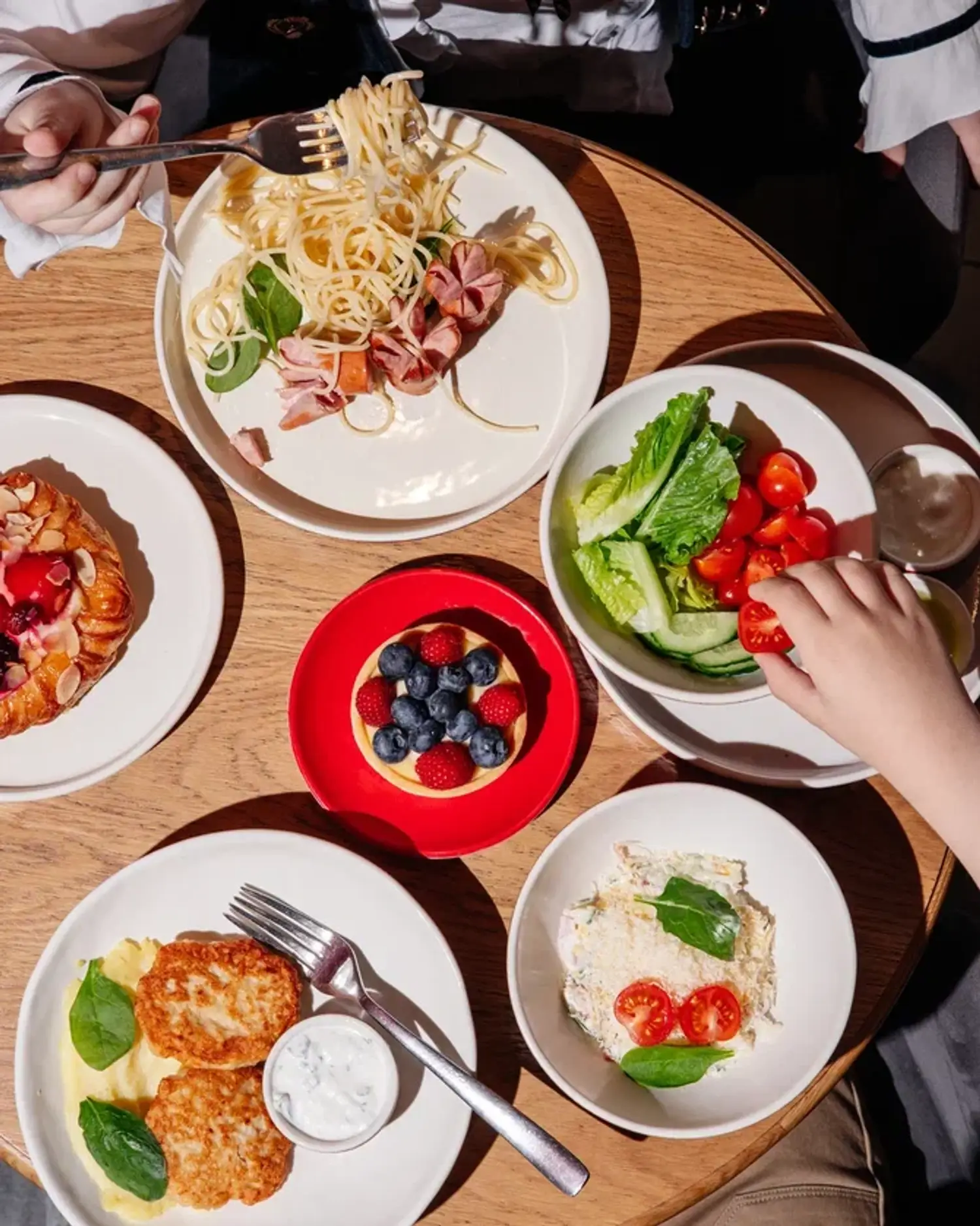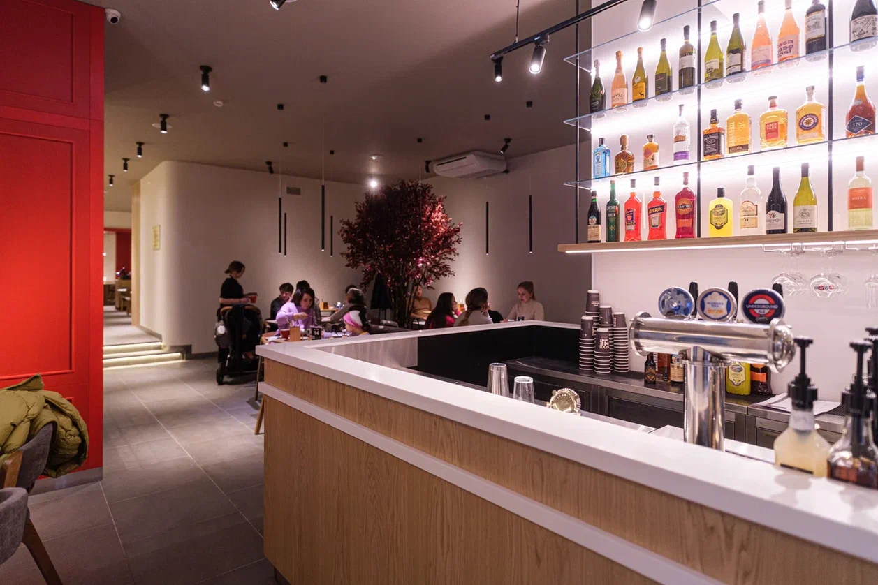 Еда и напитки. В меню классический кофе, какао нутелла, ягодный глинтвейн, клубничный молочный коктейль. Также есть выпечка: киш с индейкой и тыквой, круассан с ветчиной и сыром, пирожное пломбир-малина, наполеон. Среди блюд спаггети с курицей в сливочном соусе, бифштекс из говядины с яйцом и ирландский луковый суп.