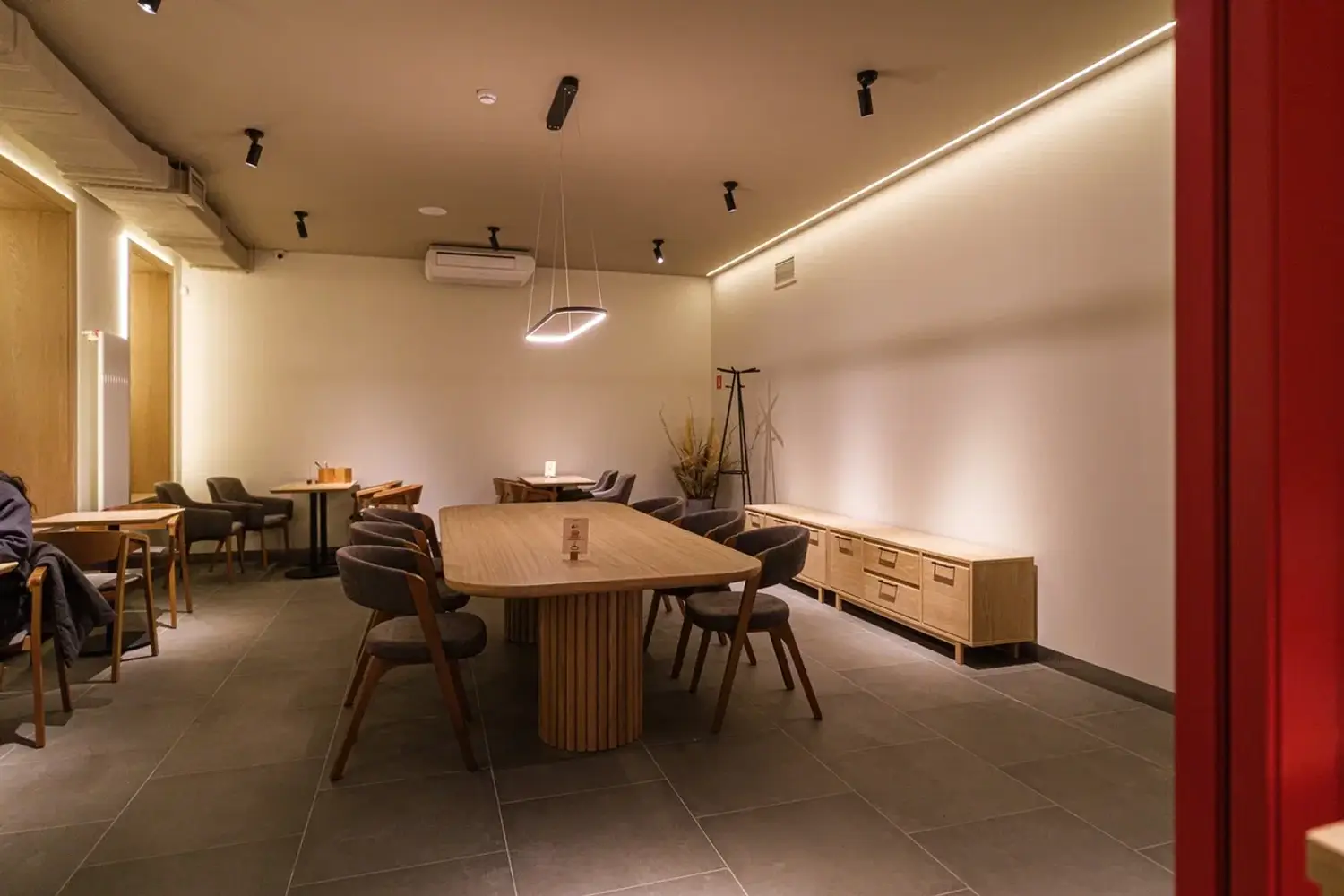 Атмосфера. Интерьер в светлом стиле, стойкой заказов с подсветкой. Внимание также привлекает большое растение в белом кадке в центре зала.