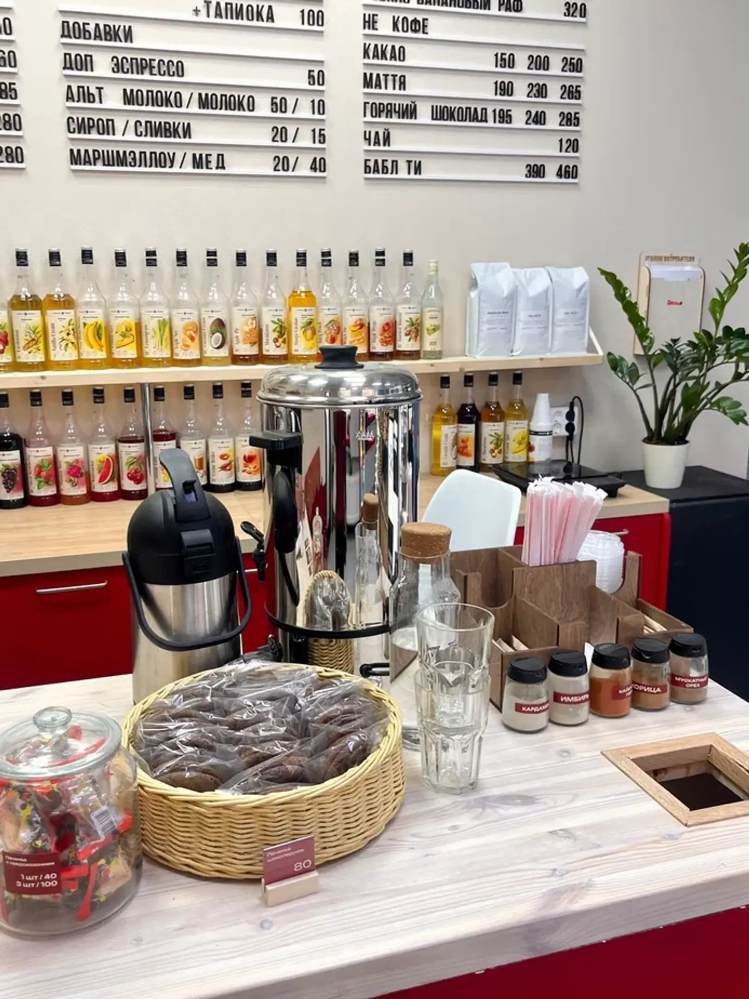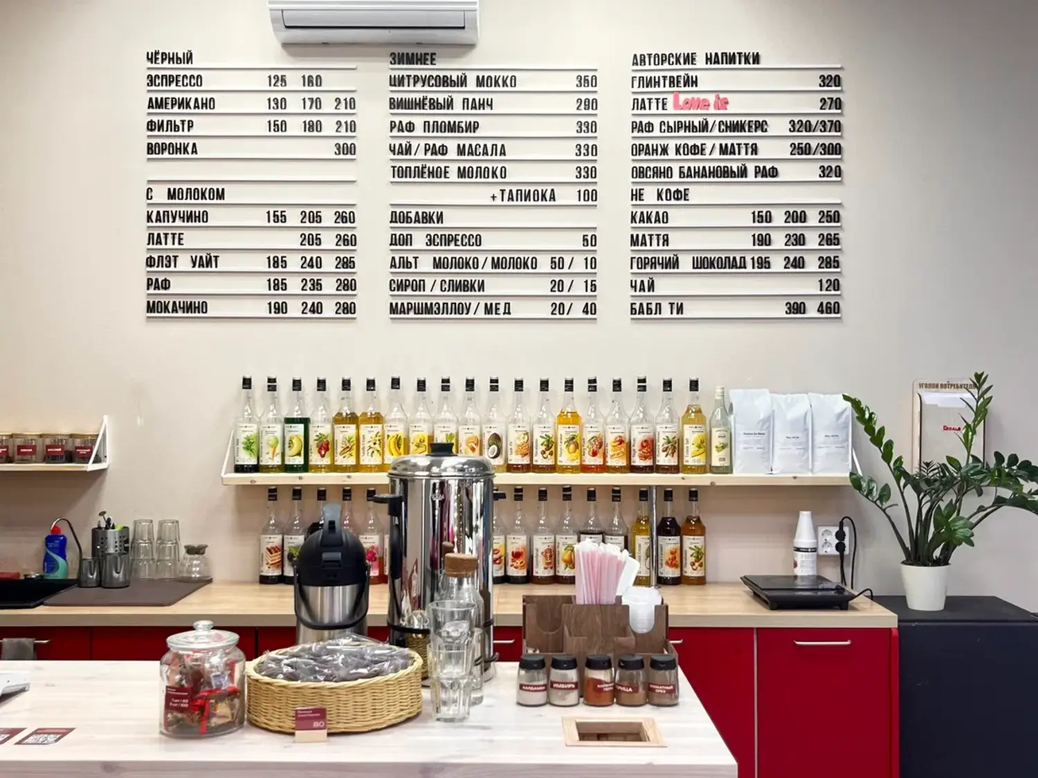 Еда и напитки. В меню — широкий выбор напитков на каждый день: от классического эспрессо, капучино и айс-латте до освежающих лимонадов и бабл-ти с разнообразными топпингами. Из авторских вариантов есть латте love is и раф сникерс, а среди зимних позиций цитрусовый мокко, раф пломбир и вишневый панч.