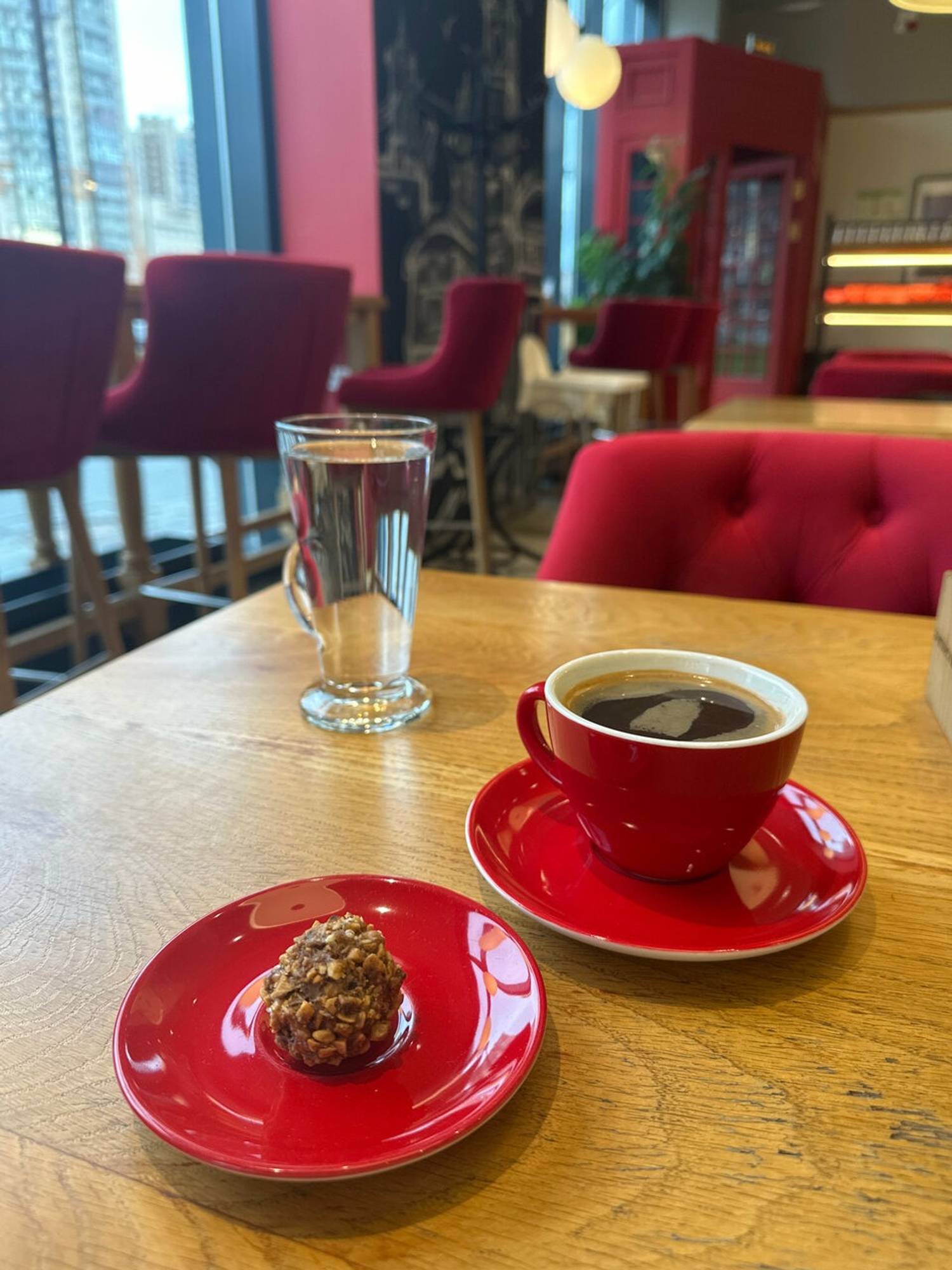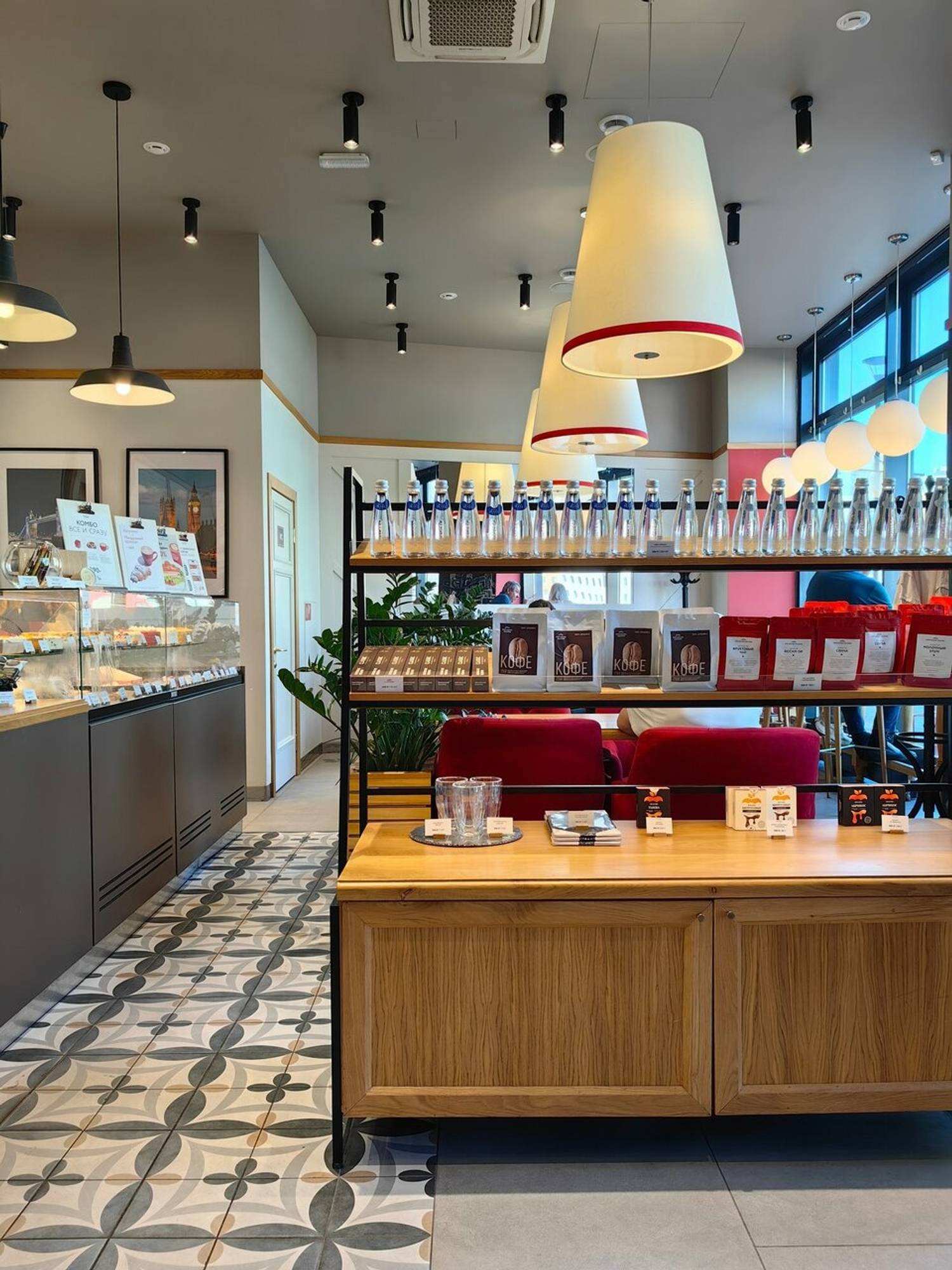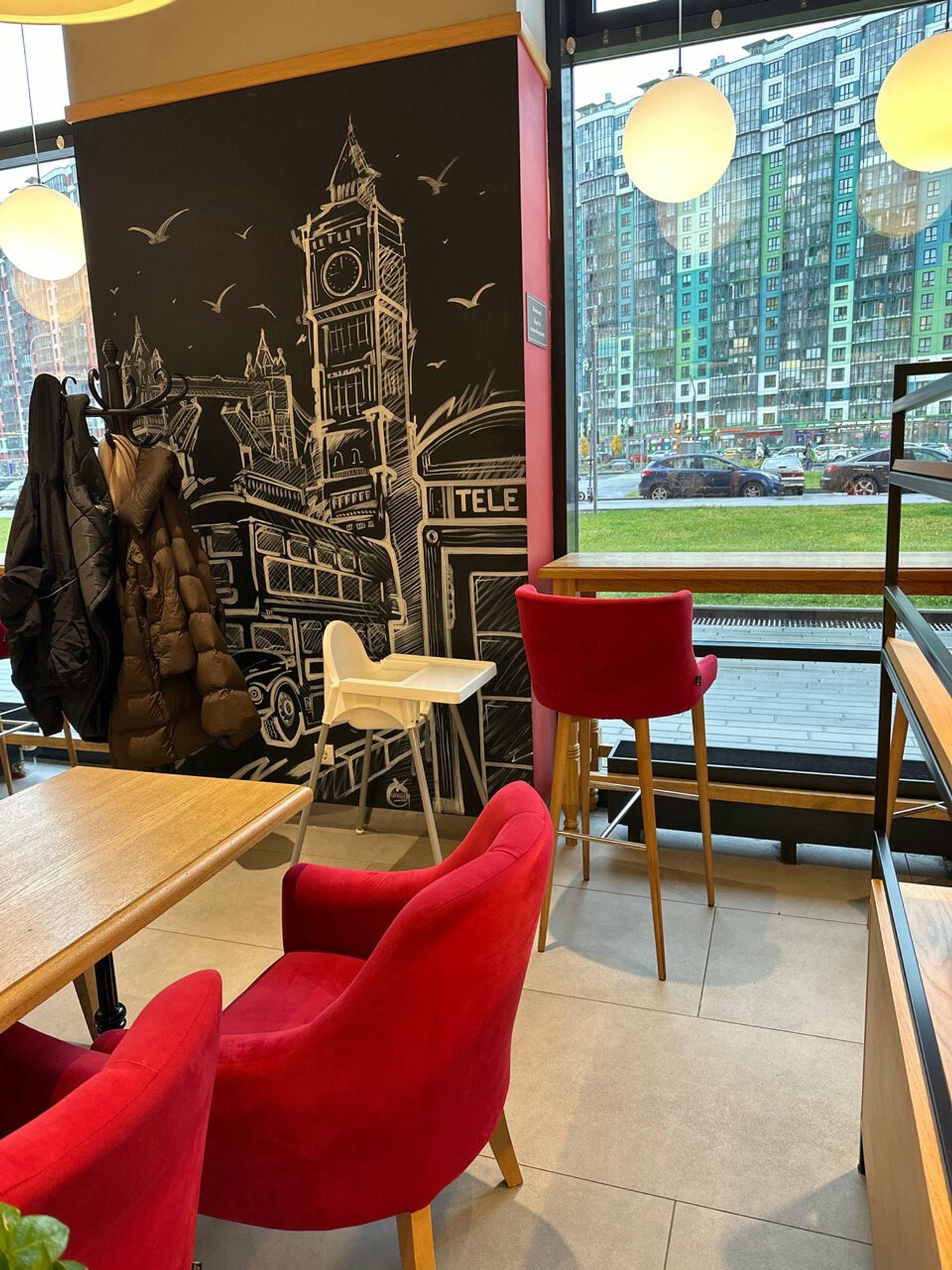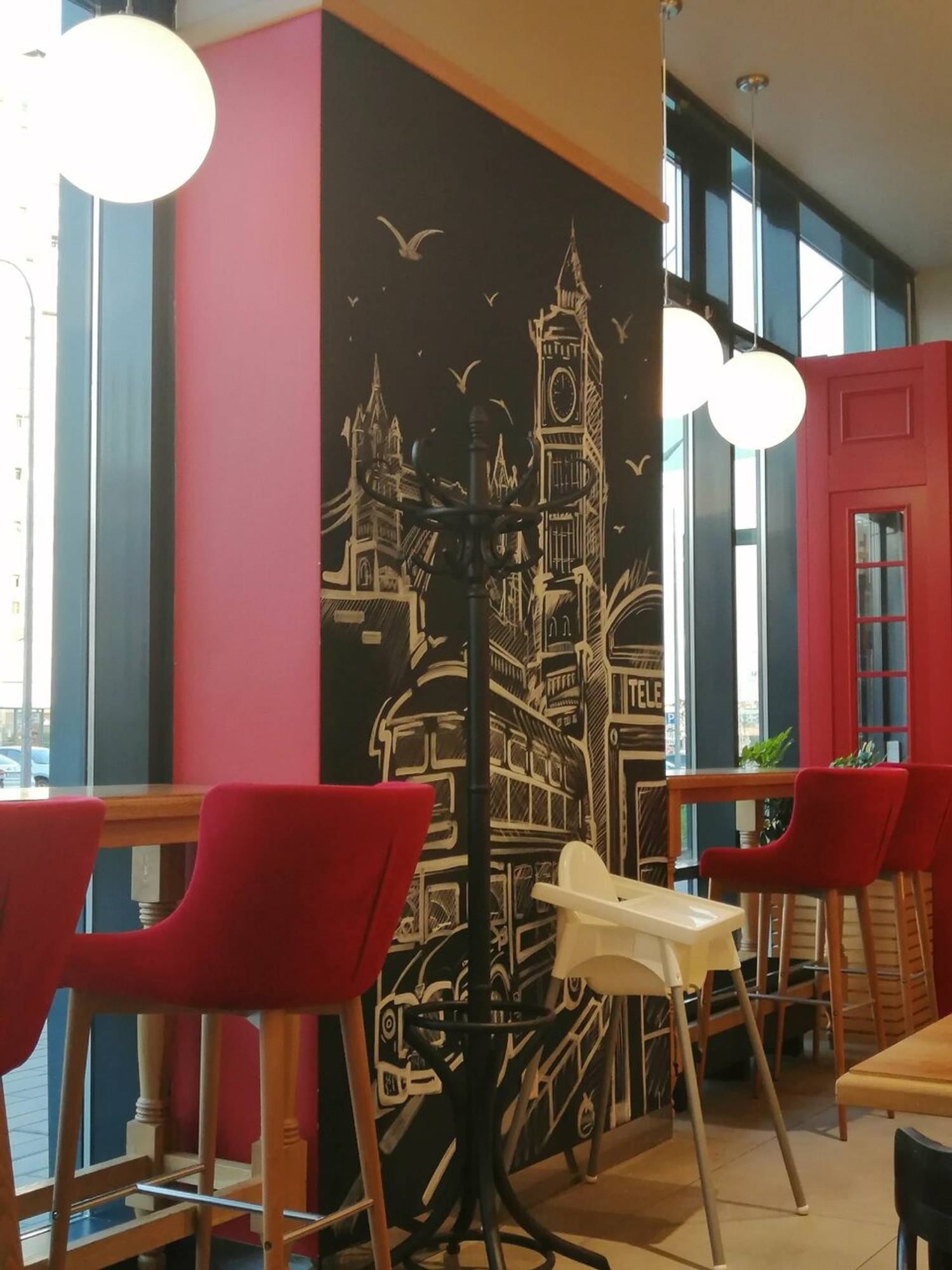 Атмосфера. Пространство с атмосферой Лондона: стена с рисунками столицы Великобритании, красные мягкие стулья, серые стойки и панельные деревья в кадках. Также есть детское кресло для гостей с семьей.