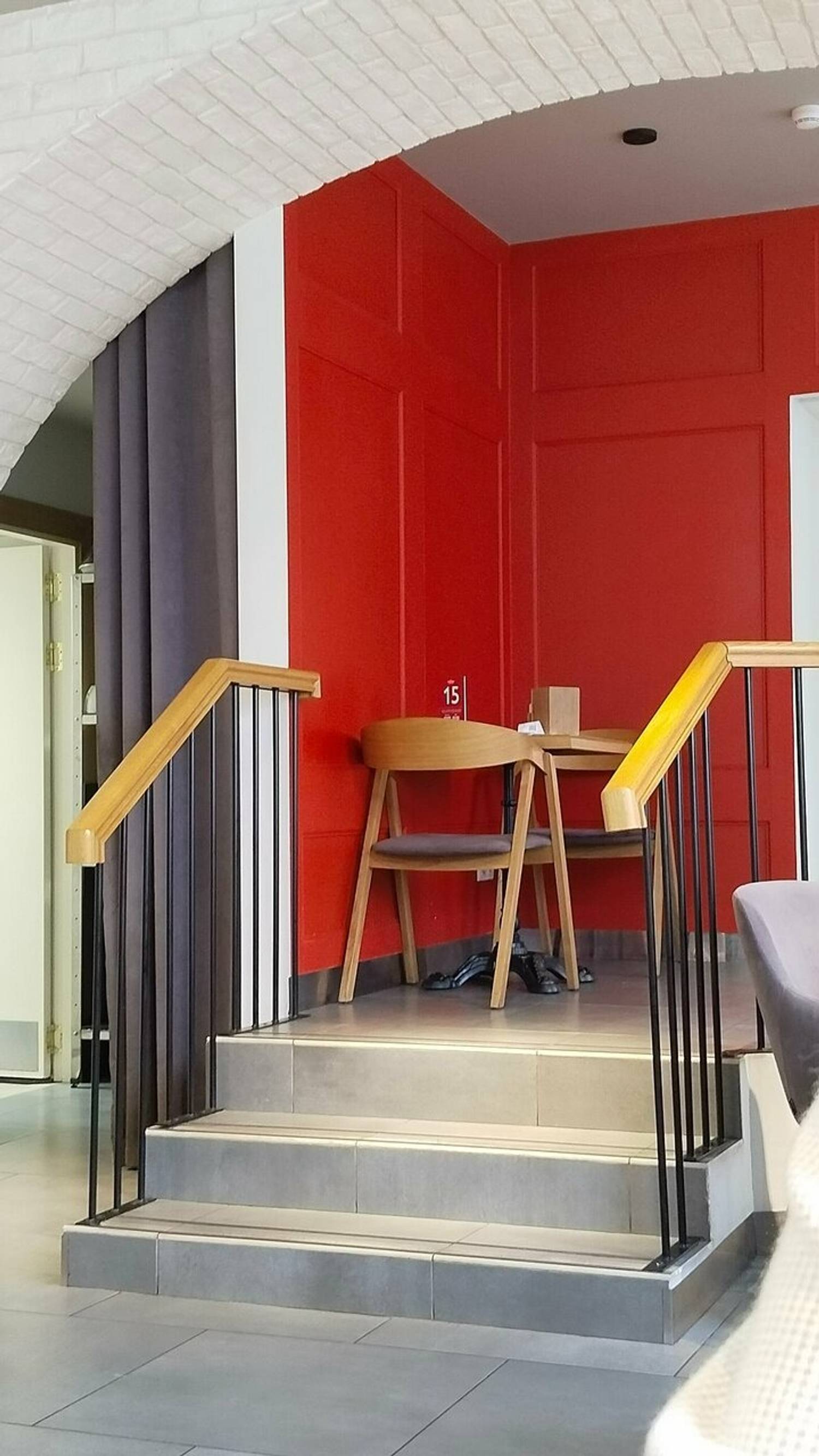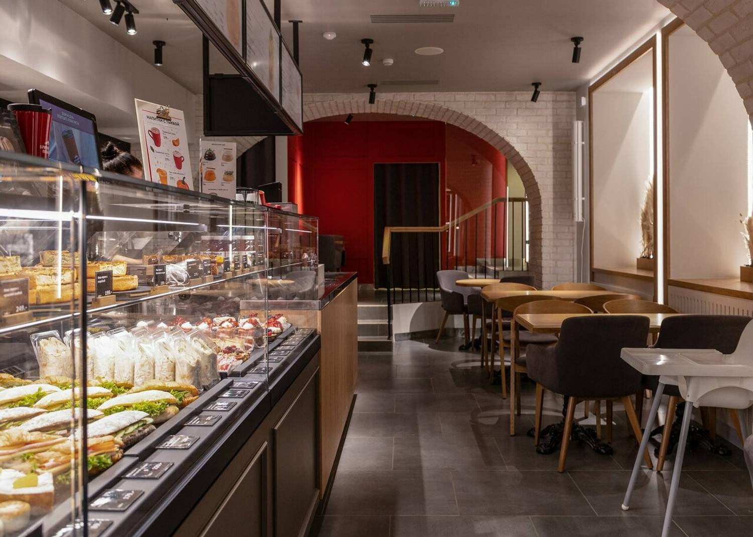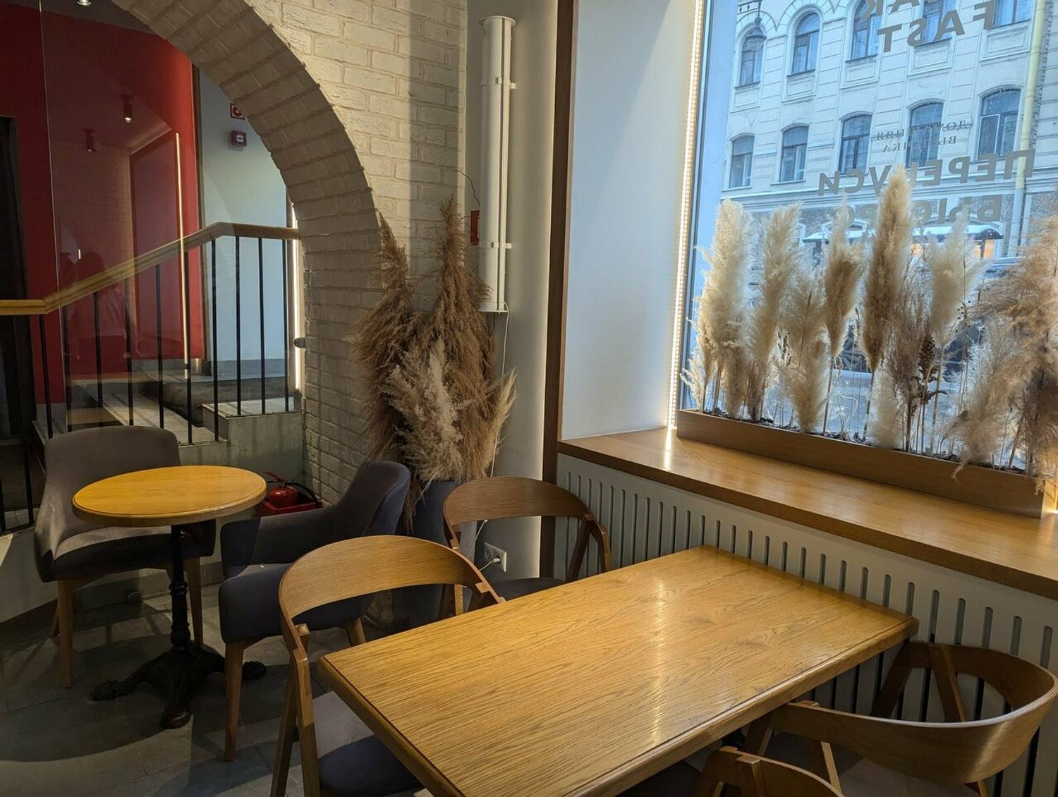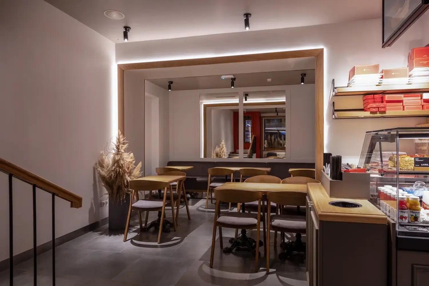 Атмосфера. Сюда спускаются по небольшой лестнице. Внутри серая стойка заказов, серые и деревянные стулья, которые создают сдержанную эстетику.