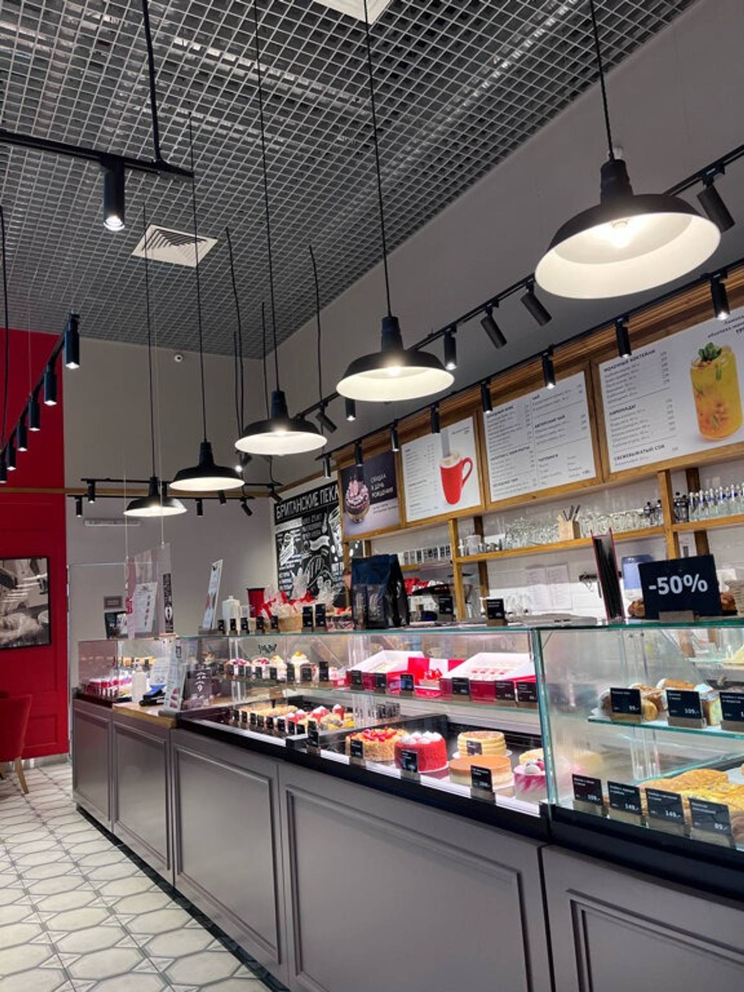Атмосфера. Внутри спокойные цвета: серая стойка заказов, красные стулья, акцентная красная колонна и светлые торшерообразные люстры.