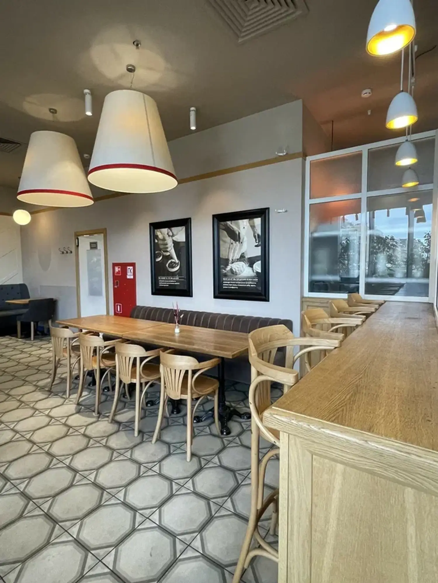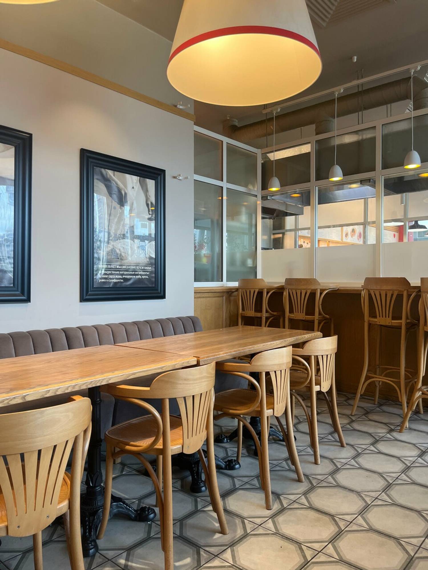 Атмосфера. Пространство сочетает классические и современные элементы: деревянные столы и стулья, картины в черных рамах на стенах, красные мягкие стулья и серую стойку заказов.