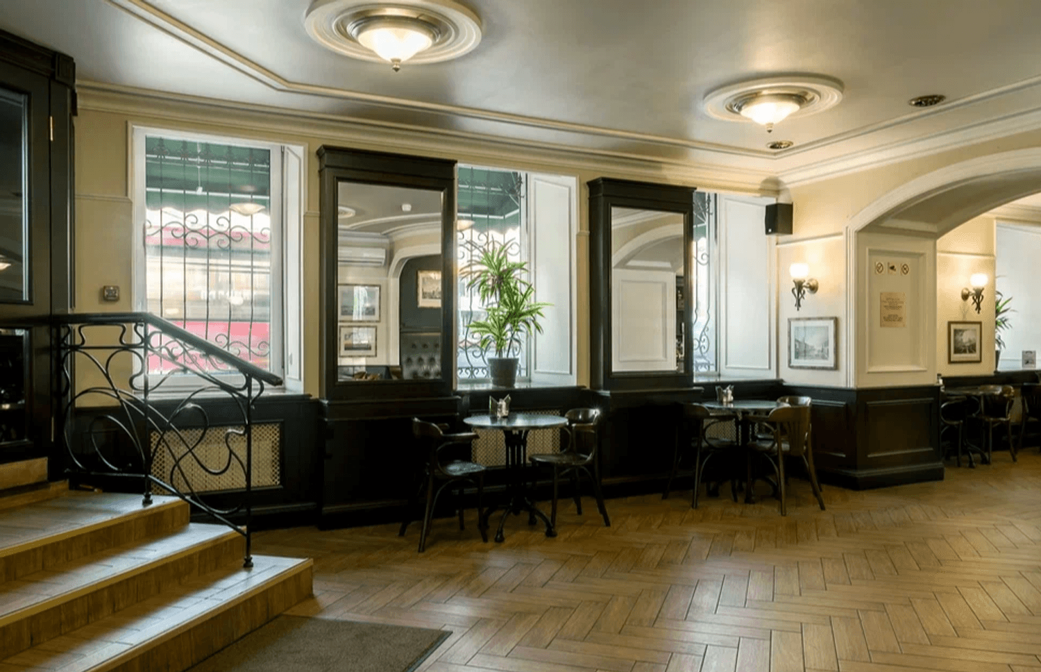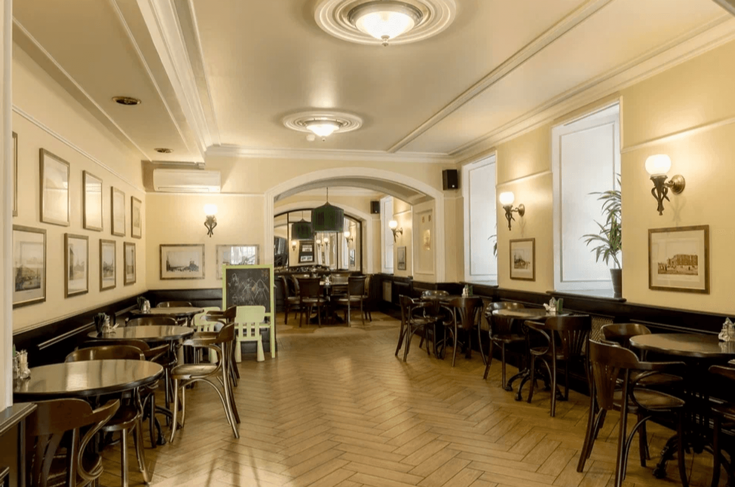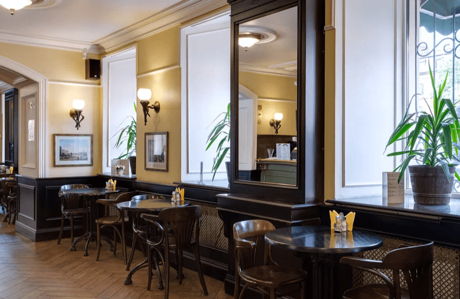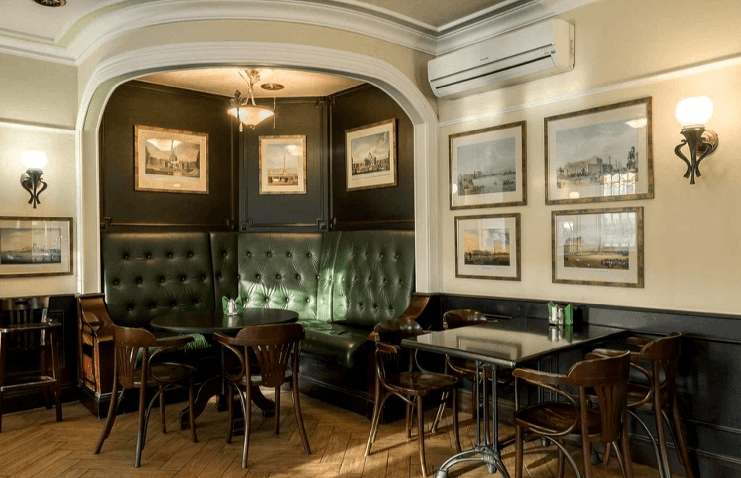 Атмосфера. Интерьер в фирменном стиле сети с темным деревом, изумрудными кожаными диванами и венскими стульями создает уютную атмосферу для отдыха. Классические детали оформления, фигурные зеркала и старинные фото напоминают о петербургских традициях.