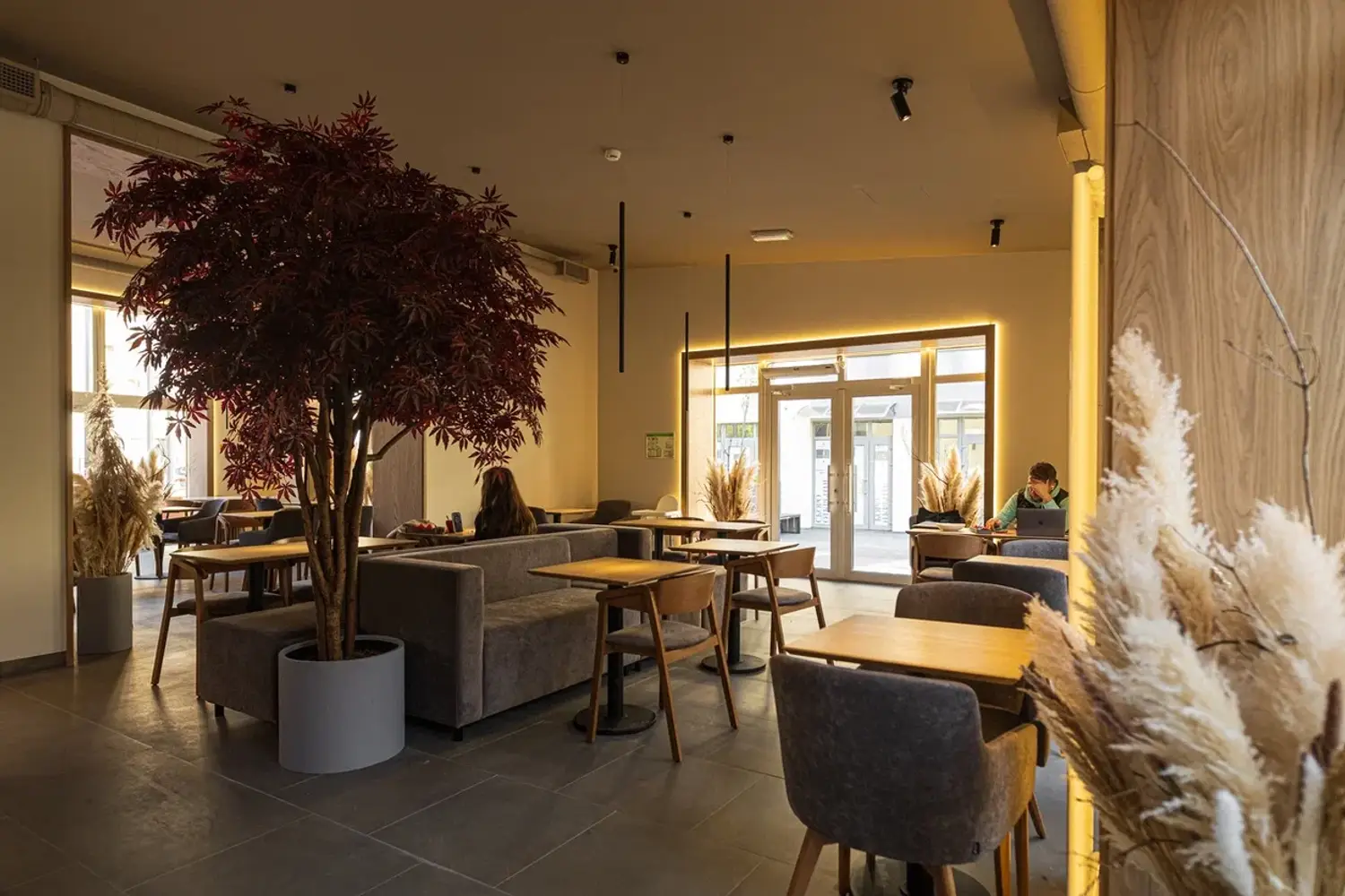Атмосфера. Оформление стиле лофт с центральным элементом в виде дерева. Интерьер сдержанный с серыми диванами, светлыми колоннами и окнами в подсвеченных рамах.