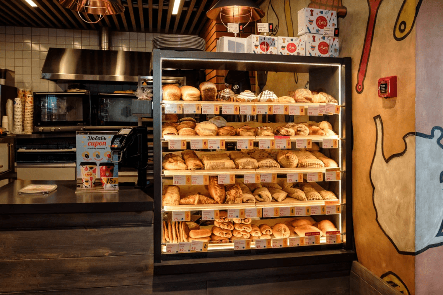 Еда и напитки. В меню базовые кофейные напитки: эспрессо, американо, капучино, латте — без сиропов и добавок. Также есть свежая выпечка: круассаны, слойки, сэндвичи, тарталетки и десерты, которые представлены на стеклянных витринах. Здесь можно пообедать крабовым салатом с пожарской котлетой или боулом с лососем и онигири с курицей терияки.