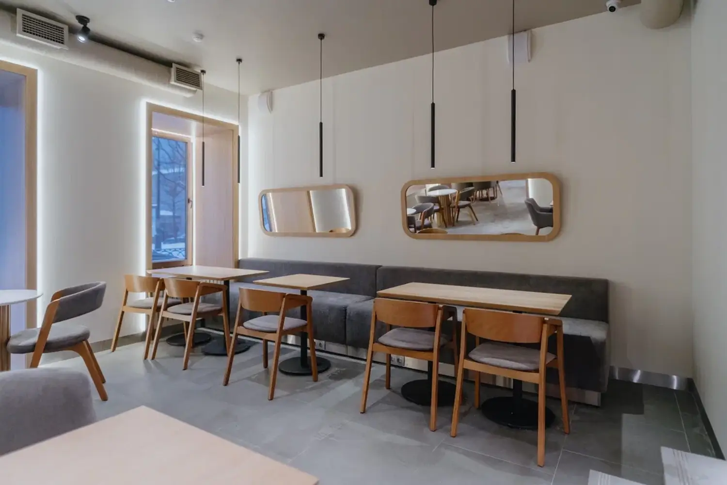 Атмосфера. Пространство в английском стиле с окнами с подсветкой, овальными зеркалами на стенах, деревянными стульями и серыми диванами. Универсальный интерьер как для работы, так и встреч или отдыха.