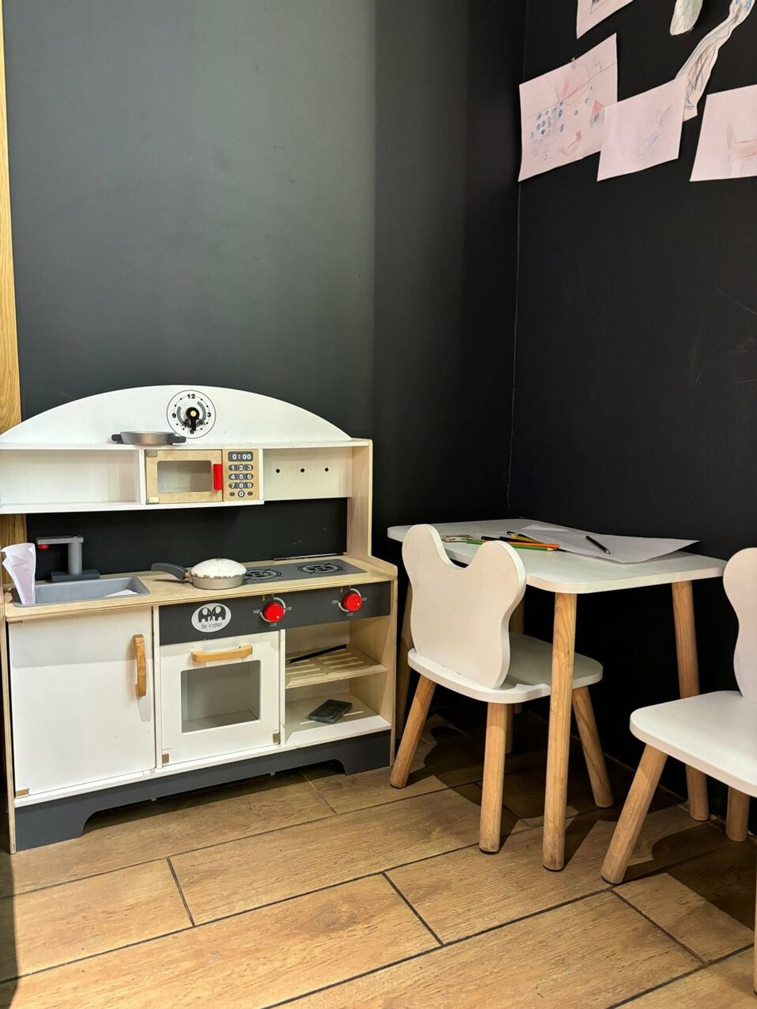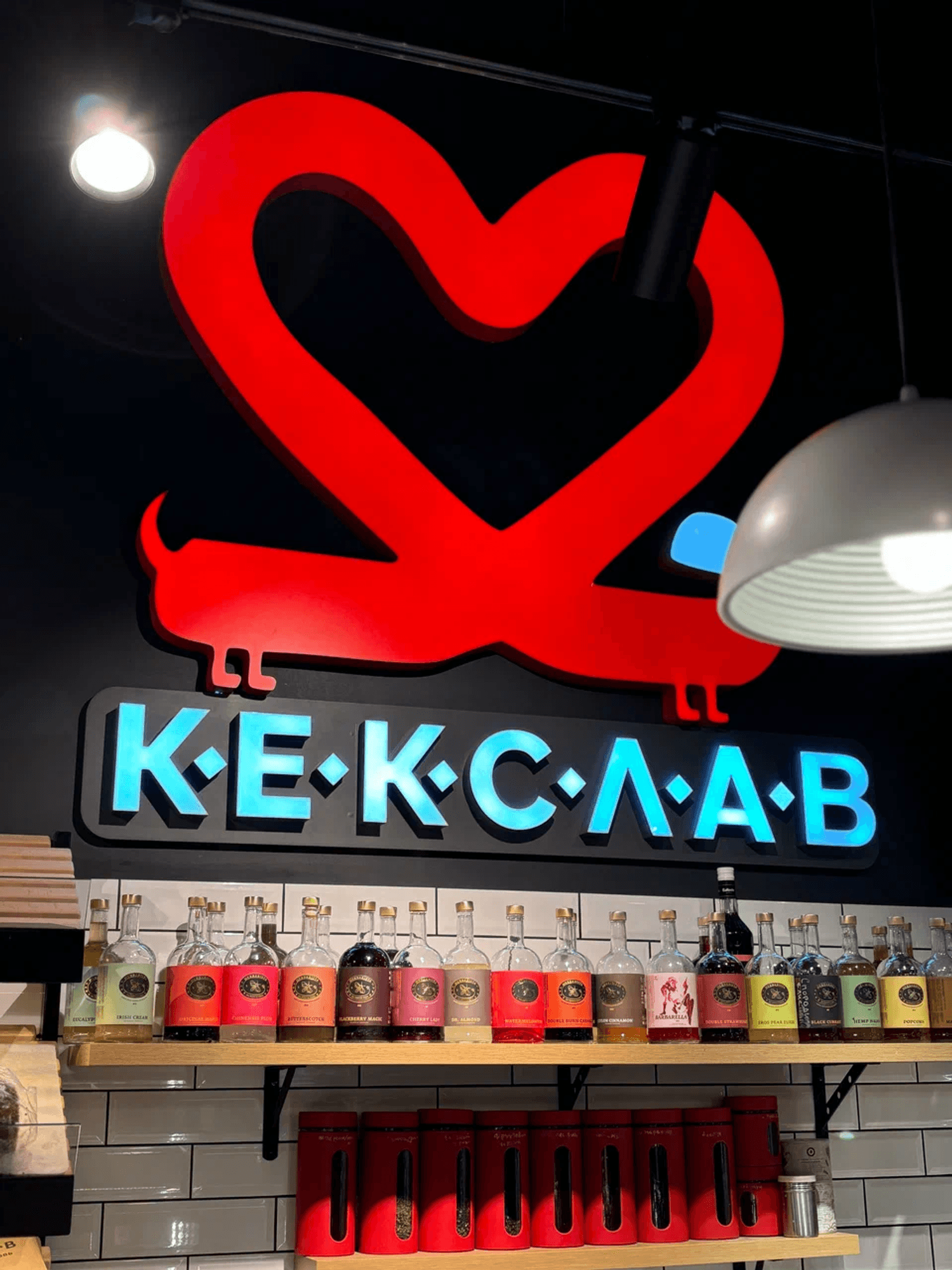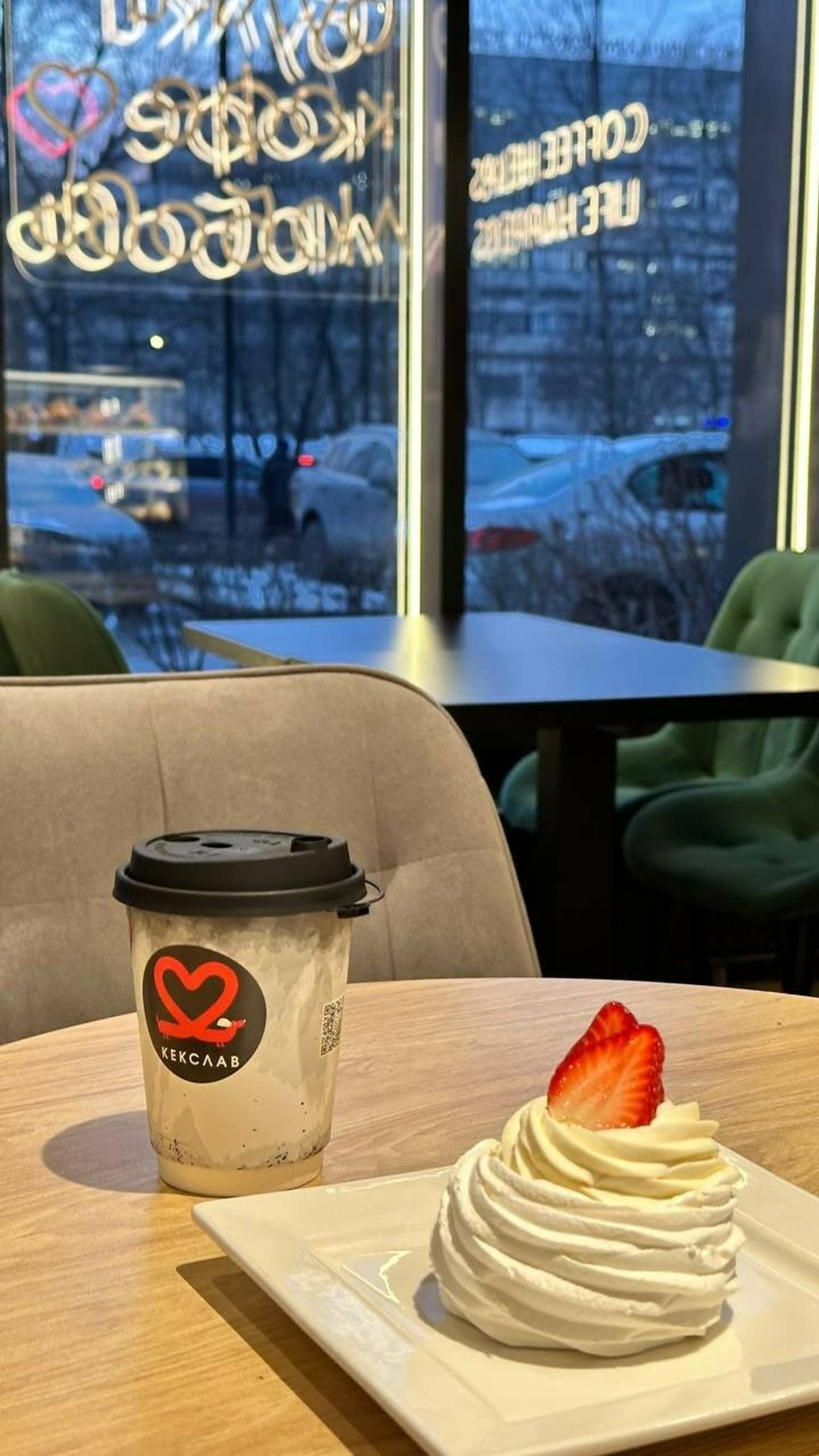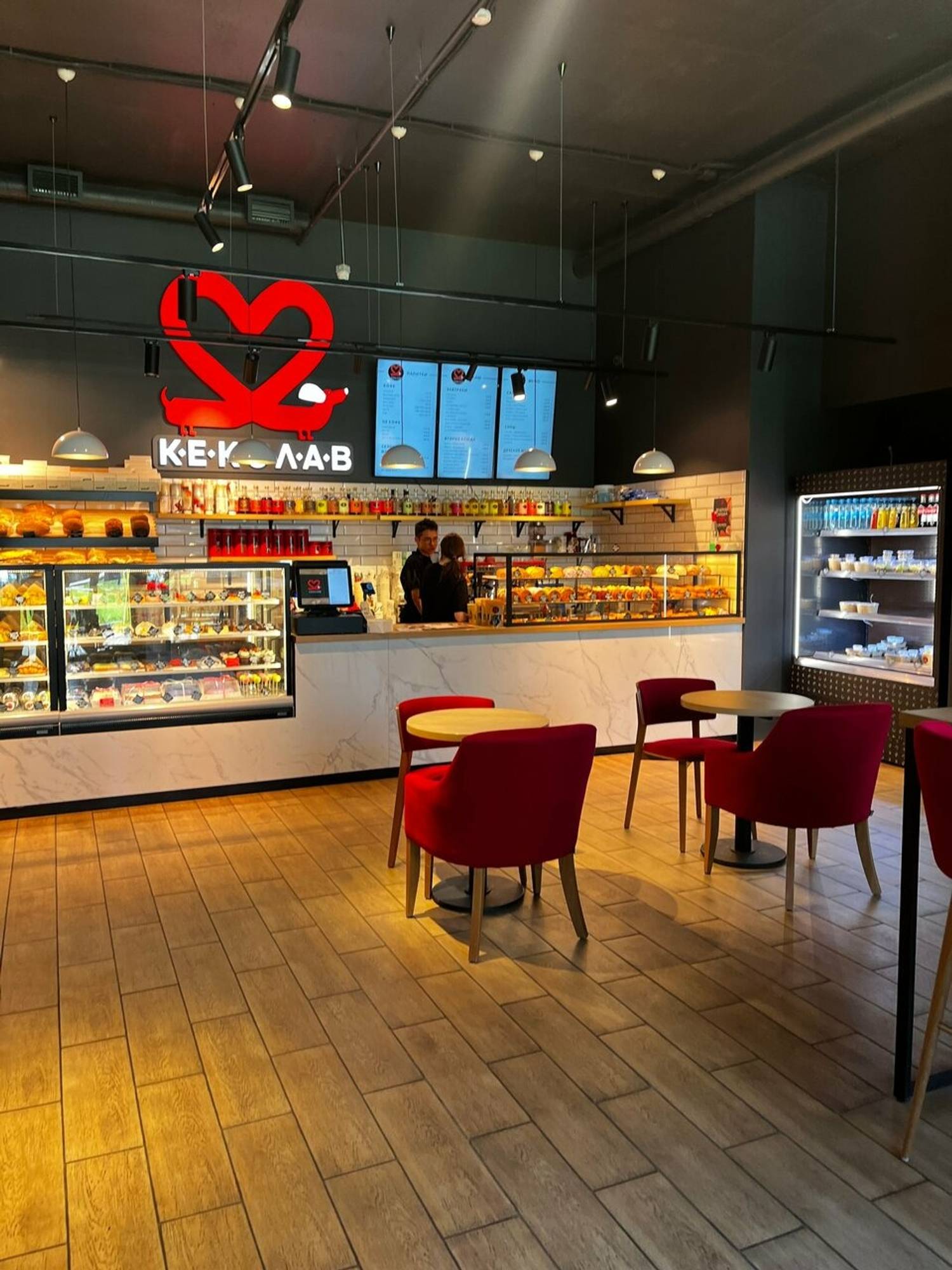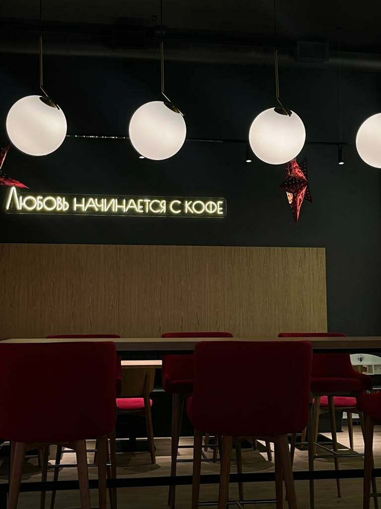 Атмосфера. «Любовь начинается с кофе» — именно такая фраза с подсветкой встречает гостей. Стильная кофейня с сочетанием черных, белых и красных акцентов: кожаные диваны, барные стулья у панорамных окон. Пока взрослые будут заняты выбором напитков и блюд, дети смогут поиграть на игрушечной кухне с плитой и столиком.