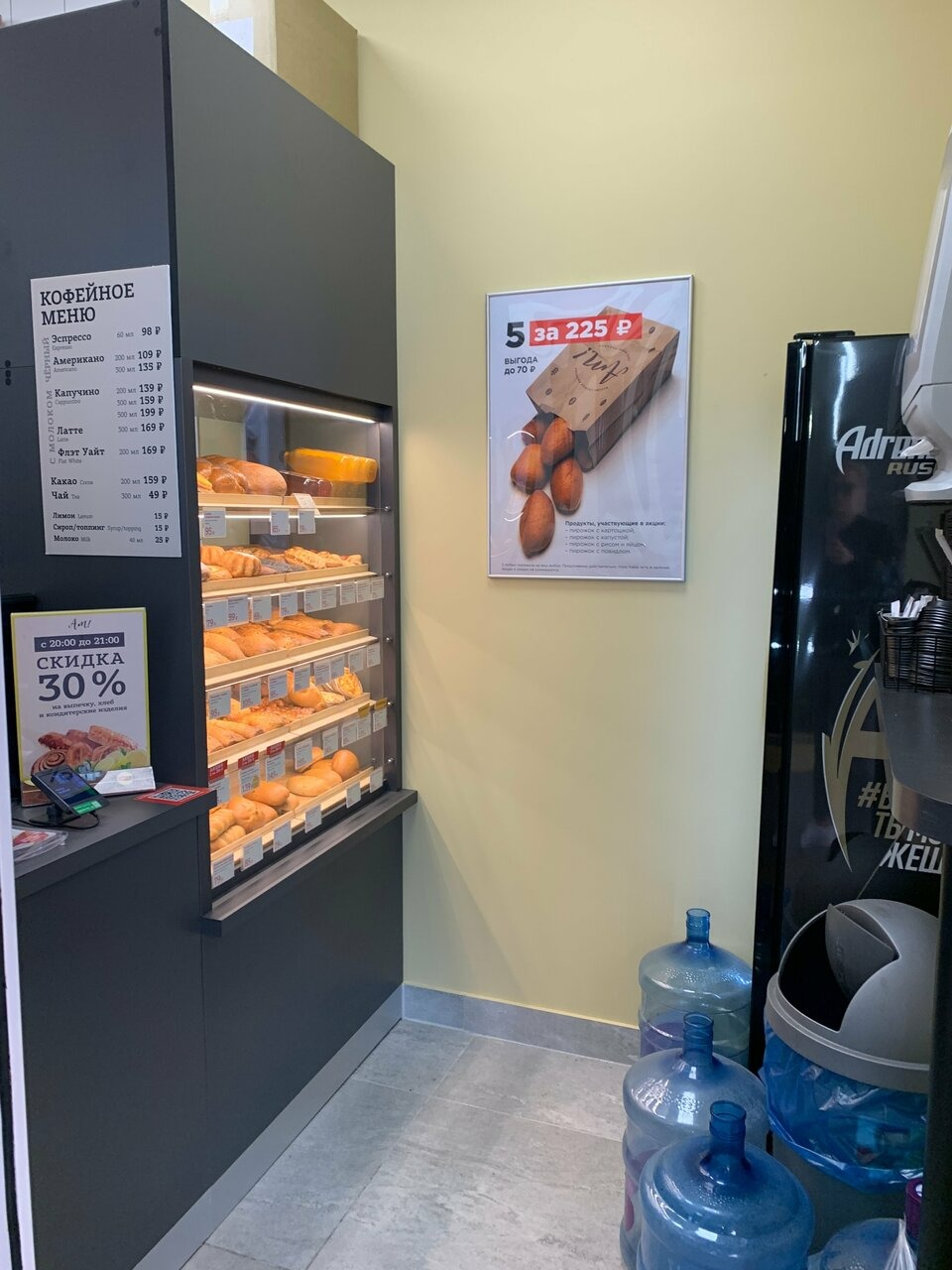 Еда и напитки. В меню кофе: эспрессо, американо, капучино, латте, а также сок, морс, молочный коктейль. Также готовят выпечку: слойка с маком, пирожок с рисом и яйцом, брусникой, круассан с малиной и заварным кремом.