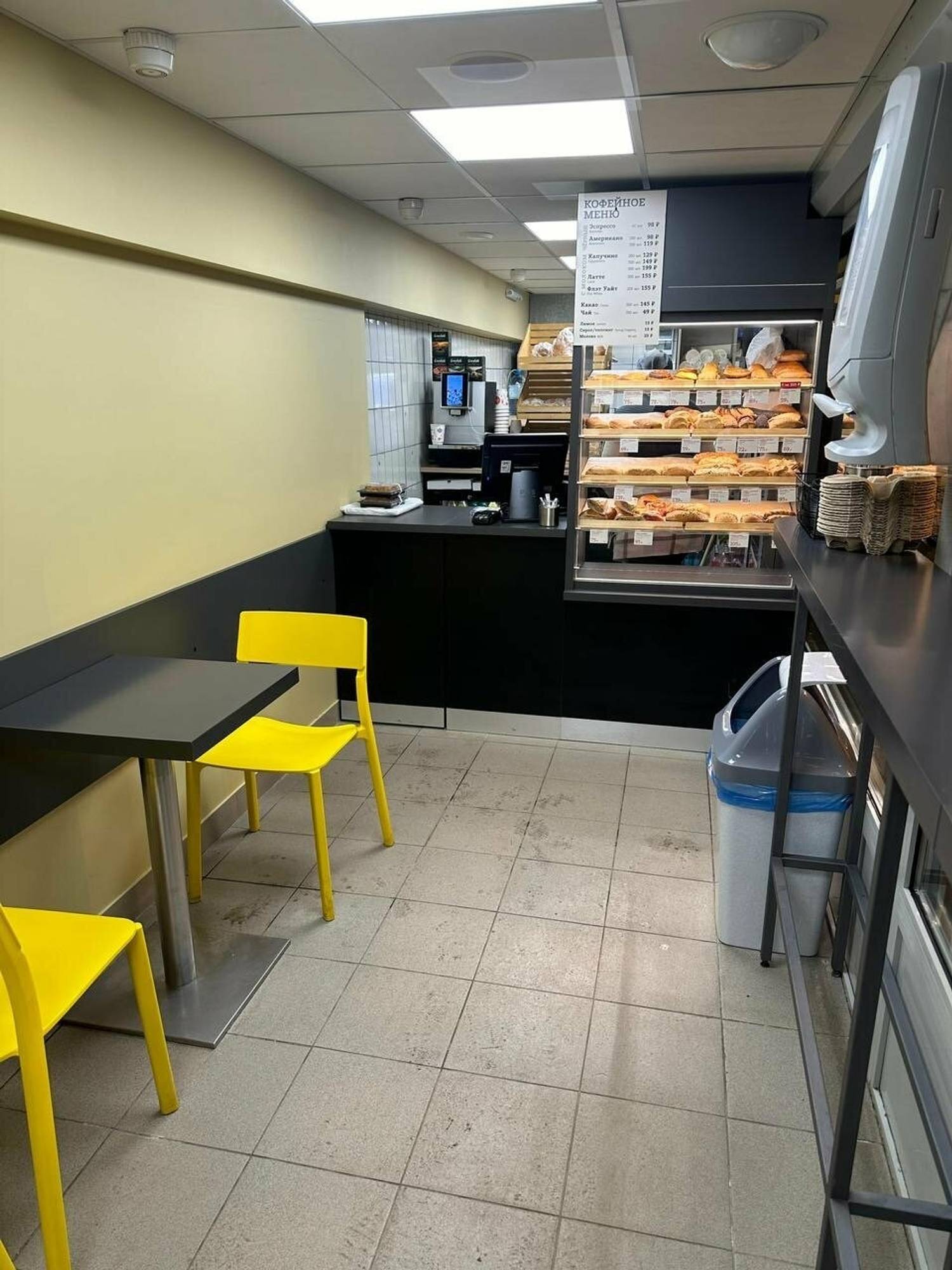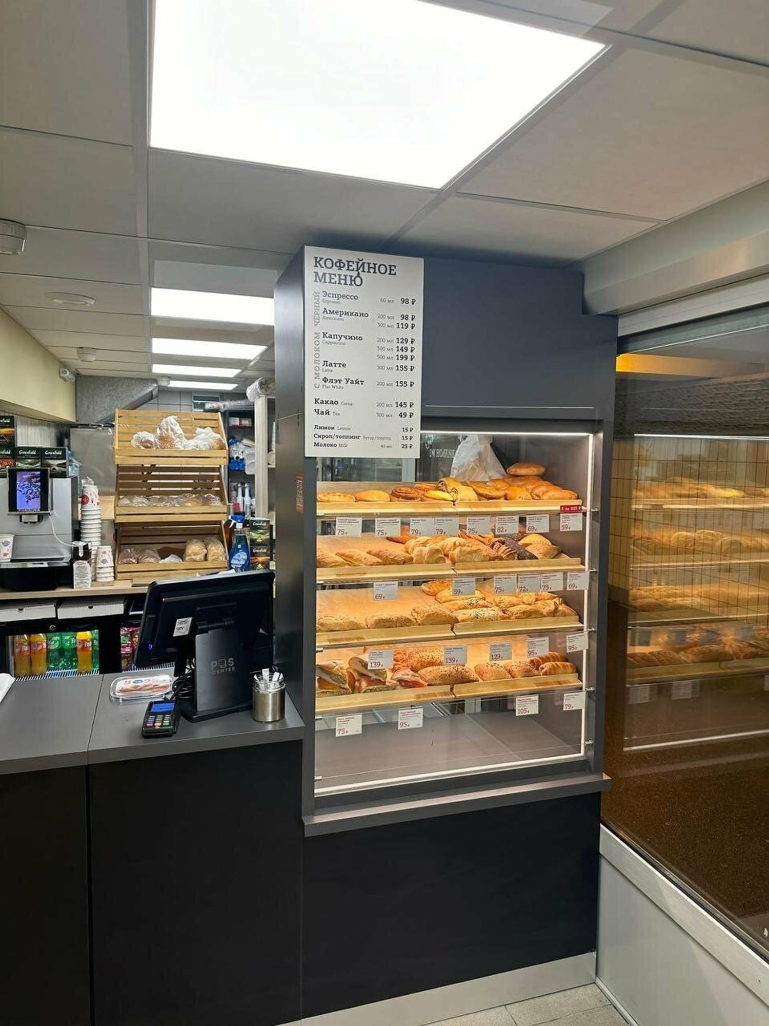 Еда и напитки. В меню базовые кофейные напитки: эспрессо, американо, капучино, латте, а также прохладительные айс-латте и капуччино. На стеклянных витринах выпечка и десерты: слойка с маком, хачапури, калитка с картофелем, жареный пирожок с сосиской, пирожок с вишней.