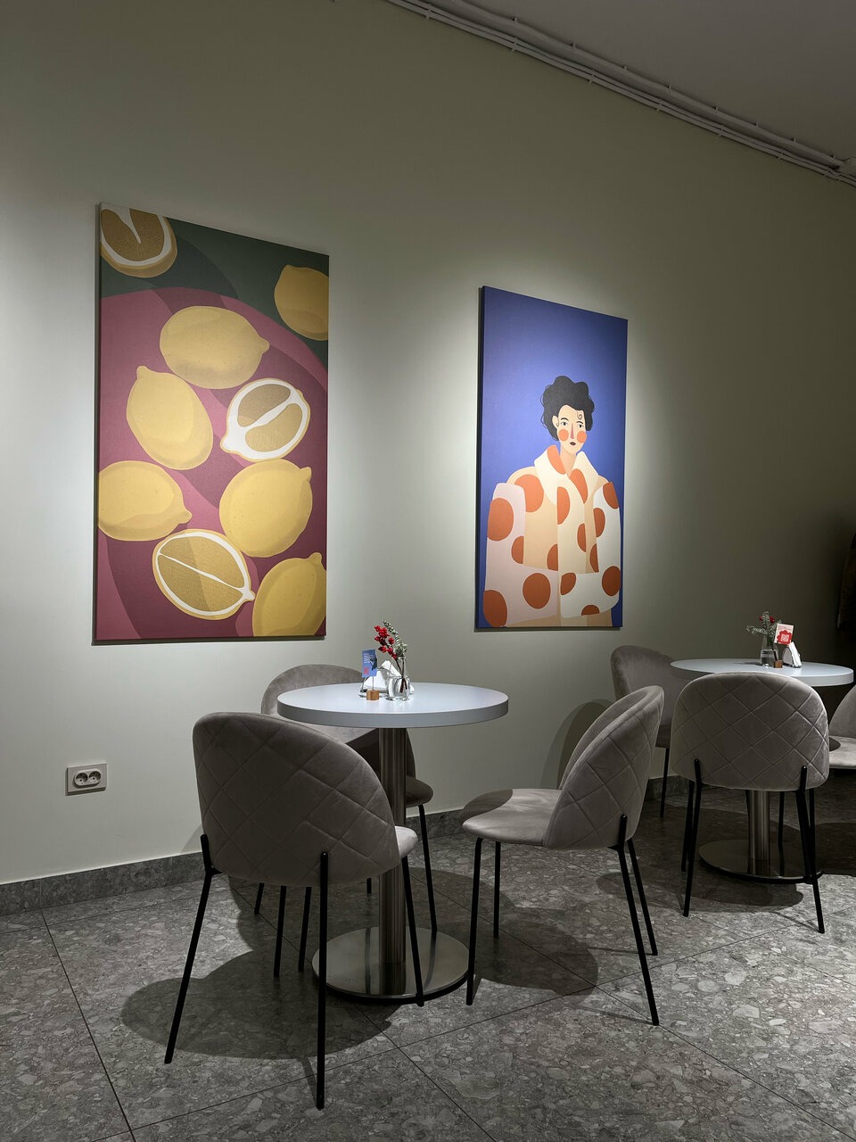 Атмосфера. Минималистический дизайн со светлыми люстрами и деревянными панелями. Разбавляют сдержанный интерьер яркие арт-хаус картины, например, с изображением лимонов.