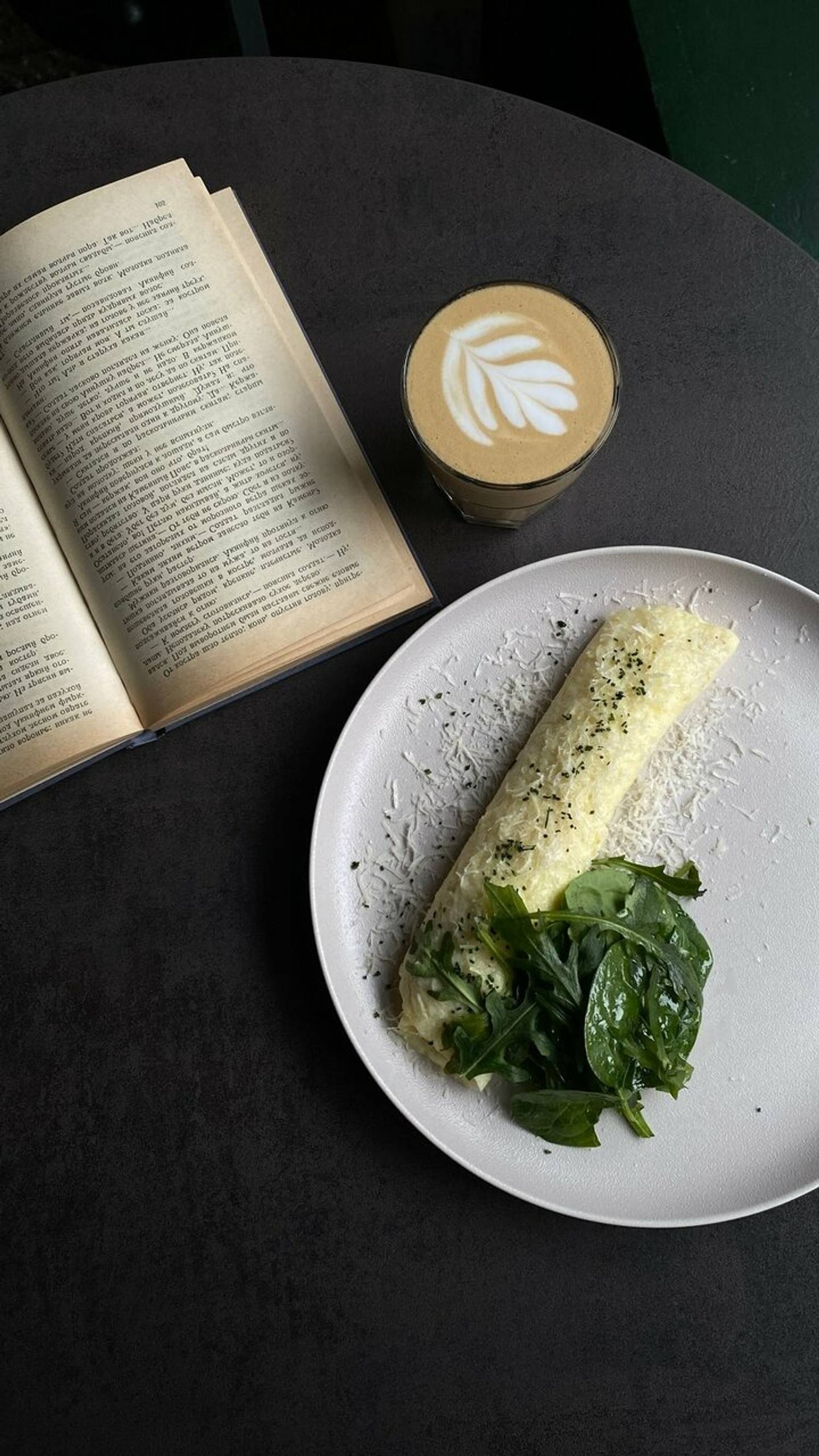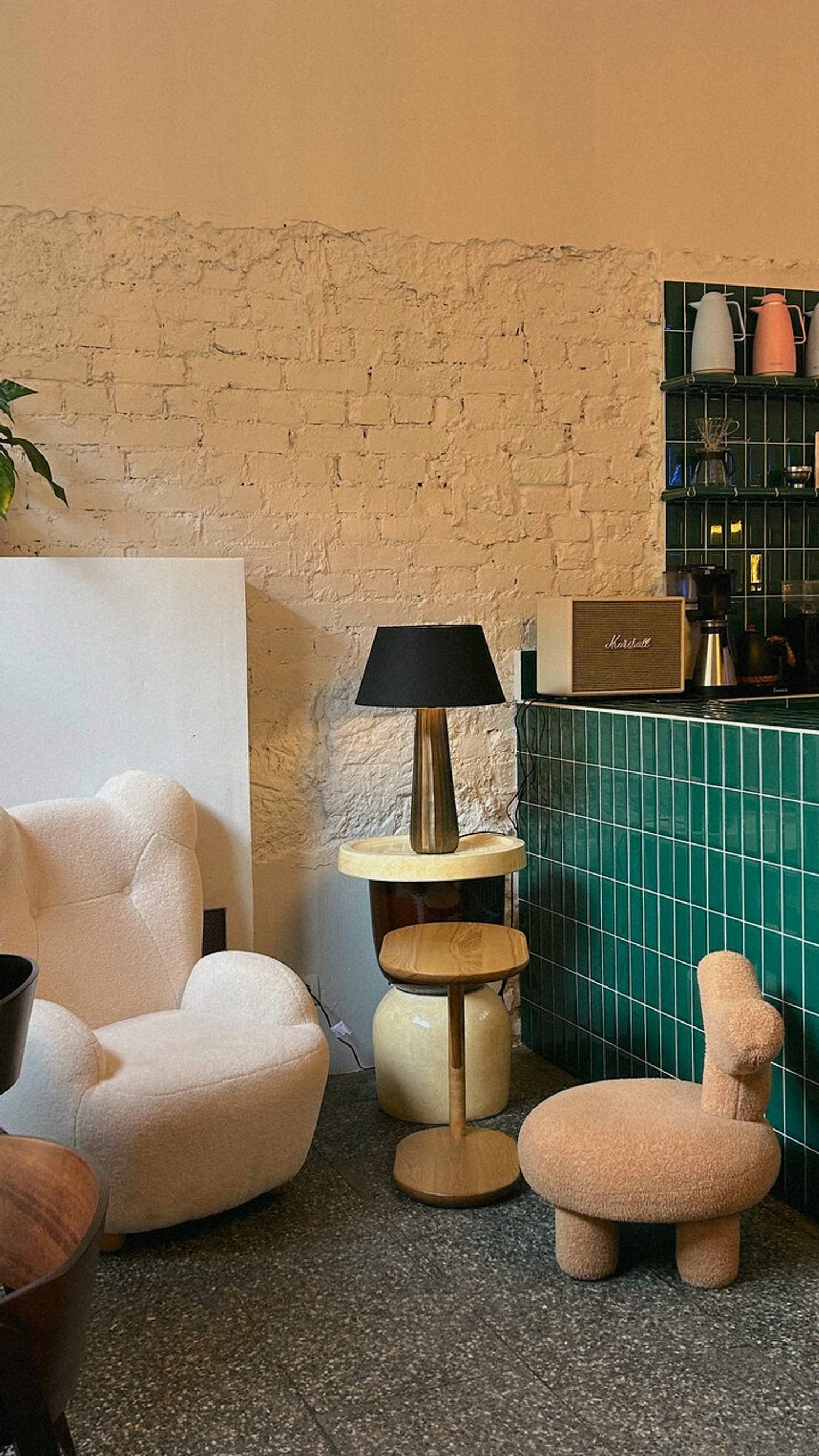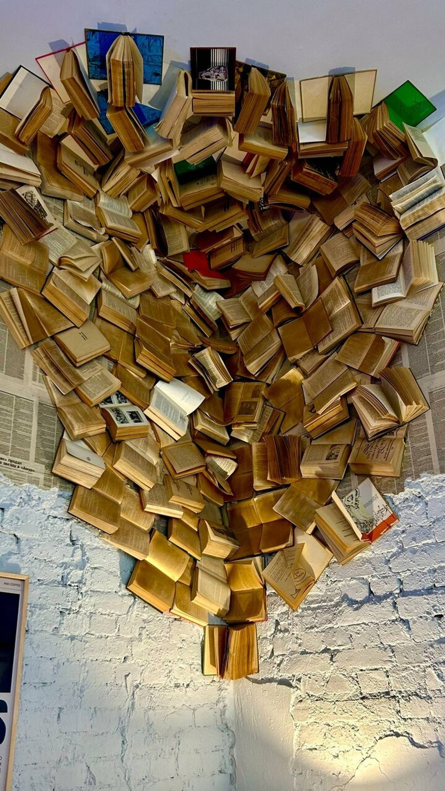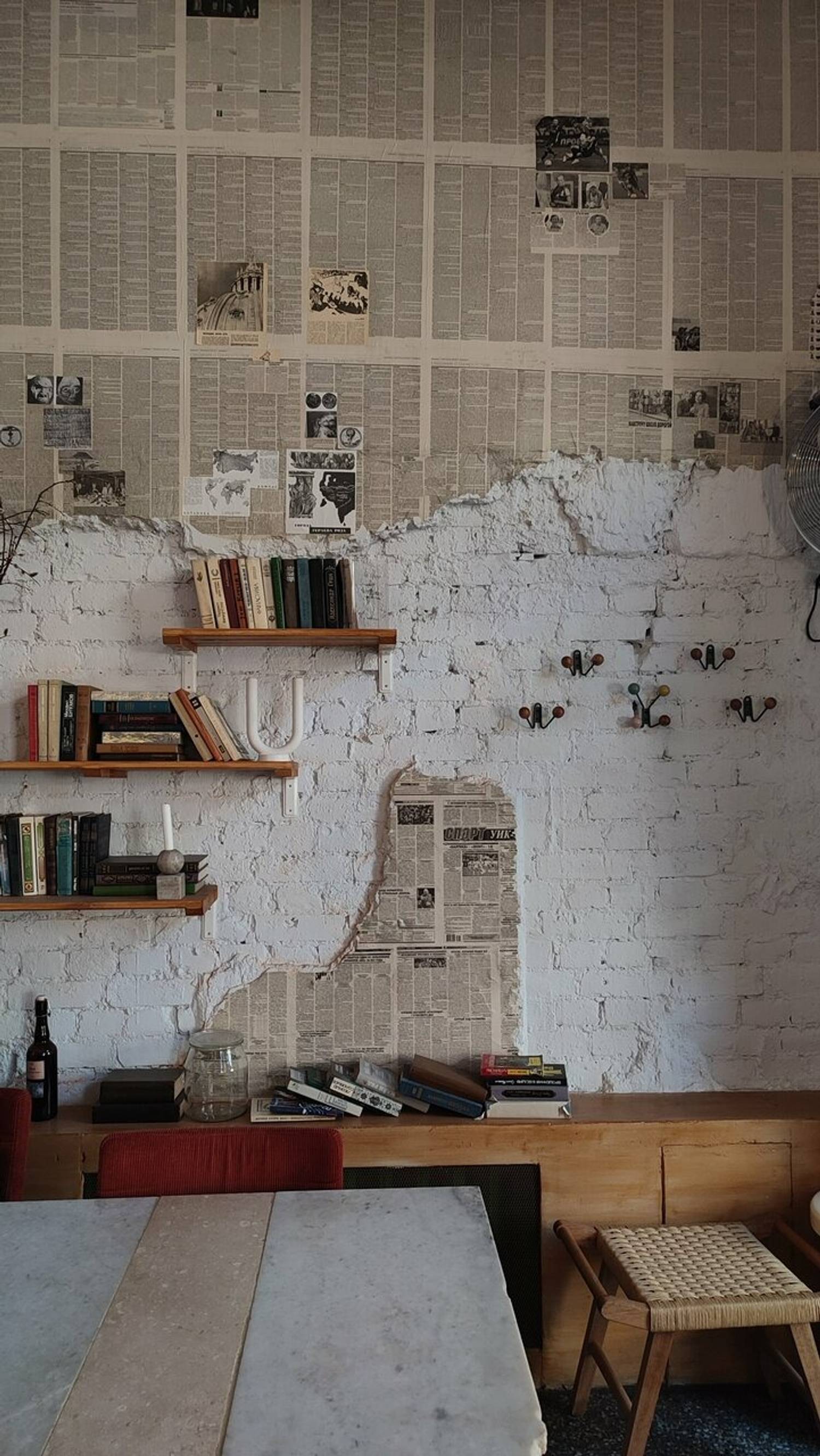 Атмосфера. Уютное пространство, напоминающее библиотеку со сладостями: инсталляция из книг в углу, подвешенные к потолку страницы и книги, полки с литературой, декор в виде газет на стенах и изящная люстра. Светлые деревянные элементы и мягкие кресла дополняют ощущение теплой домашней гостиной.