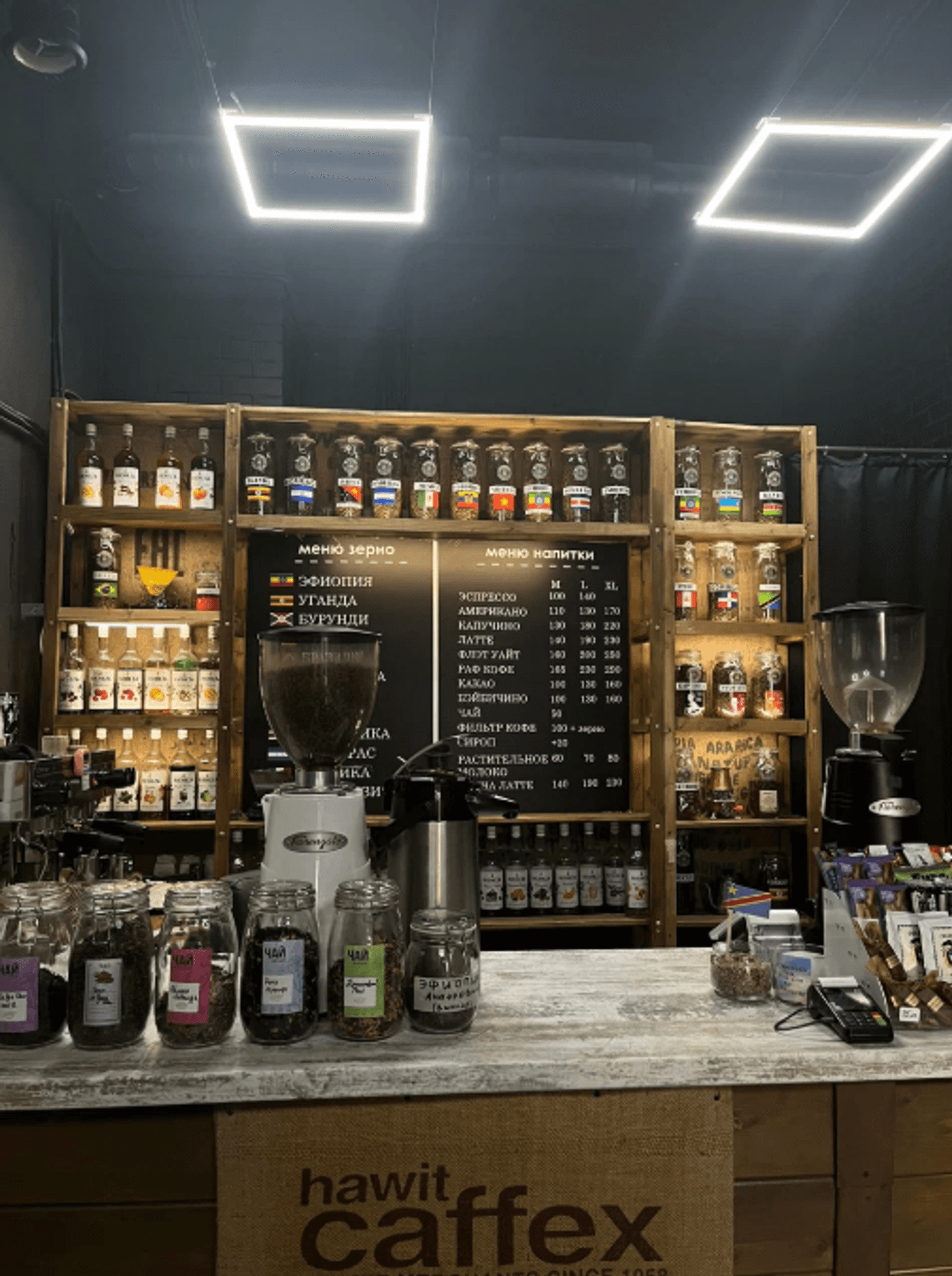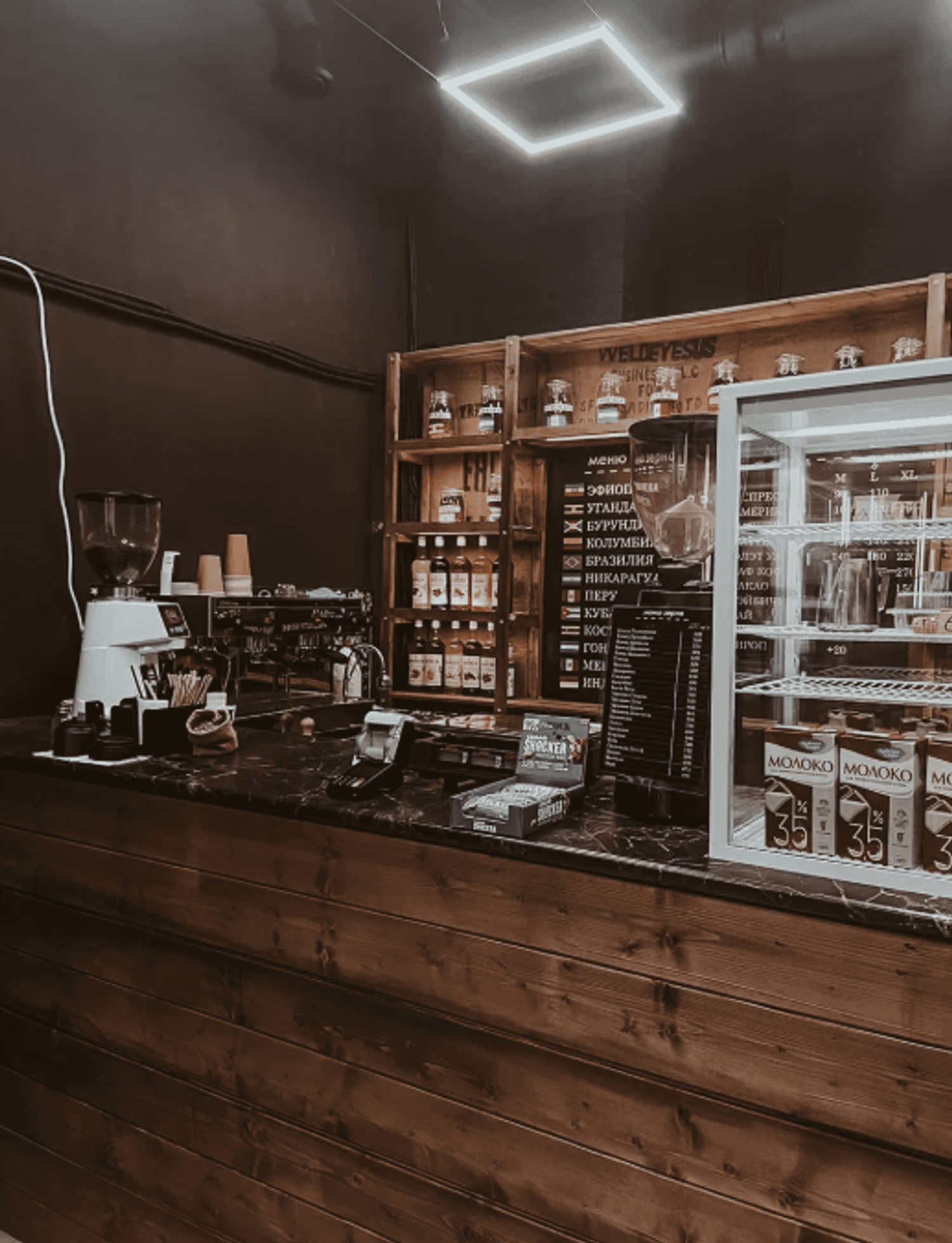 Атмосфера. Пространство с открытой зоной обжарки и минималистичным дизайном: ничего лишнего, весь акцент лишь на кофе. Дерево, металл и кирпич добавляют строгости и подчеркивают связь с процессом создания кофе, а барные стульчики и стойка располагает к тому, чтобы продегустировать сорта прямо здесь.