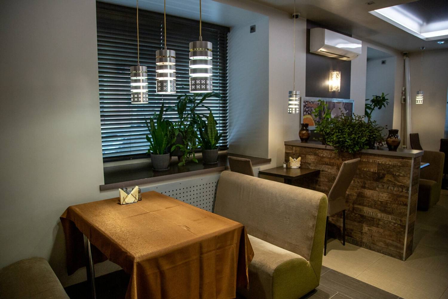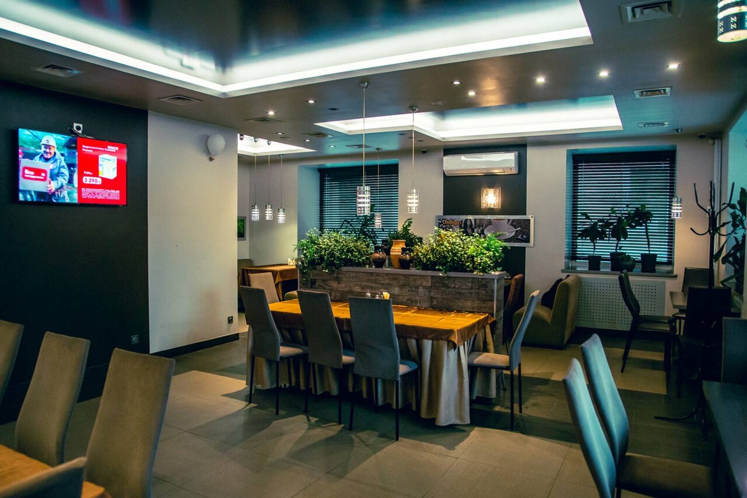 Атмосфера. Дизайн выполнен в темных и светлых оттенках кофейных цветов: темно-коричневые стулья, бежевые диваны и стены. Разбавляют официальный интерьер живые растения в кадках.
