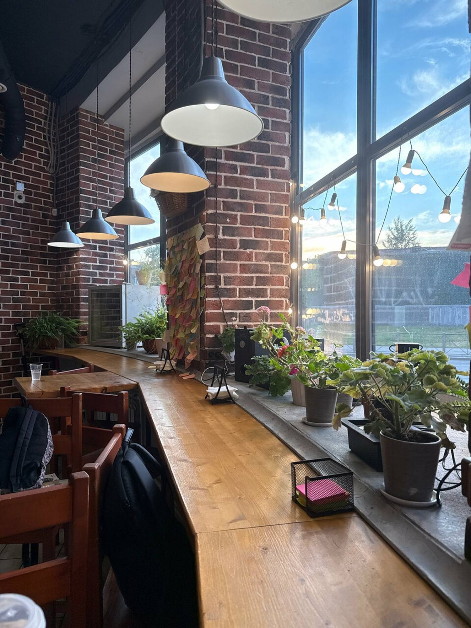 Атмосфера. В зале кирпичные стены и колонны, а также деревянная стойка заказов с растениями в кадках внутри нее. Есть длинный деревянный общий стол у окна.