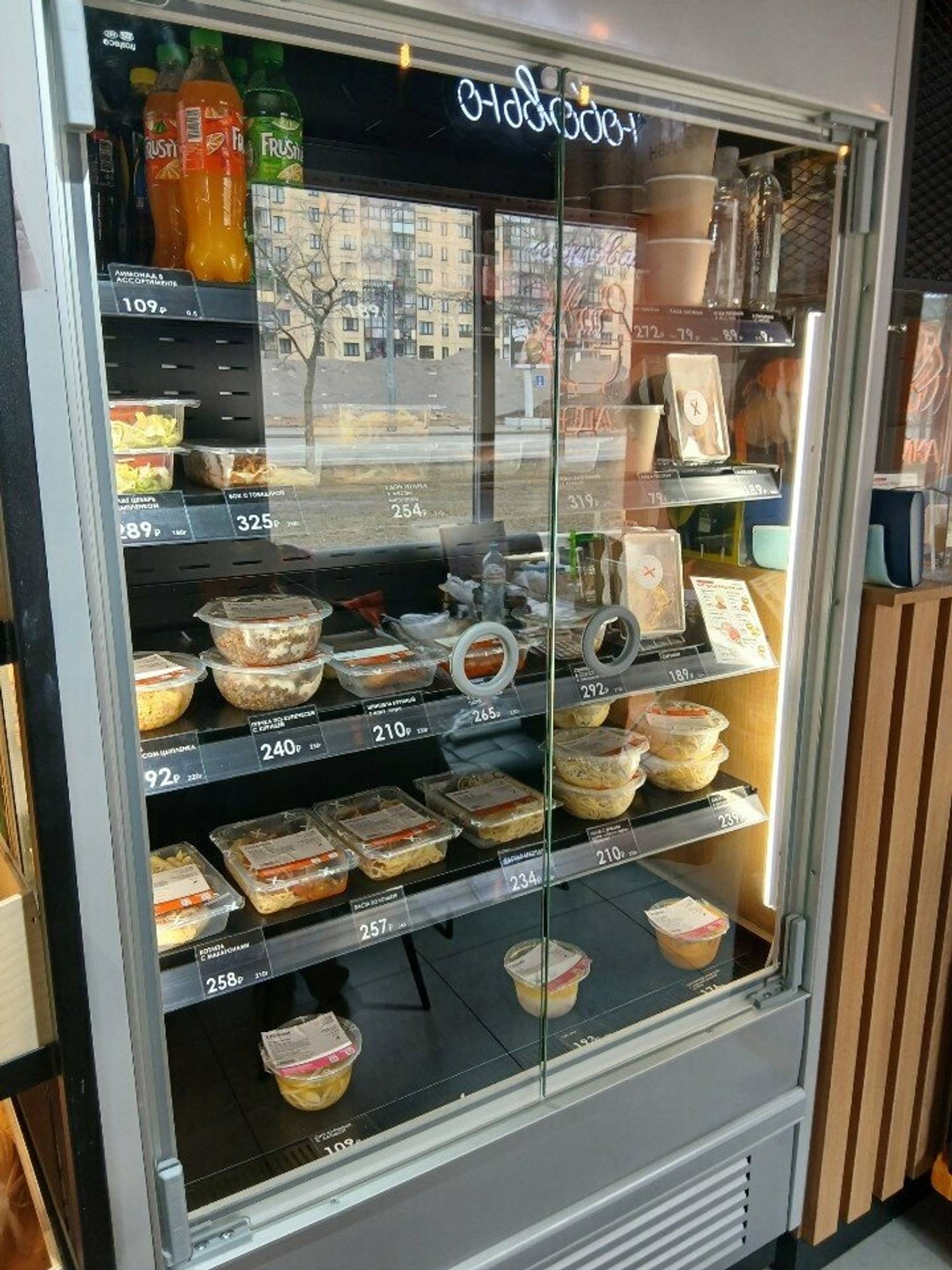 Еда и напитки. В меню классические и авторские напитки: например, сырный раф с попкорном или голубая матча черника-ваниль. Также есть свежая выпечка: от сосиски в тесте с сыром до розана с творогом и персиком. Кроме того, есть готовая еда в холодильнике: котлеты с пюре, паста, онигири с цыпленком терияки и даже роллы.