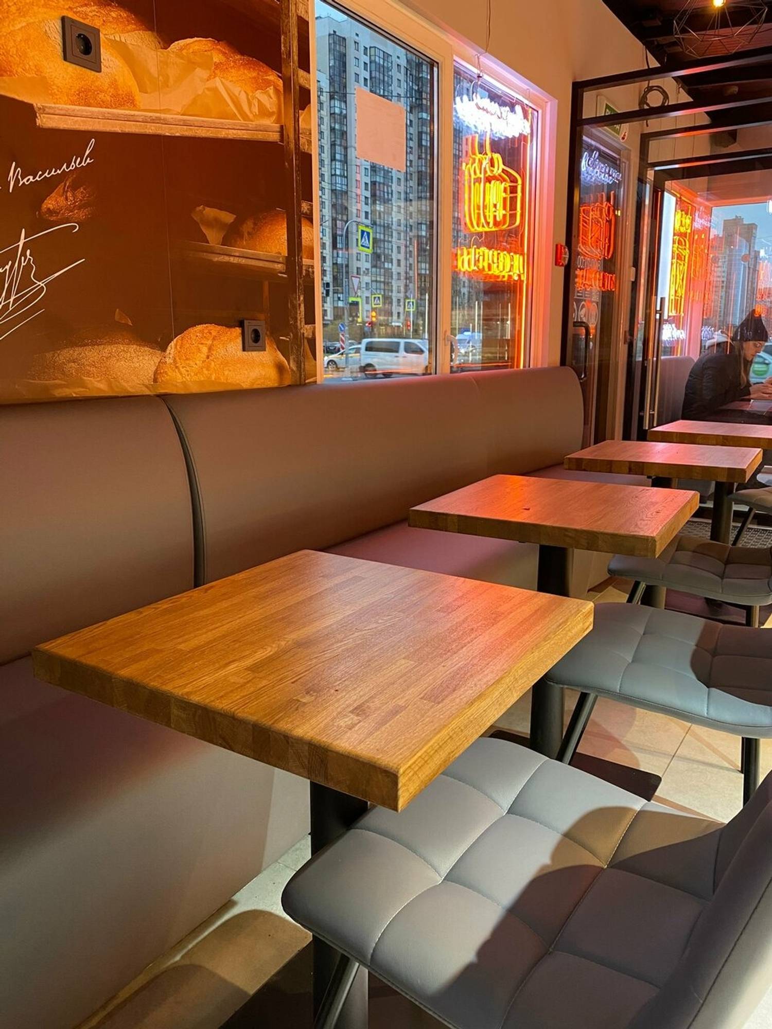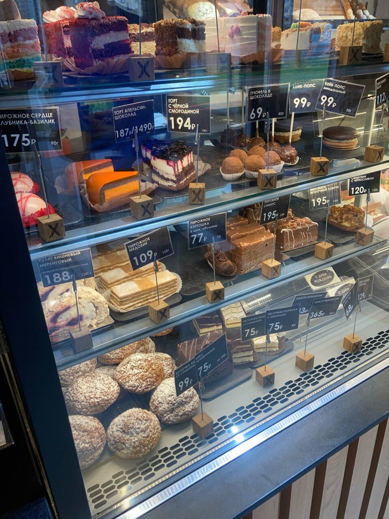 Атмосфера. Уютное пространство с деревянными столами, серыми стегаными стульями и рисунками выпечки на стенах. Есть отдельный холодильник с готовой едой, которую можно разогреть в микроволновке.
