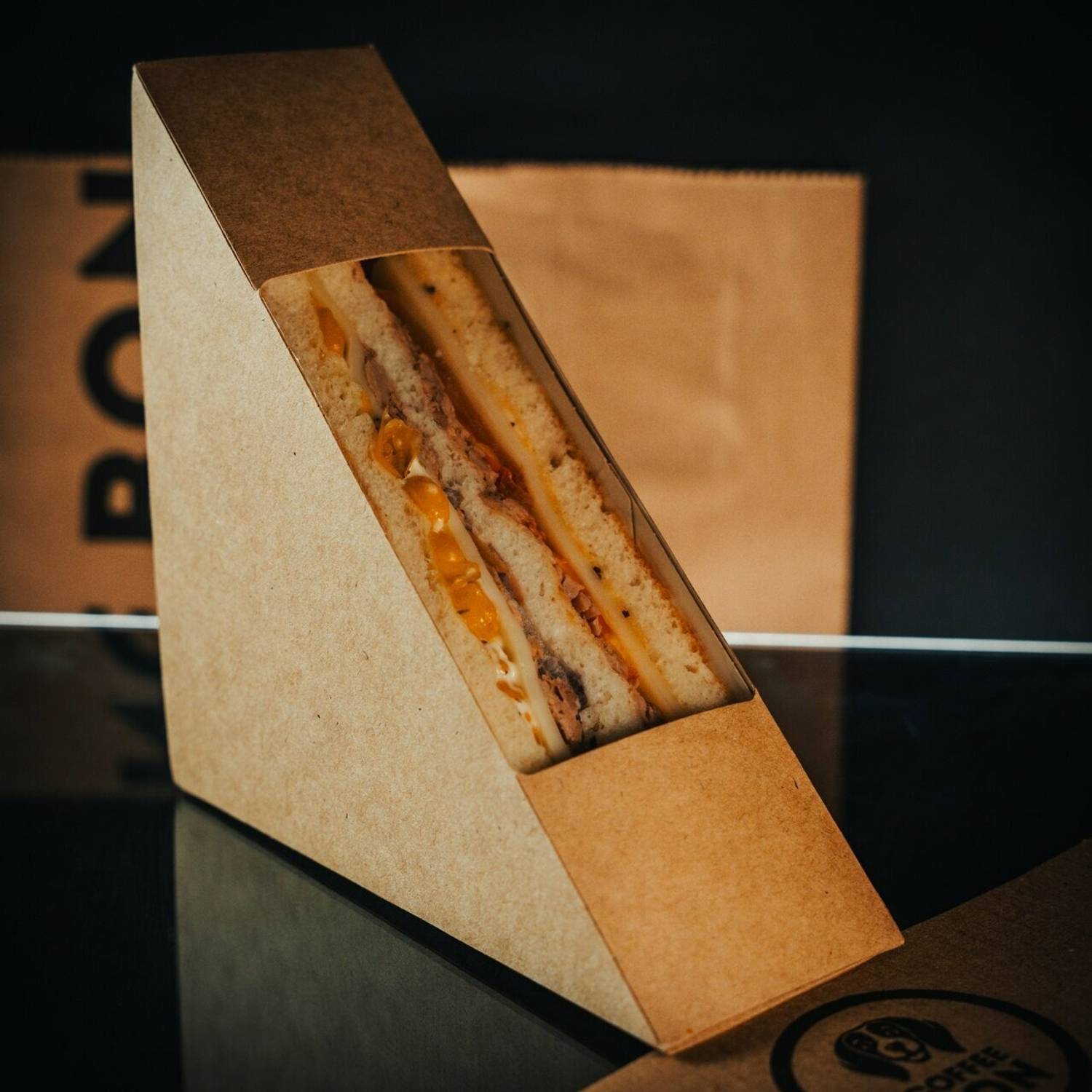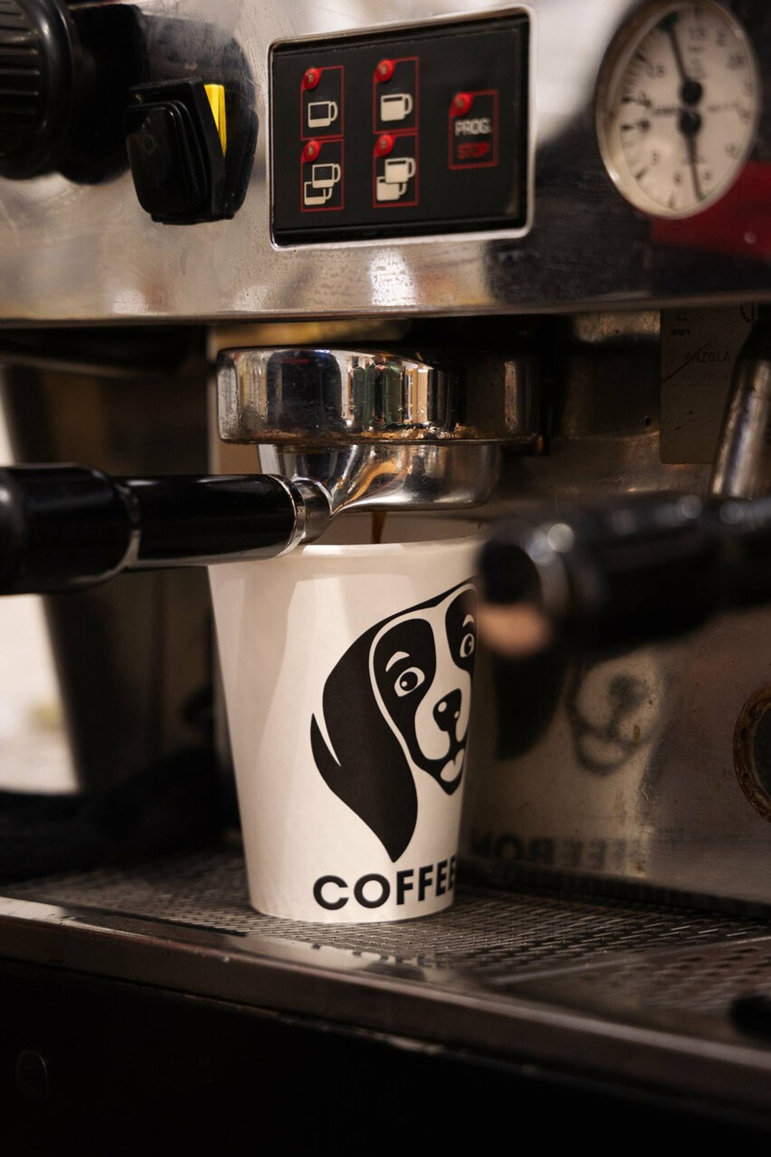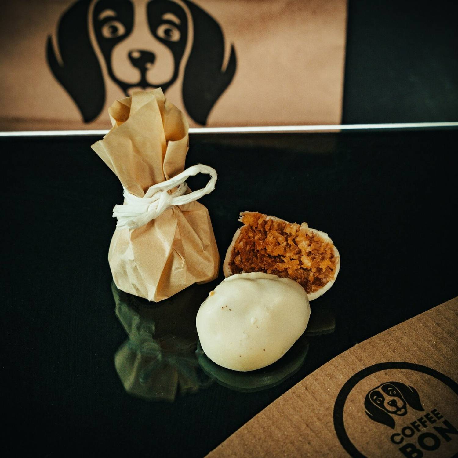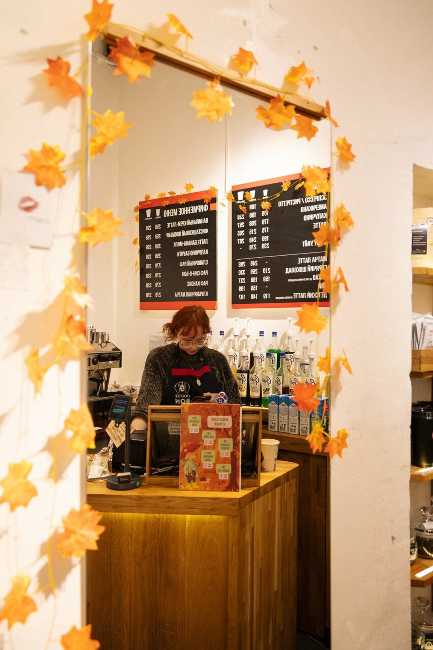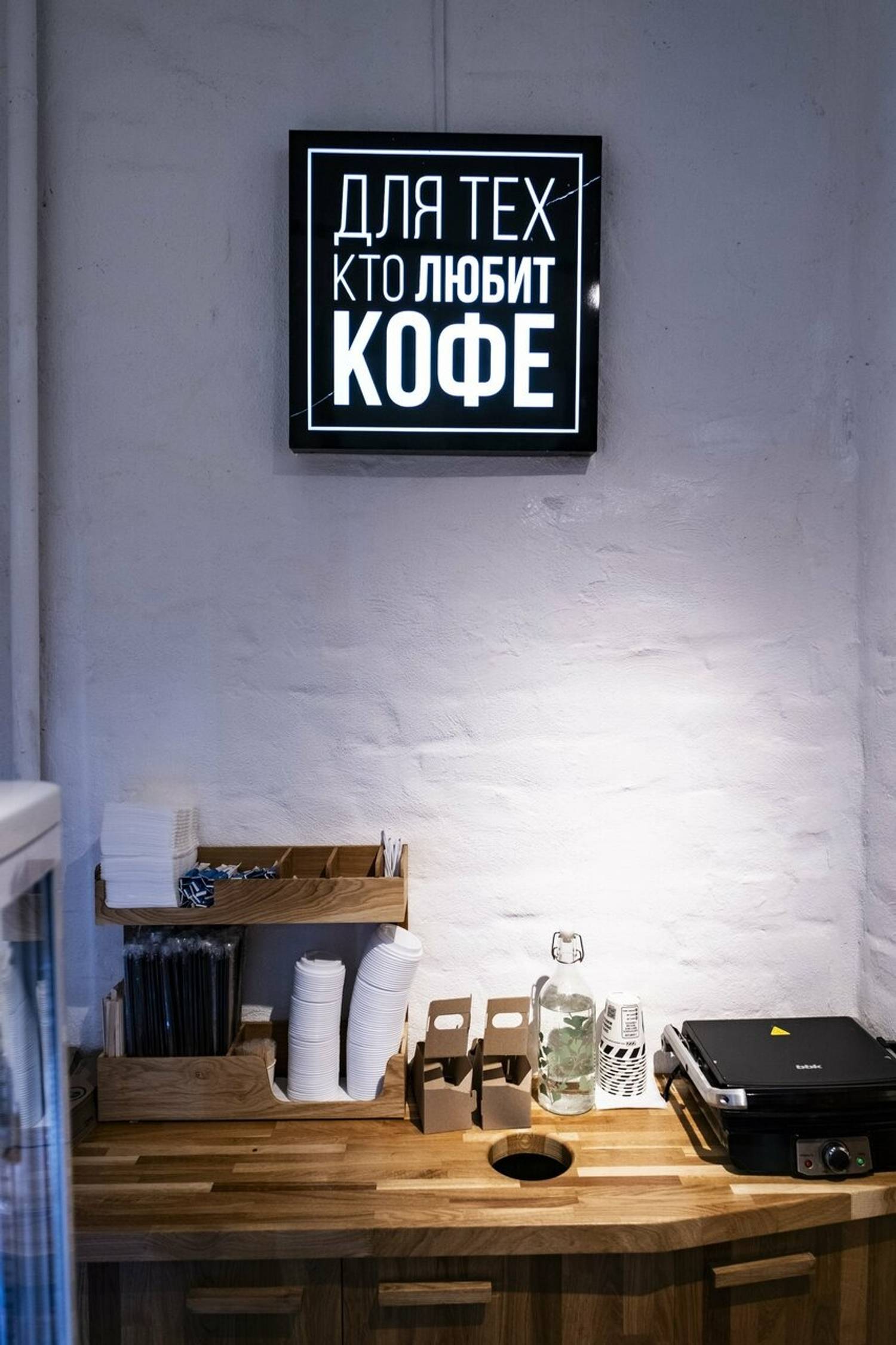 Атмосфера. Интерьер выстроен вокруг деревянной стойки с подсветкой, за которой бариста оперативно готовит напитки. На полках выставлены пачки кофе, которые подчеркивают специализацию заведения. Фирменный логотип виден сразу — он связывает точку с общей концепцией сети, сохраняя узнаваемость. Пространство компактное, но функциональное: все под рукой, ничего лишнего.